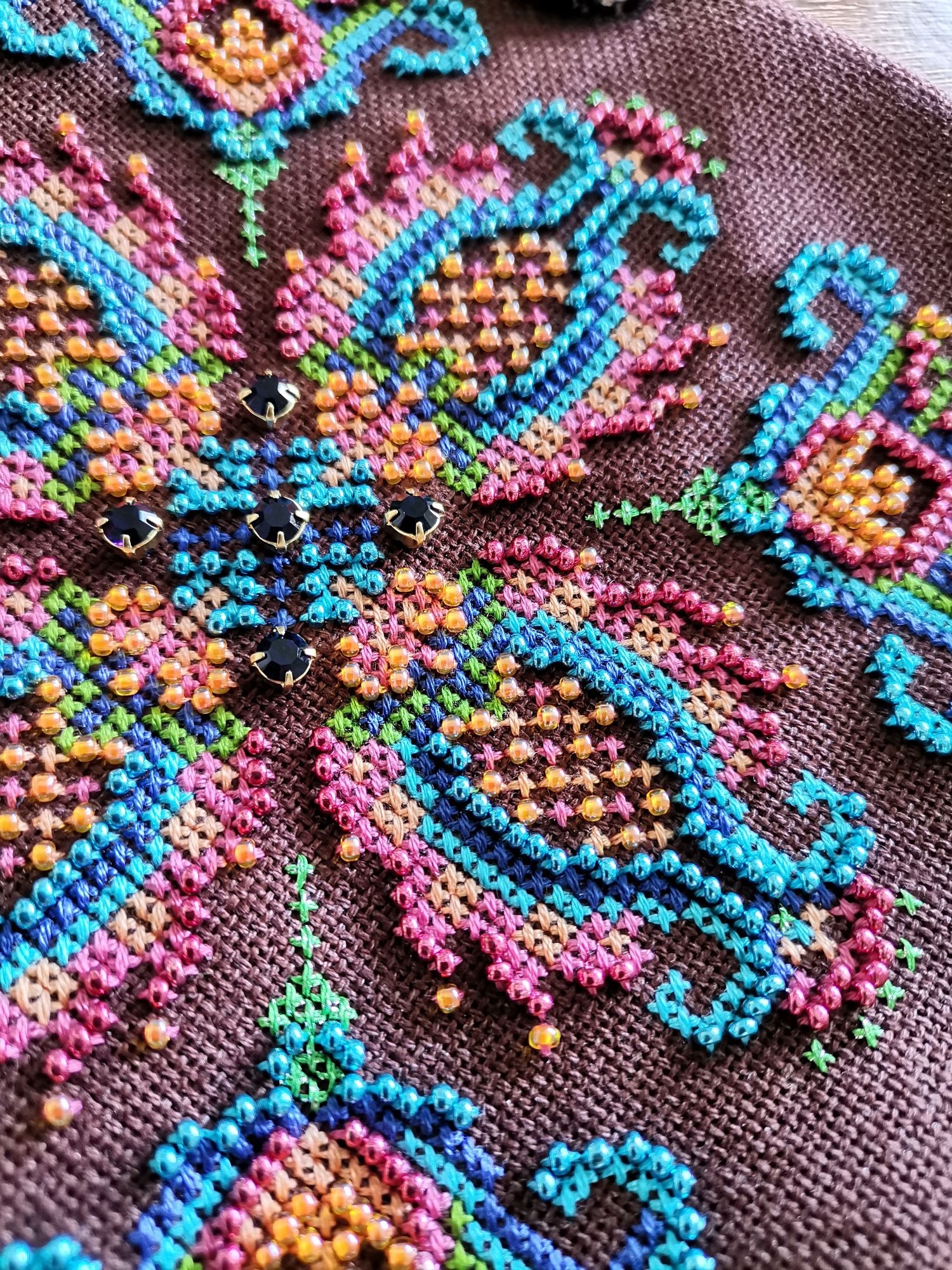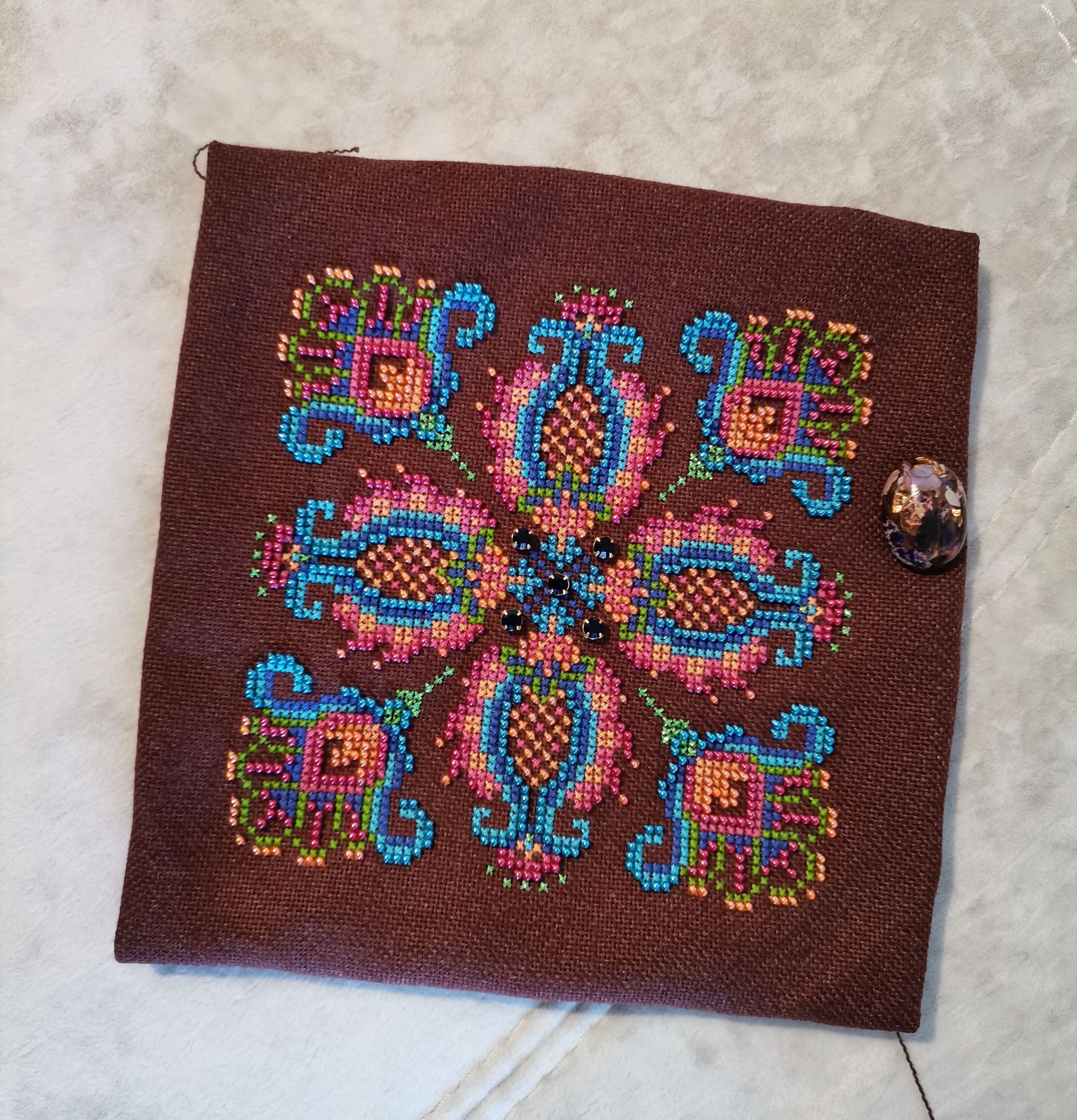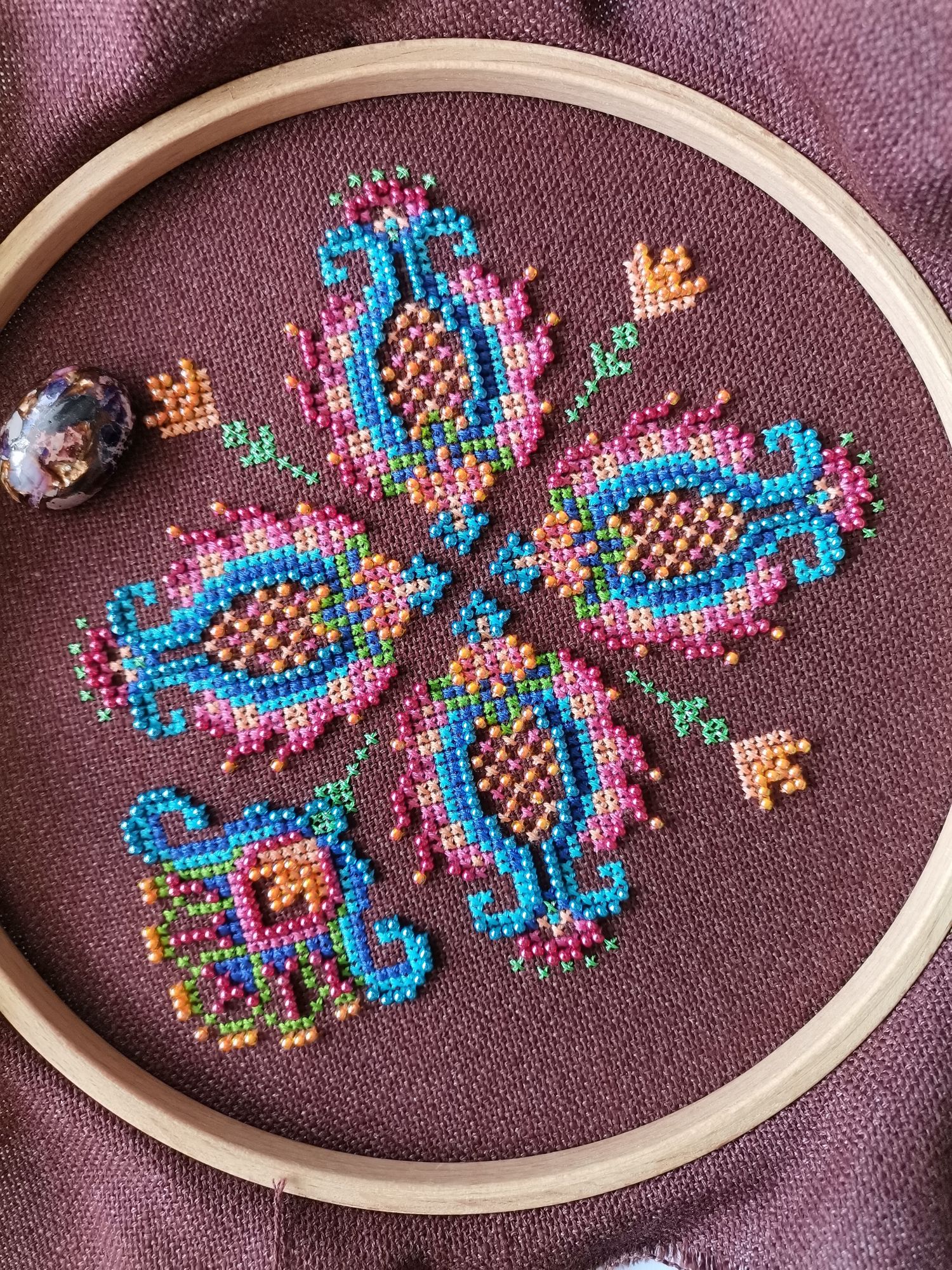 24 июня 2024 Всем доброго здравия Решила в ночи отчётик нацарапкать, а то всё было не до него да и вышивала мало. У мужа был отпуск и мы из двух недель только один день дома были, а остальные дни гуляли. Вышивала малость вечером или с утречка) И что же я продвинулаНосок от Дим точно продвинула, было/стало нахожусь в поиске алфавита и делаю бэк Вышила ещё один набор от Волшебной страны Паровоз. Осталось три набора. Правда за это время успела вступить в совместник Оксаны Ершовой Молодильные яблочки. Получила посылочку с заготовками для совместника и не только. И вышила два яблочка. Дизайны Оксаны обожаю. Один из лучших дизайнеров! Первое яблочко было синее. Вышивала подбором остатками из наборов МП Студии. Два цвета взяла мулине этуаль. Бисер по ключу. Второе яблочко оранжевое. И снова подбором. Зелёный цвет этуаль и взяла лавандовый цвет металлик. Бисер два цвета по ключу. Захотелось использовать сиреневые оттенки бисера. И у меня случился перво отшив. Схема Яркая Индия Ксении Дмитриевой. 5 цветов мулине и 3 цв бисера прициоза. Я добавила 1 цвет металлика. Вышиваю на Тренто 28 ct шоколадного цвета ниточками СХС. Бисер подбирала на свой вкус. Дизайнер одобрила. Процесс лёгкий, яркий красочный. Я когда увидела дизайн, то сразу знала на какой основе я бы вышила. Списались с дизайнером и вуаля, он у меня и я его вышиваю На сим откланиваюсь. Всем крепкого здоровья и мирного неба!!!! Маса, Bogdan, Юнона1960 и 13 других сказали спасибо Поделиться сообщением Ссылка на сообщение