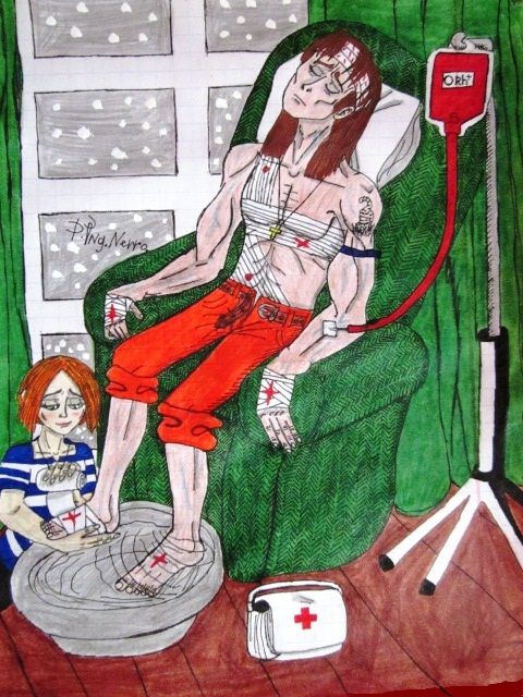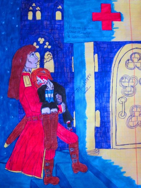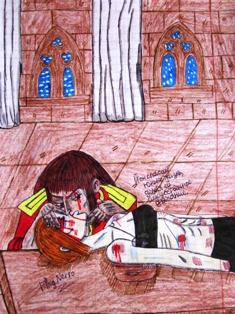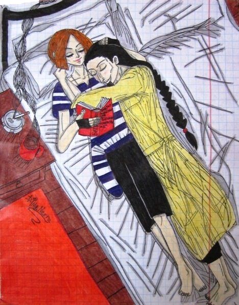 14 октября 2016 Новые иллюстрации к роману "Борцы за свободу". Коллекция иллюстраций к моему роману, которые я рисовала сама. Она снова обновилась. Я очень люблю рисовать людей на тему отцы и дети,братья и сёстры,друзья и враги, влюблённые. Юнька Нариссова и Йон Икеверис - больше всего я люблю рисовать эту пару! Я до того увлекалась рисованием, что даже не замечала как у меня накопилось ровно 281 этих рисунков. А еще мне очень нравится в рисовании сочетать между собой веселые и грустные рисунки. Ведь сама жизнь состоит из череды моментов радости и печали. 1."Йон с маленькой Юнькой". - Иллюстрация к роману Дэш Инг Нирро "Борцы за свободу" для 2 Главы. Там встречается фраза: "Красивая, как первый подснежник весной на снегу". А сама эта фраза взята вот с этого отрывка: В свете восходящего солнца Нариссова казалась Йону самым прекрасным существом на Земле. Красивая, как первый подснежник весной на снегу. Рисунок выполнен на тетрадном листе чернилами и цветными карандашами. А занавеска на окне нарисована с помощью корректирующей белой жидкости. 2."Марк с маленькой Ритой". - Иллюстрация к роману Дэш Инг Нирро "Борцы за свободу". Марк сидит в кресле у камина с маленькой Ритой на руках. Рисунок выполнен на тетрадном листе в клеточку цветными карандашами и чернилами. 3."Нам друг с другом повезло". - Иллюстрация к роману «Борцы за свободу». Да, все верно. Рисунок так и называется «Нам друг с другом повезло». На нем изображены Юнька и Северьян, которые отдыхают вместе после работы. Лежа на кровати Юнька Нариссова читает книгу Виктора Поротникова «Батыево нашествие», а Северьян заснул в обнимку со своей возлюбленной. На рисунке еще видно как дым от сигареты и пар от чашки с горячим кофе переплелись в одну струю дыма. Это намек на то, как порой тесно переплетаются судьбы двух людей, которые любят друг друга. Кстати говоря, книга Виктора Поротникова «Батыево нашествие. Повесть о погибели Русской земли» вышла в свет только в 2011 году, а события в романе Дэш Инг Нирро «Борцы за свободу» происходили в 2007 году. Так что, пожалуй, слишком рано для Юньки было читать такую книгу. Но мне хотелось, чтобы она читала что-нибудь о вторжении татар на Русскую землю. Рисунок выполнен на тетрадном листе черными, синими, красными чернилами и цветными карандашами. 4."Юнька красит губы красной помадой". - Иллюстрация к роману Дэш Инг Нирро "Борцы за свободу". На рисунке изображена Юнька Нариссова, которая стоит перед зеркалом и красит губы. Рисунок выполнен цветными карандашами, черными и красными чернилами. 5. "Рита красит губы розовой помадой". - Иллюстрация к роману Дэш Инг Нирро "Борцы за свободу". На рисунке изображена Рита Искаева, которая стоит перед зеркалом и красит губы. Рисунок выполнен цветными карандашами и черными чернилами. 6."Перекур на крыше". - Иллюстрация к роману Дэш Инг Нирро «Борцы за свободу». На рисунке изображен эпизод из Главы 4, где Юнька курит на крыше. Вот выдержка из романа, где встречается этот эпизод: « Курить Нариссова начала совсем недавно не ради какой-то там моды, а потому что для нее это был лишь способ отдохнуть чуток от работы. Сидит она такая вся в саже на крыше, вычищенная труба дымит ею, и она следом дымит своей сигареткой ». Рисунок выполнен на тетрадном листе цветными карандашами, чернилами красного и синего цвета. Снег нарисован с помощью корректирующей жид