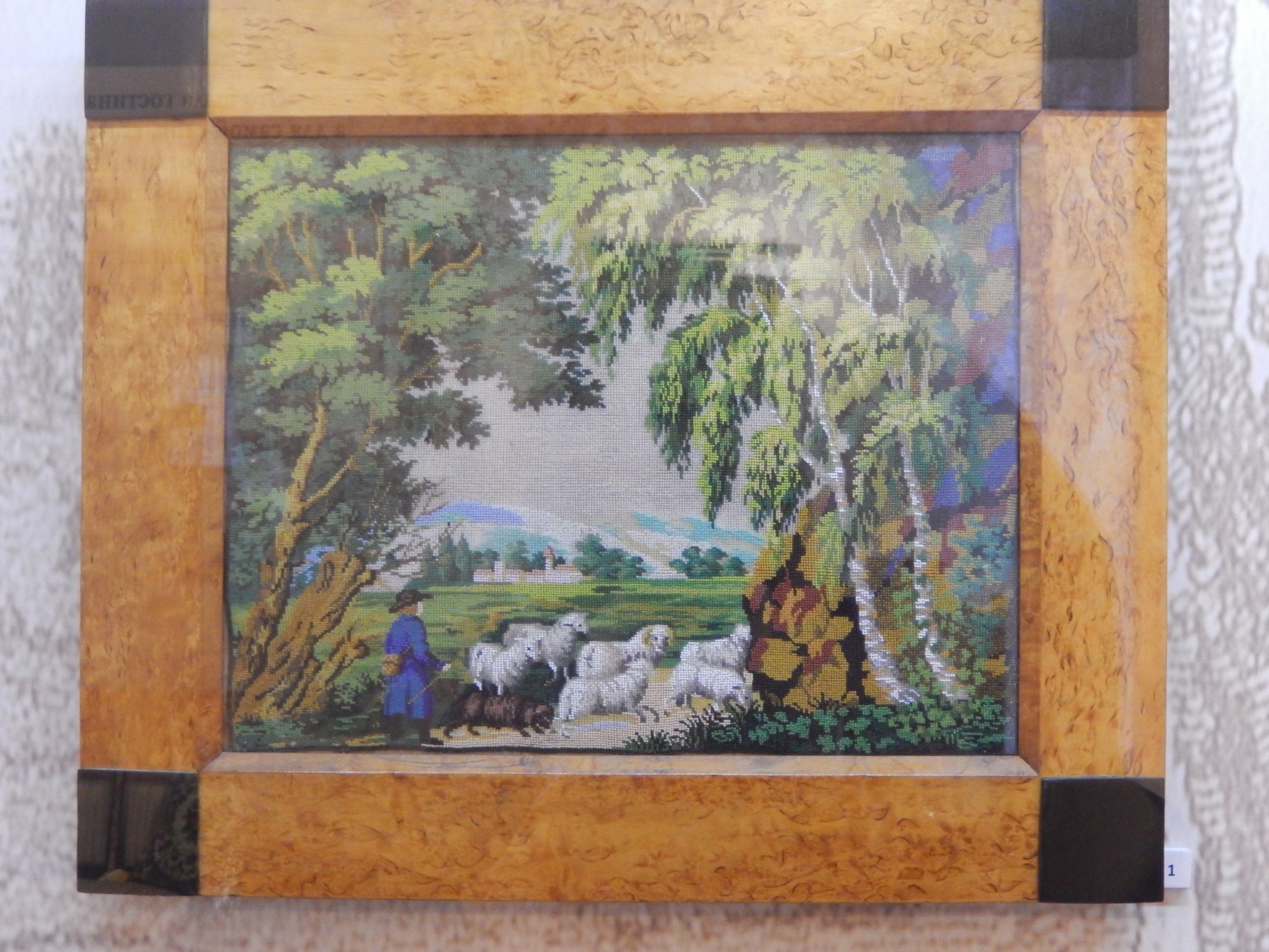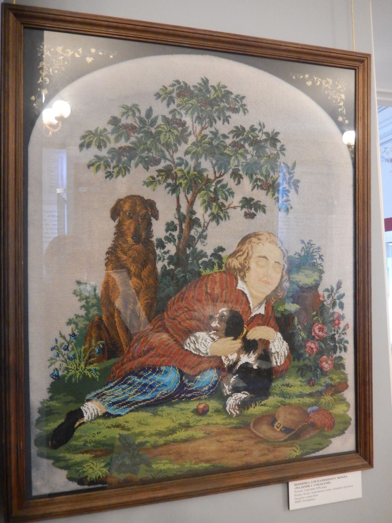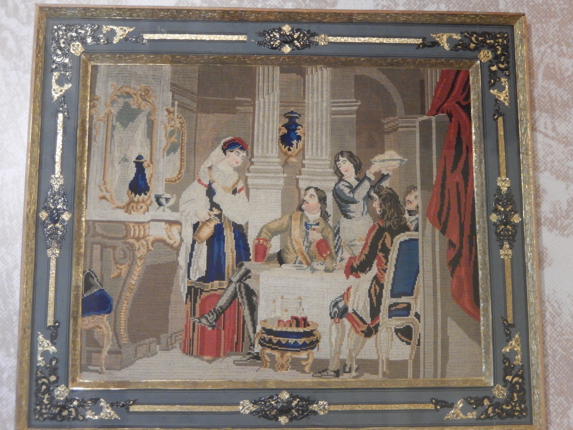 8 августа 2016 Доброго вечера всем. Хочу продолжить рассказ о выставке "Усадебное рукоделие" в Люблино. Экскурсия № 2 будет посвящена самому привычному для нас виду вышивки - вышивке шерстяными и шелковыми нитками. Подобных изделий до нашего времени дошло не очень много. В основном, нитками вышивали прикладные работы - экраны для каминов, ковры, туфли, подушки и. т.д. Повседневное же использование и долгое хранение не способствуют хорошей сохранности вышивок. Тем не менее, на выставке были представлены несколько работ, вышитых шерстью. Шерстяные нитки были почти в 2 раза дороже хлопковых и тоже были доступны не всем. Их привозили из Англии, Германии и иногда аж из Персии. Даже не каждая дворянка могла себе позволить купить для работы шерстяные нитки, и на схеме для вышивания обычно указывалась стоимость различных материалов для выполнения узора. Но вернемся в уютную гостиную. Там есть на что посмотреть. На диване лежат шикарные подушки, вышитые шерстью и бисером. Немного выцвели, но бисер по-прежнему блестит а узор очаровывает. Еще тут можно увидеть каминные экраны вот : (поближе), вот и вот . Последний не закончен, но птичка классная! На столике для рукоделия расположился альбом. По-моему, это тоже вышивка шерстью по перфорированной бумаге . А вот не совсем прикладная вышивка. Знакомый нам формат. Картина, где-то 40х60 см., живописующая знакомство Петра 1 с Мартой Скавронской. ( И такая версия имеет место быть). Вот еще картина "Арапчонок с собаками". Изначально была вышита для каминного экрана, но по прихоти судьбы угодила в рамку. (Крестики очень маленькие). ну а это уже произведение крепостных мастериц. Вышитый ковер . Состоит из нескольких фрагментов, сшитых между собой. Поближе (извините, стекло!!) Такие ковры производились обычно в помещичьих мастерских специально обученными крепостными девушками. Они вышивали также обивку для мебели и обои?!!! Кстати об обивке. Возле прелестного круглого столика для рукоделия стояли два кресла, категорически не желавших фотографироваться. Эти кресла парные, их сиденья украшены вышивкой. На одном в античной манере изображен турок, а на другом - грек. Покажу только одного из них, т.к. второй не получился. Ну и еще немного заготовок для каминных экранов , , . Сюжеты очень симпатичные. Может у кого-нибудь есть альбомчик со старинными схемами? мне очень надо....... И напоследок. Гигантская работа ( где-то 70х70), в основном выполненная бисером. Тоже заготовка для каминного экрана Вышит мальчик бисером, за исключением лица и рук. Они выполнены малюсенькими шерстяными крестиками, гораздо меньше бисерин. Очень кропотливая работа. На сегодня это все. Спасибо всем, героически прочитавшим до конца мой опус, за внимание. Melawen, Наталья_Цветочек, PolliPo и 36 других сказали спасибо Поделиться сообщением Ссылка на сообщение