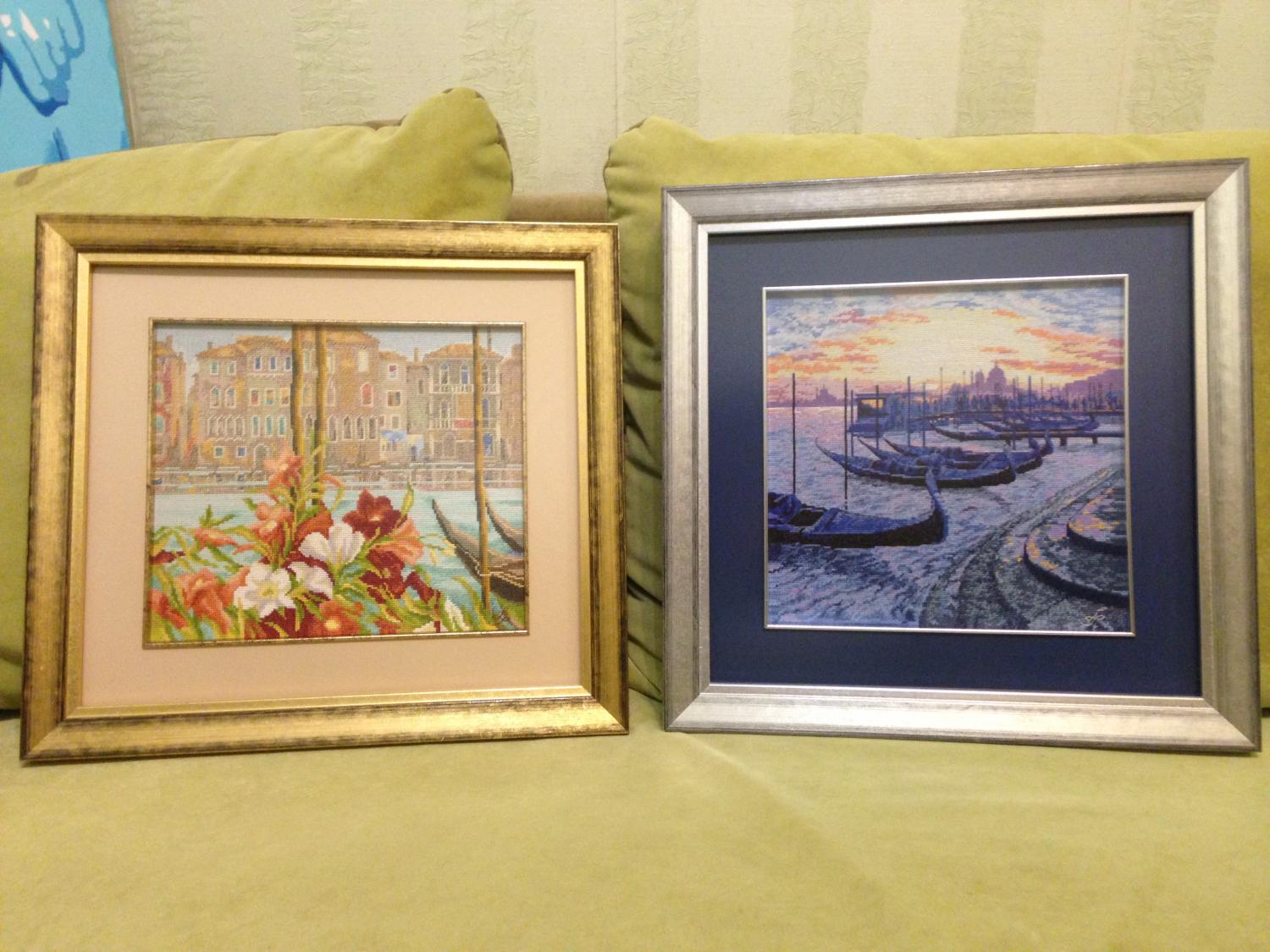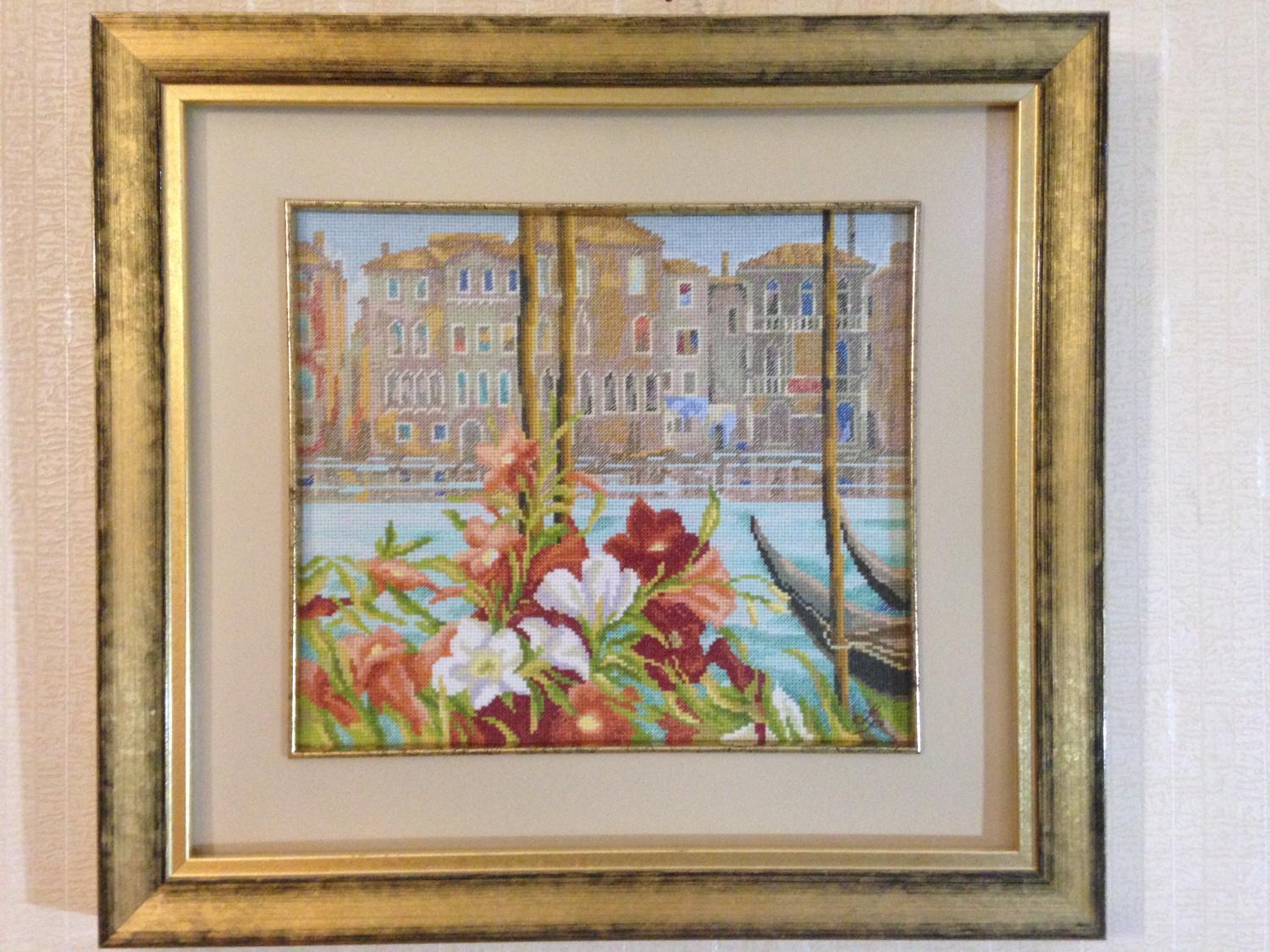 Сегодня я принесла вам показать оформленную весеннюю Венецию. Я уже говорила, что она вышита в подружки к Сан-Захарии, поэтому и оформлялась в таком же стиле. Багеты одинаковые, только цвета разные, так же и паспарту, и слип.