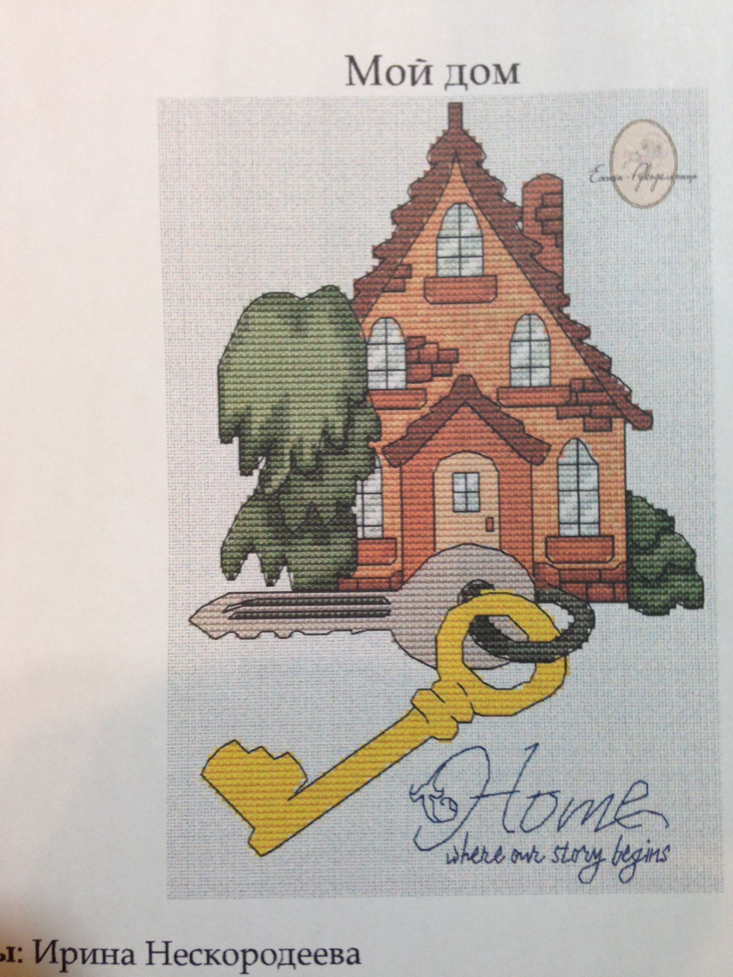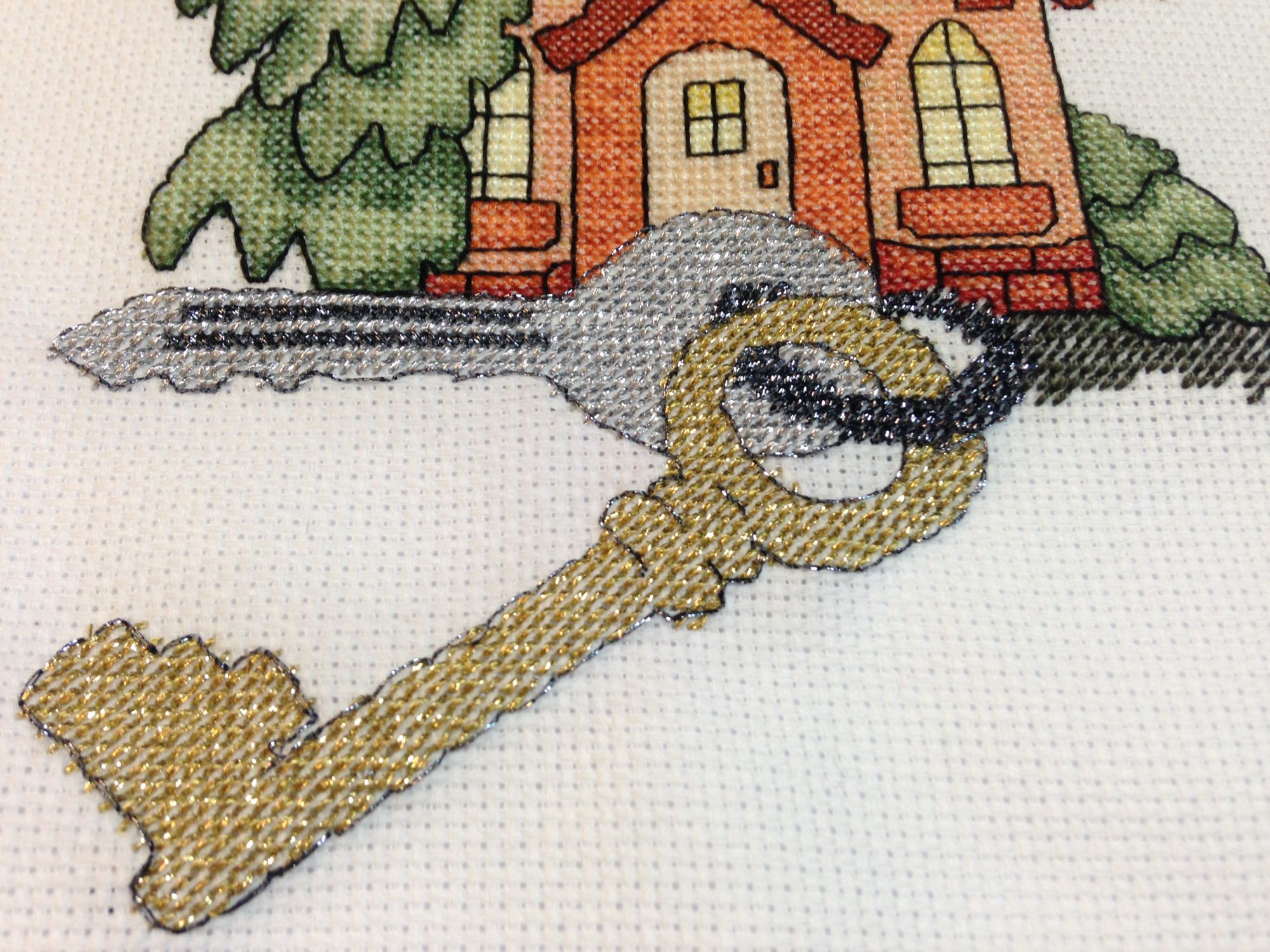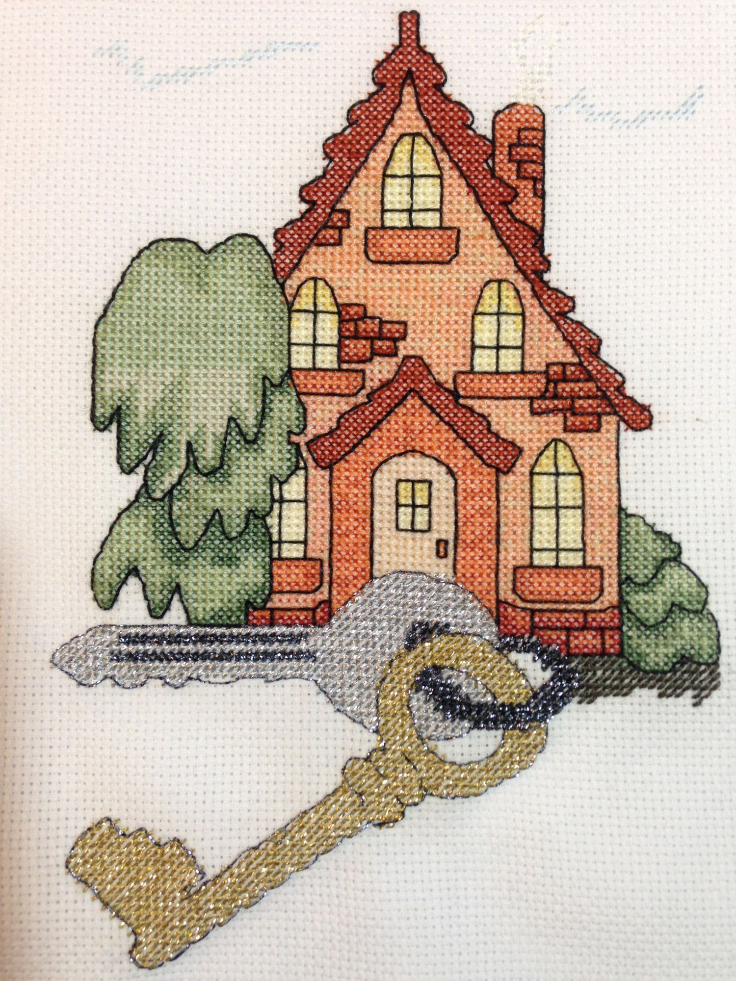 По схеме Ирины Нескородеевой. Слегка изменила ниточки в ключах на золотой и серебряный крейник. Немного подсыпала под домик земли и над домиком добавила облака, дым из дымохода и включила свет в окнах. Впервые вышивала такую малютку. Это удивительно кайфово!