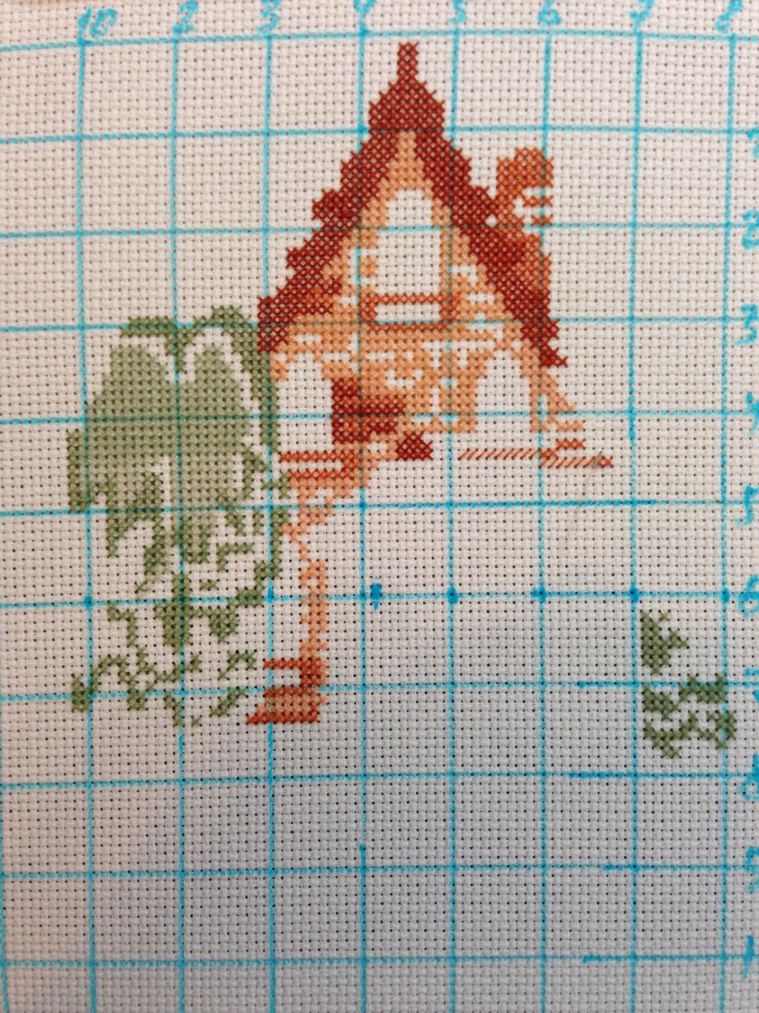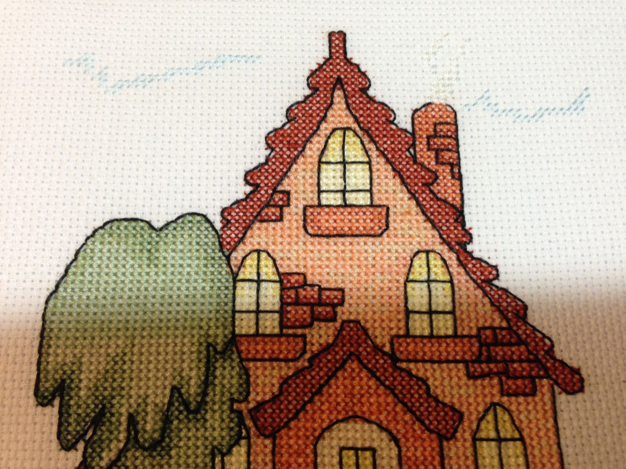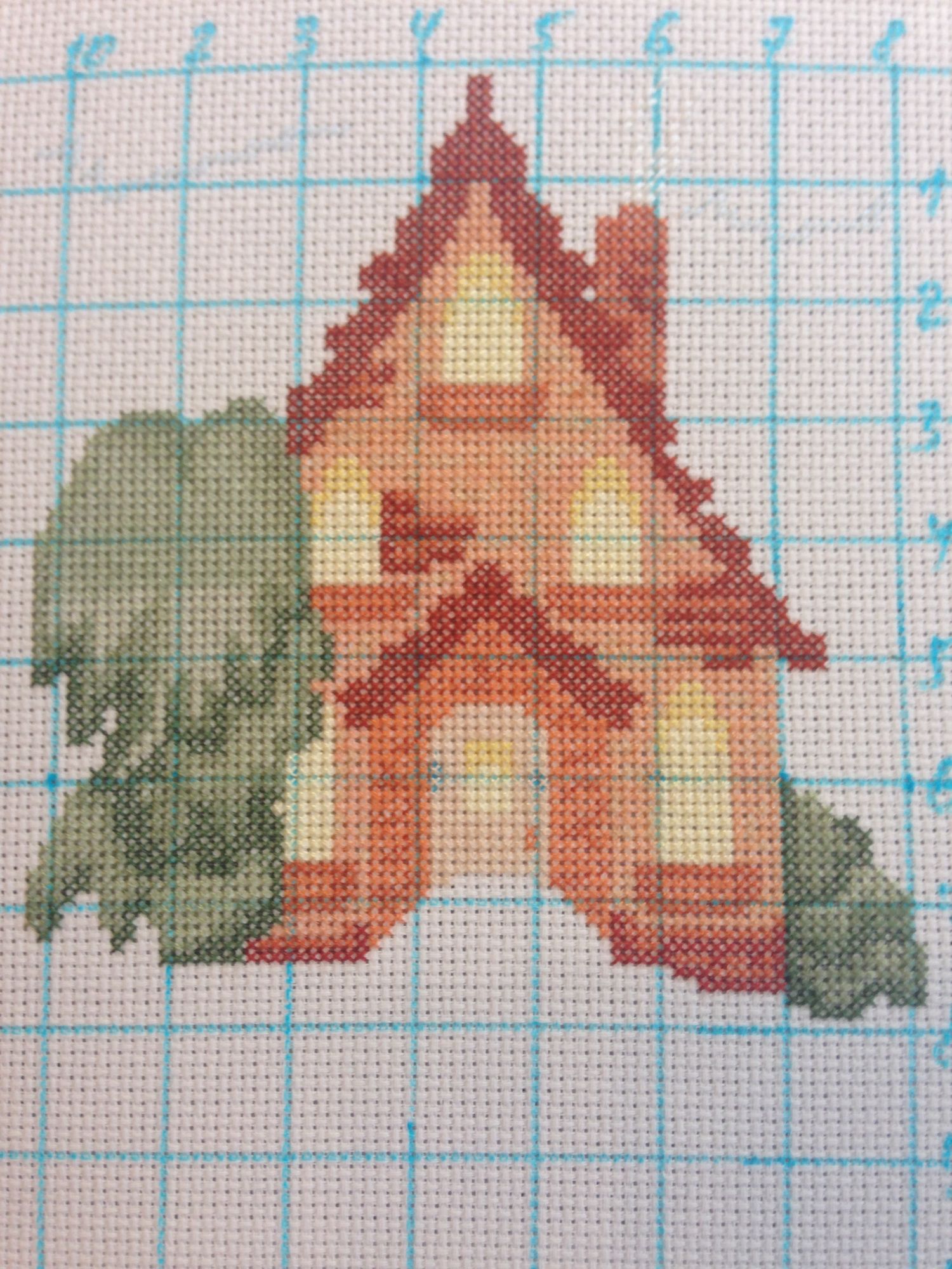 Немного подсыпала под домик земли и над домиком добавила облака, дым из дымохода и включила свет в окнах. Впервые вышивала такую малютку.