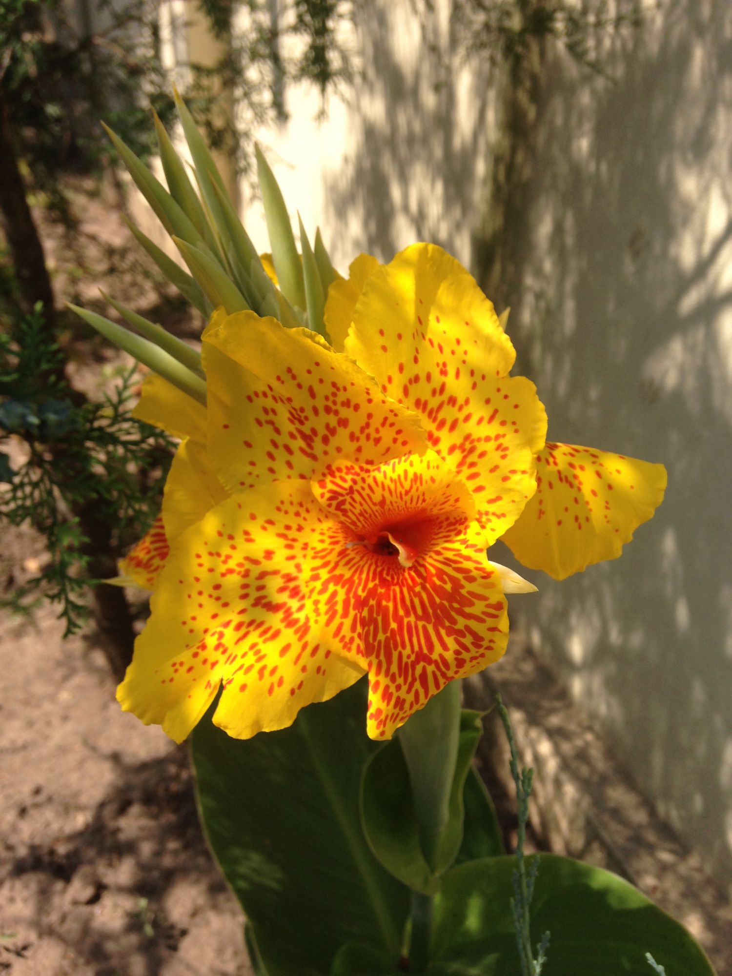 У нас жара неимоверная. На розочки просто жалко смотреть. Но вот в тени кипариса расцвела такая красотка- желтая кана, по-моему. Но может и ошибаюсь.
