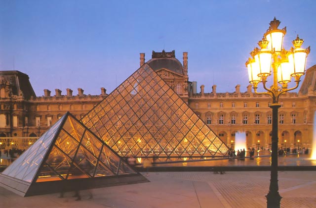 Первыми появились уличные фонари перед Пирамидой Лувра во дворе Наполеона. Она служит главным входом в Лувр и является одним из символов Парижа