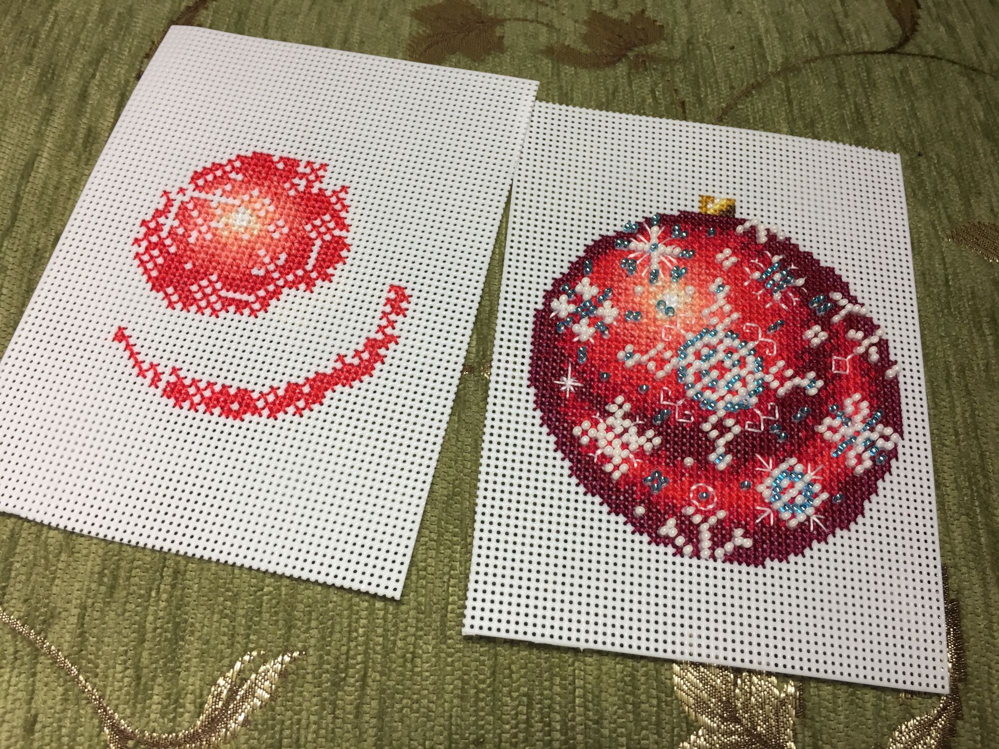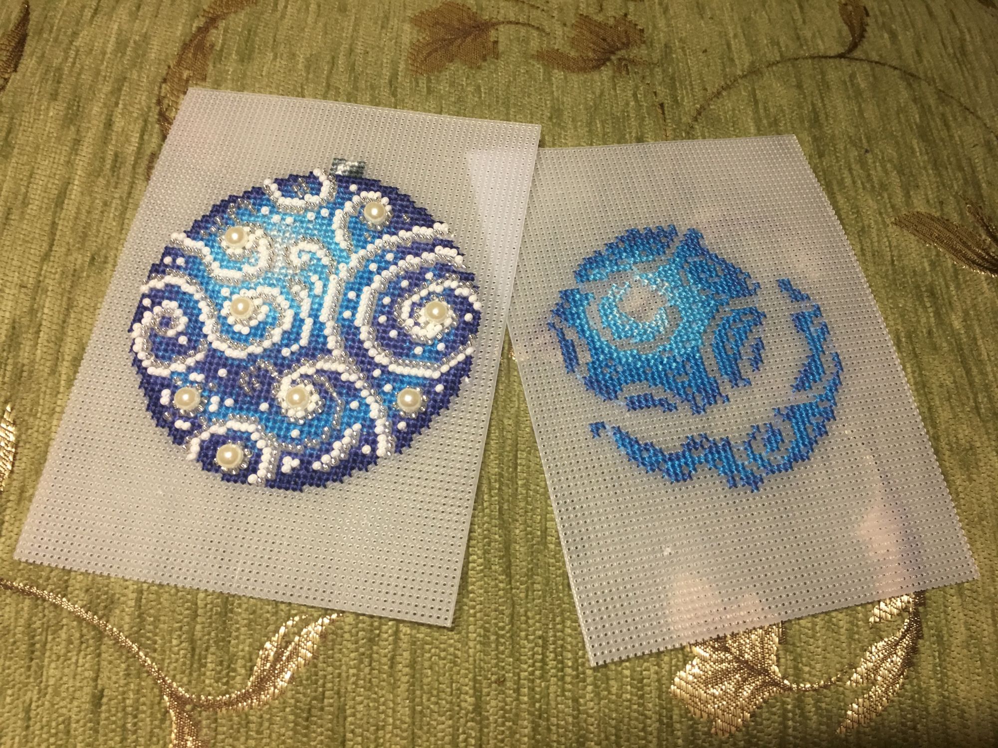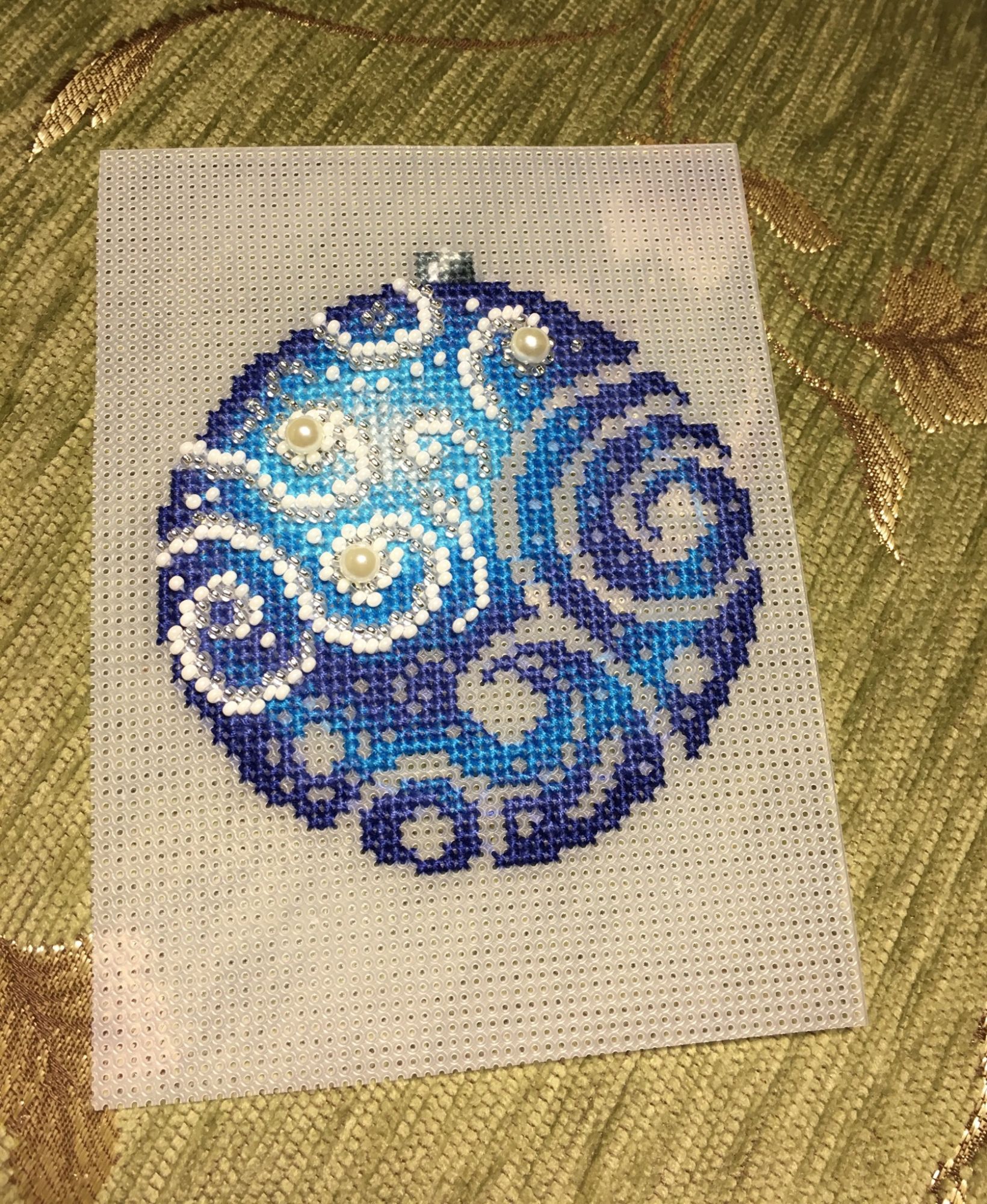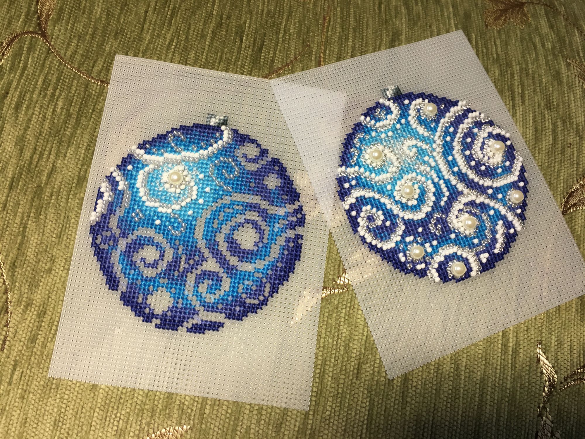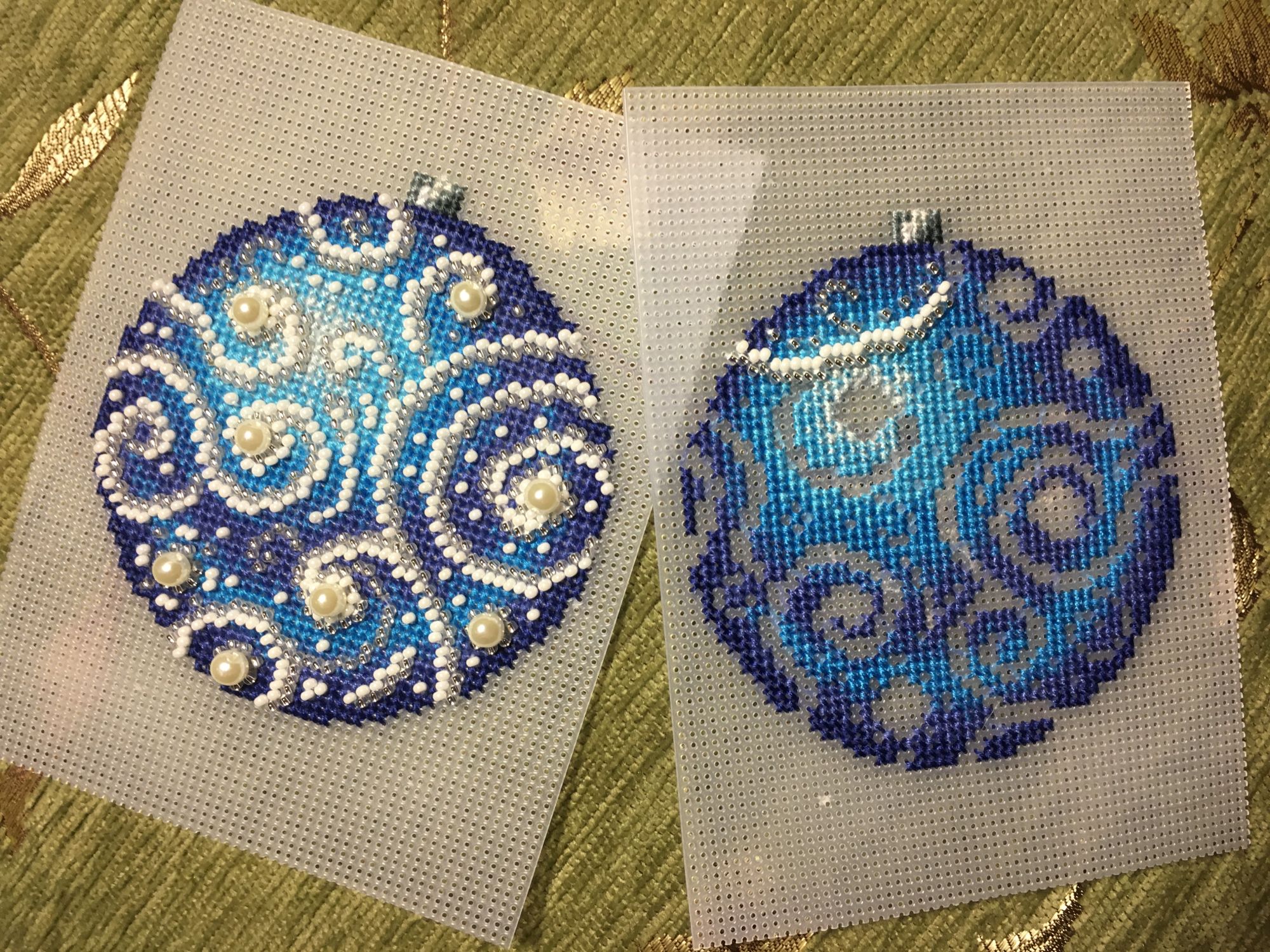 13 января 2018 Всем привет! Всех-всех ещё раз со всеми праздниками))))) Начался и закончился завершающий в этом году шарик от МП-студии «Узоры зимы», но мне как-то привычнее по цветам их идентифицировать)))) Понеслась Ну и собранный Вполне ожидаемо, Голубой оказался самым нарядным. Ну, во-первых, цвет этот я люблю очень, а во-вторых, на нём больше всего бисера, он-то и придаёт ажурность! Почему-то канва для него была не белая, а прозрачная. Но это никак не повлияло не на что, ну чууууть тяжелее было дырочки видеть. Хотела вышить все 4 шарика, и купила их все, но один выпросила сестра, поэтому у меня трио уже говорила, что шьётся легко и непринуждённо, стороны на всех шариках разные (даже на Зелёном), поэтому абсолютно не скучно. И материала больше, чем достаточно! Осталось много и бисера, и мулине во всех наборах. Всем советую! Коврик тоже плела, но там буквально 5-6 рядов добавила, позже покажу. Всё, с чистой совестью и свежими силами возвращаюсь к Деревеньке. Там остался завершающий рывок - один домик, и он самый маленький. Всем прекрасного настроения!!! irinka-mandarinka, Наталья2013, TheSunniestDay и 9 других сказали спасибо Поделиться сообщением Ссылка на сообщение