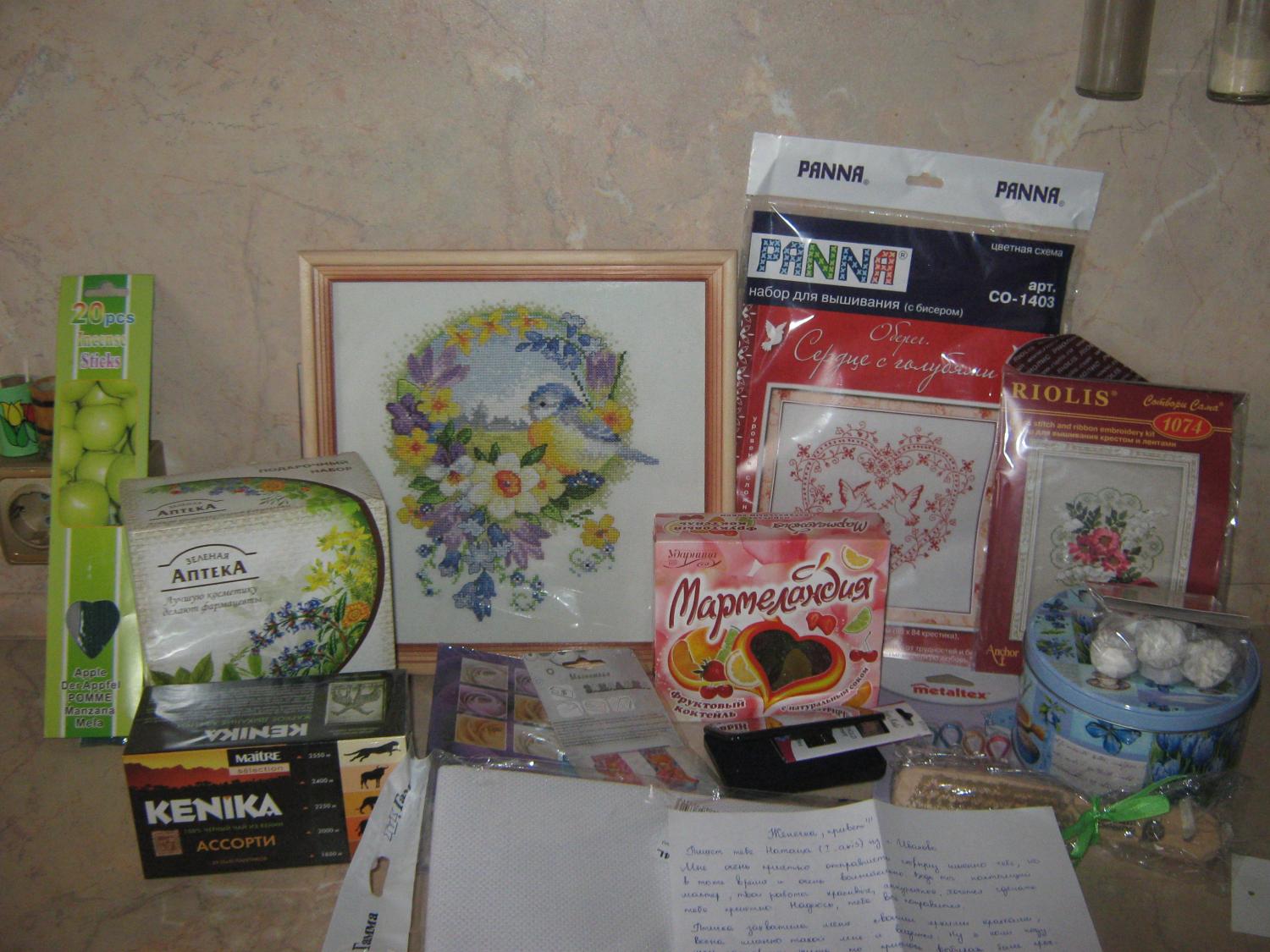20 мая 2014 Часть следующая. Получила чудесное письмо,и множество подарков. Прекрасную работу на ровномерке,где сочетаются мои самые любимые темы-цветы и птицы!Буду любоваться,особенно когда буду пить пуэр и кенийский чай,вдыхая аромат ароматических яблочных палочек!Шикарная баночка в голубых тонах,набор прищепок для полотенец(не поверите,собираюсь купить уже несколько месяцев,но всё время забываю),альбом для фоток.Дочка пищит от магнитных закладок У хомяка особая радость. Как можно удержатся и не пустится в пляс,когда получаешь такие прекрасные подарки?Набор вышивки лентами (давно мечтаю попробовать),Замечательный оберег,канва с люрексом и Потрясающая магнитная коробочка с бархатным дном для иголочек и иголочки .Ну и мармелад.И набор косметики для рук.И щёточка Наташа,огромное тебе спасибо!Столько радости и счастья в моём доме! Женя,красоту то какую ты получила!!!! Поздравляю! Наташа,отличный дебют! Все такое красивущее! Умница!!! I_avis и Lapyshok сказали спасибо Поделиться сообщением Ссылка на сообщение