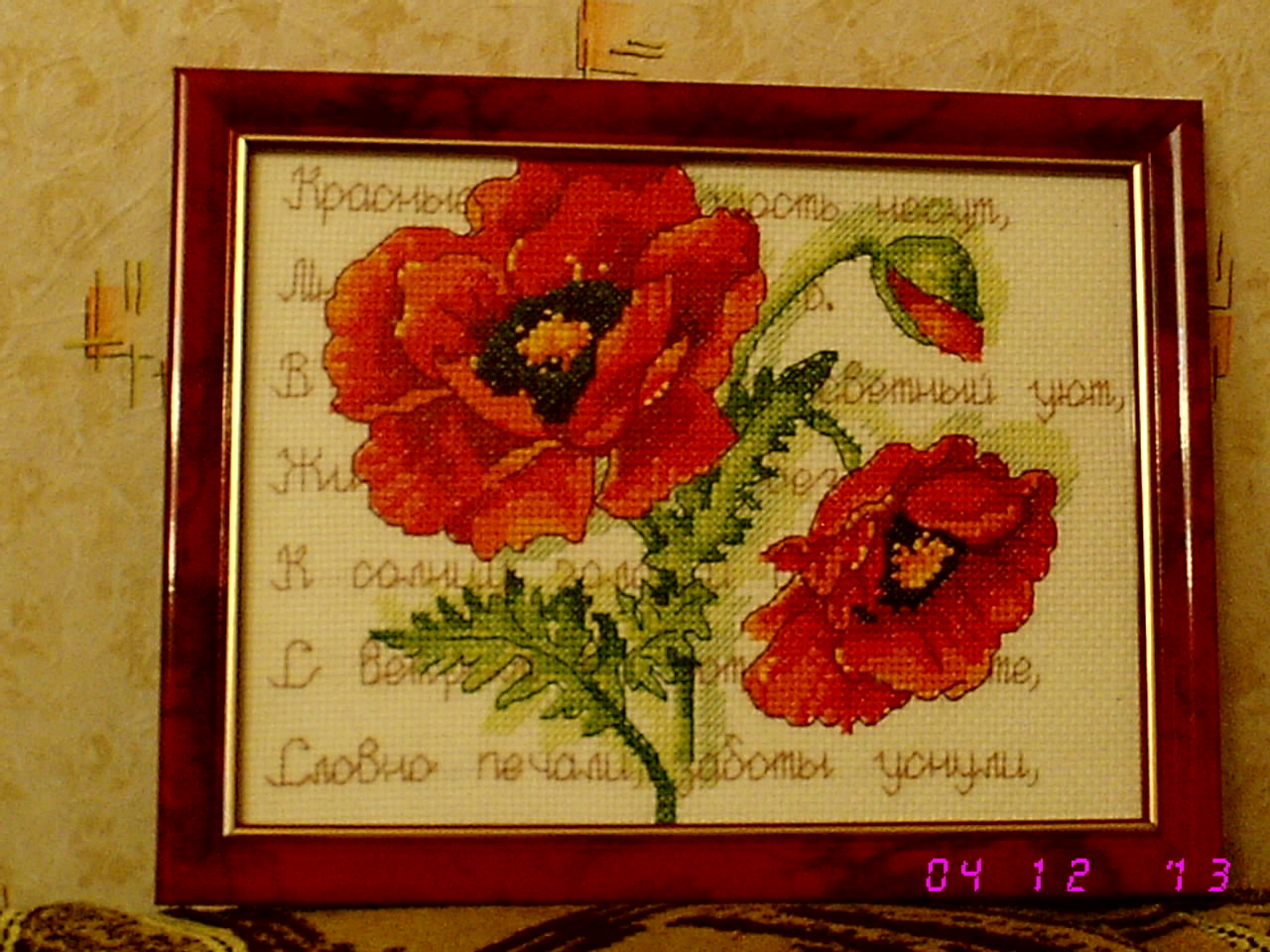 6 декабря 2013 Всем - здравствуйте! Вот так выглядит сейчас мой снеговик . А еще вышились маки , только непонятные английские буквы заменила на русские - за стихи СПАСИБО СВЕТИКУСЕМИЦВЕТИКУ Красные маки в поле зелёном Радуют душу и сердце. Думаю, каждому это знакомо: В Рай открываются дверцы. Маки по полю разбросаны дивно Радостный день воспевают Кто сотворил эту чудо-картину? Маки печали не знают. К солнцу головки свои потянули. С ветром качаются вместе, Словно печали, заботы уснули, Лишь птицы поют в поднебесье. Красные маки радость несут, Мне улыбаются нежно. В поле зелёном рассветный уют, Жизнь, как и небо – безбрежна! Красные маки я в поле сорву, К сердцу прижму рукою. Босыми ногами примну я траву… Так хорошо мне! Не скрою! Красные маки всем сердцем люблю. Им я стихи посвящаю. Бога всем сердцем благодарю. А душа устремляется к Раю! © Татьяна Дюльгер, 2009 Lusha73, Пусичка Пушистая, emeraldrose и 8 других сказали спасибо Поделиться сообщением Ссылка на сообщение