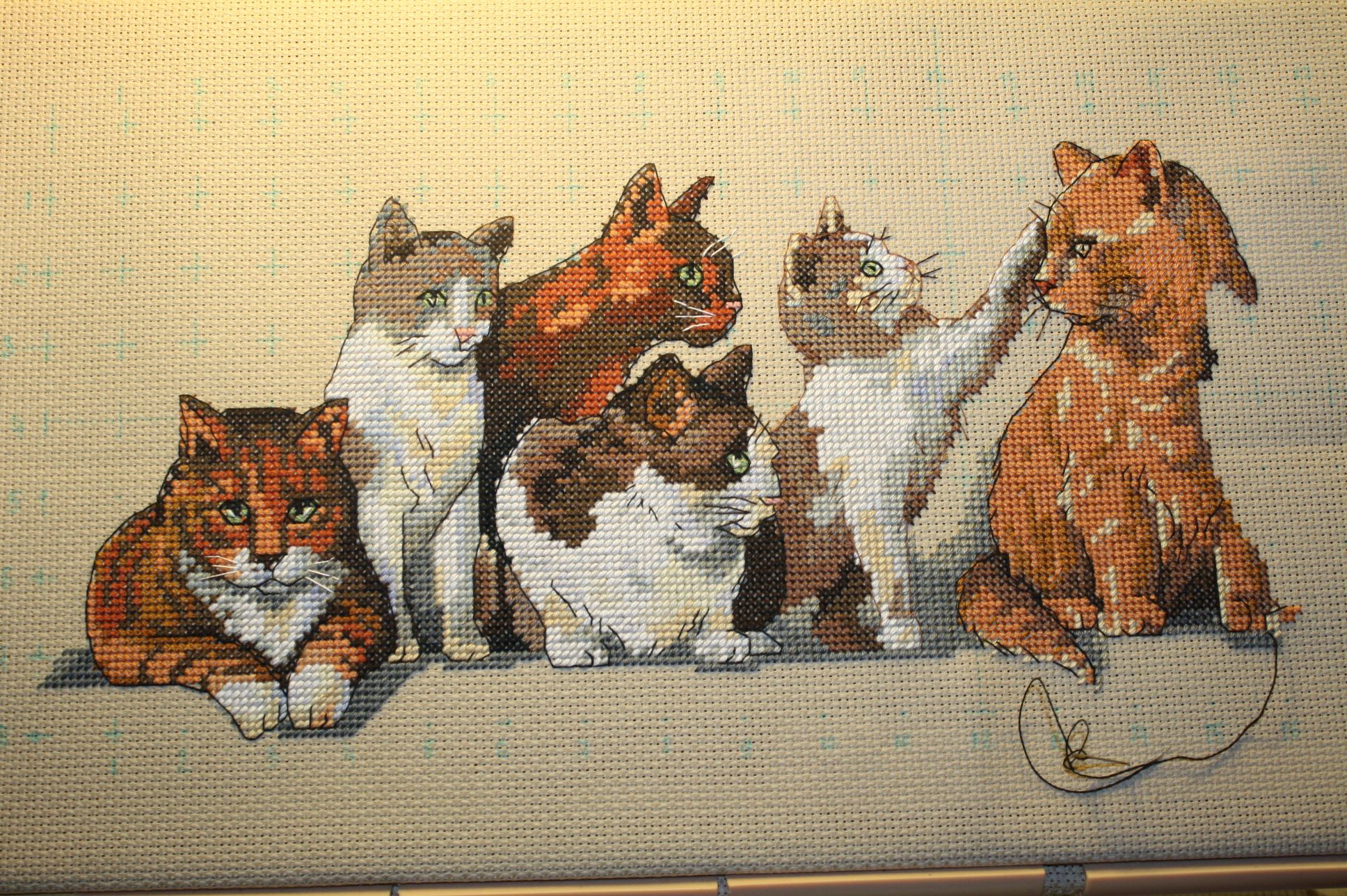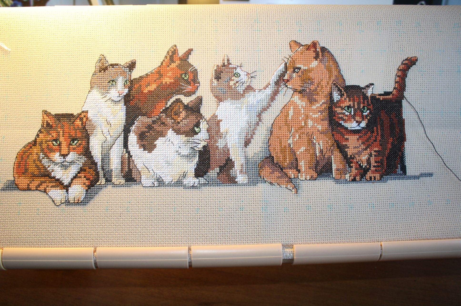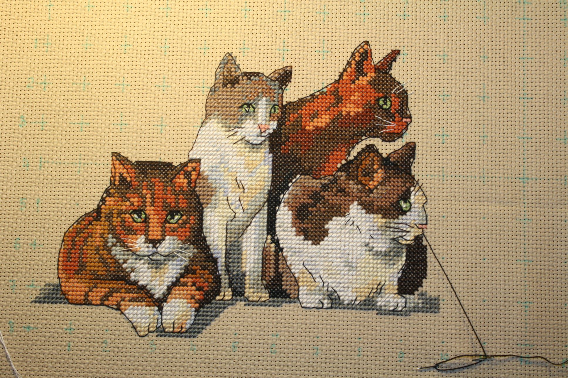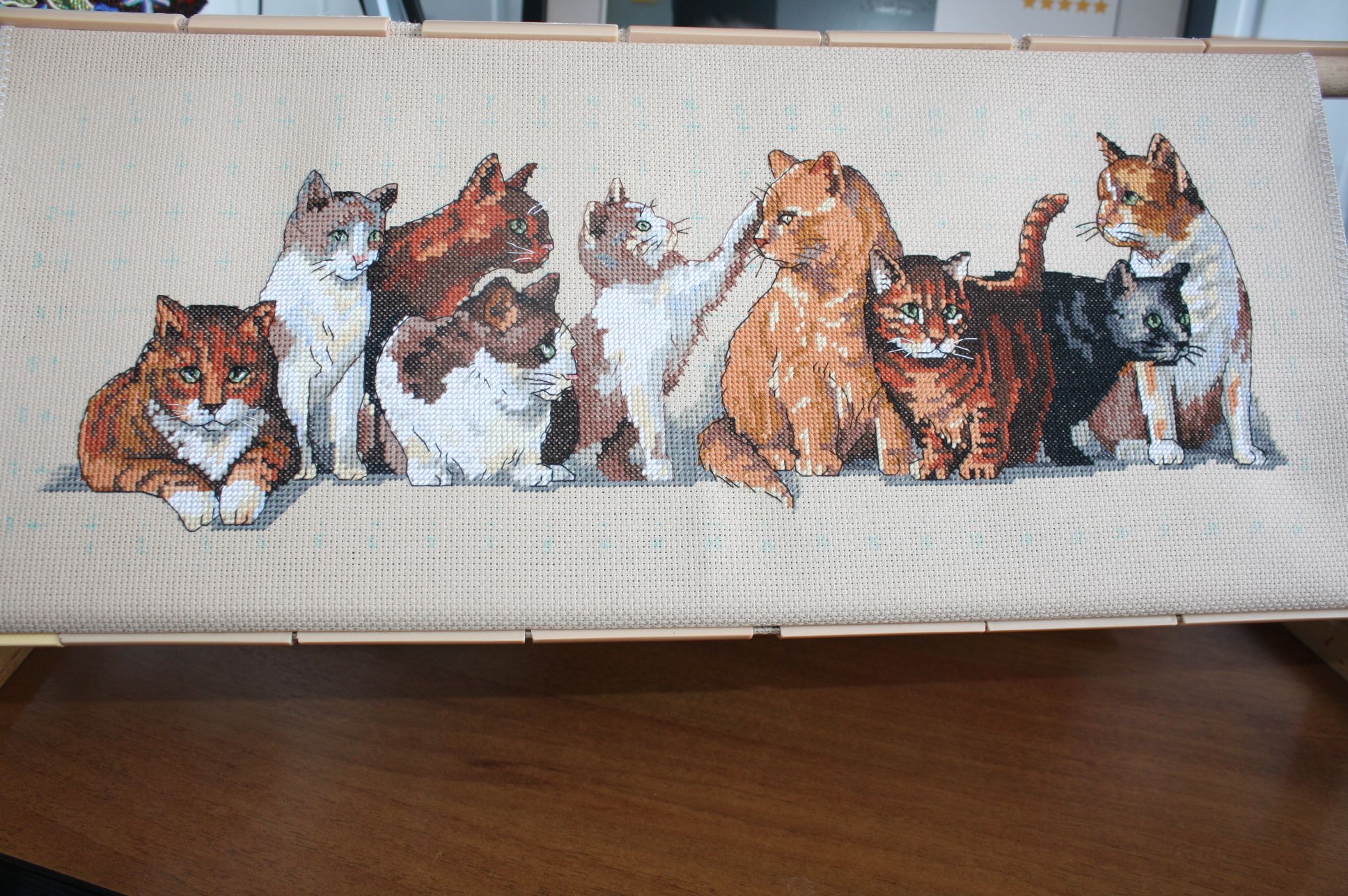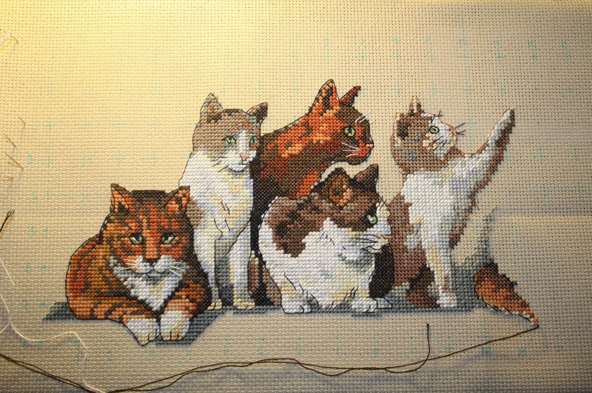 9 апреля 2017 В промежутках, когда уставала от Леонардо с его 18 канвой, шила эту банду кошек: Дименшенс 3762. В наборе шикарная равномерка, на которой я несколько раз пыталась шить и что-то не пошло. Вскрытый набор лежал пару лет. Равномерку я приспособлю в другом проекте, только надо покумекать, как бы ее разметить. Так что после неудачных попыток взяла 14 гамму цвета беж. Хотела взять 18 канву, но котики получались прям микроскопические. Шила крест в 2 нити, полукрест в 4 нити. Ничего не светит.На каждого котика уходило примерно 2 вечера, за исключением второго и восьмого, они отшились каждый за вечер. Из-за замены основы не хватило одного цвета, особо не заморачивалась и заменила на очень близко похожий из запасов ниток. Кисуля, снежик, ОльгаВл и 10 других сказали спасибо Поделиться сообщением Ссылка на сообщение