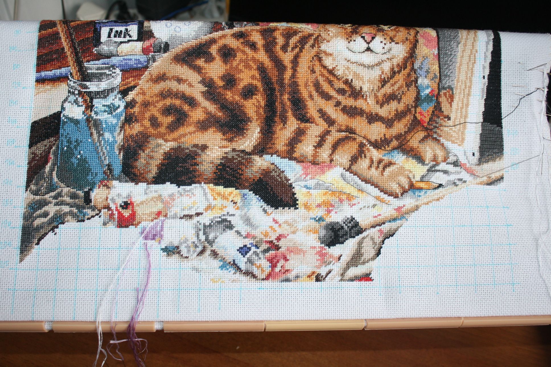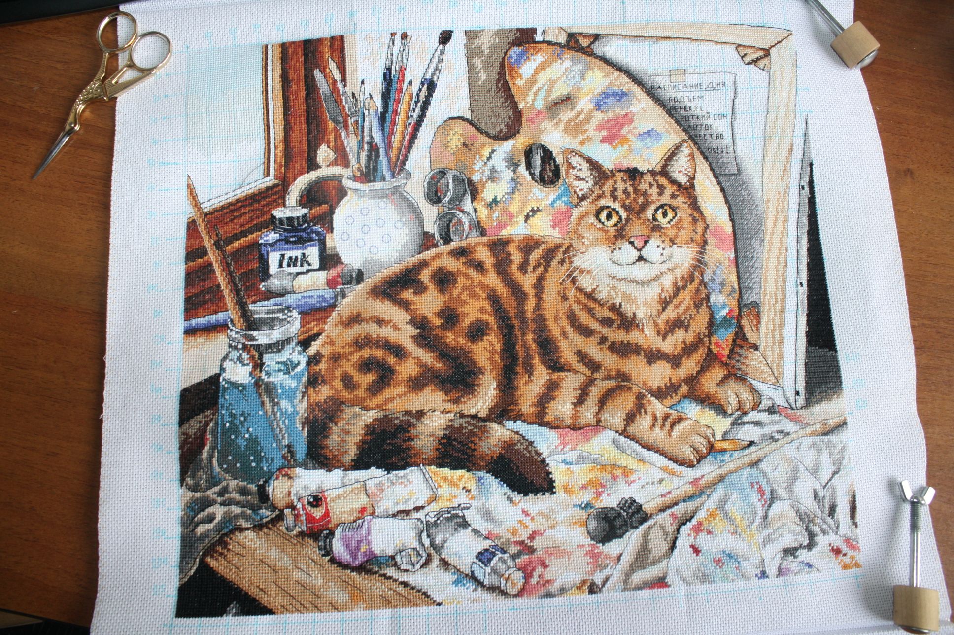 24 апреля 2017 Предпоследние фото. Частично даже бэк сделан. Несколько цветов ниток закончились, заменяю прям из того, что висит на органайзере, близким по цвету номером. То, на чем лежит кот- шьется сложно, большая мешанина крестиков и полукрестиков. Бэк ставит всё на свои места. Думаю, что написать на тюбиках с краской. Или как есть на схеме, или если уж я и так поиздевалась над буковками , то и на тюбиках по-русски написать... Кисуля, soln33, ОльгаВл и 3 других сказали спасибо Поделиться сообщением Ссылка на сообщение