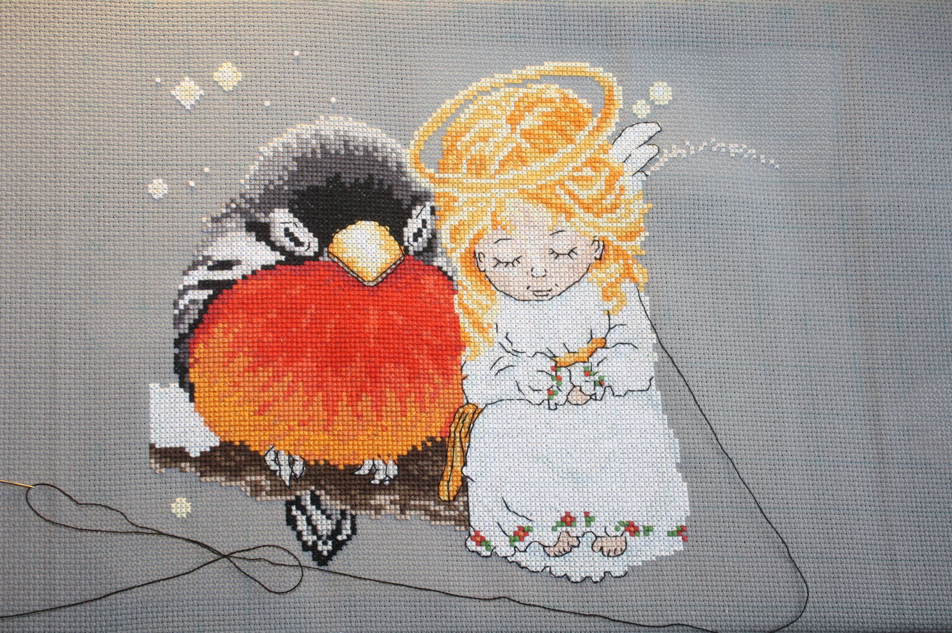 27 июня 2017 Алисена-1167. Процесс спонтанный. Начался в отпуске. Канва 16 каунта серого цвета, мулине 21 цвет, схема символьно-цветная очень крупная. Отшитый снегирь не совпадает с обложкой. Он у меня красно-оранжевый. Бэк часто не по клеточкам. Одежда ангелочка шьется близкими по цвету цветами мулине. Один снежок вышила в неправильном месте, просчиталась, переделывать не буду. Одиночные снежинки решила сделать фрузелками. Немного не мой мультяшный сюжет, но шью с удовольствием... irinka-mandarinka, katushka90, ОльгаТольна и 2 других сказали спасибо Поделиться сообщением Ссылка на сообщение