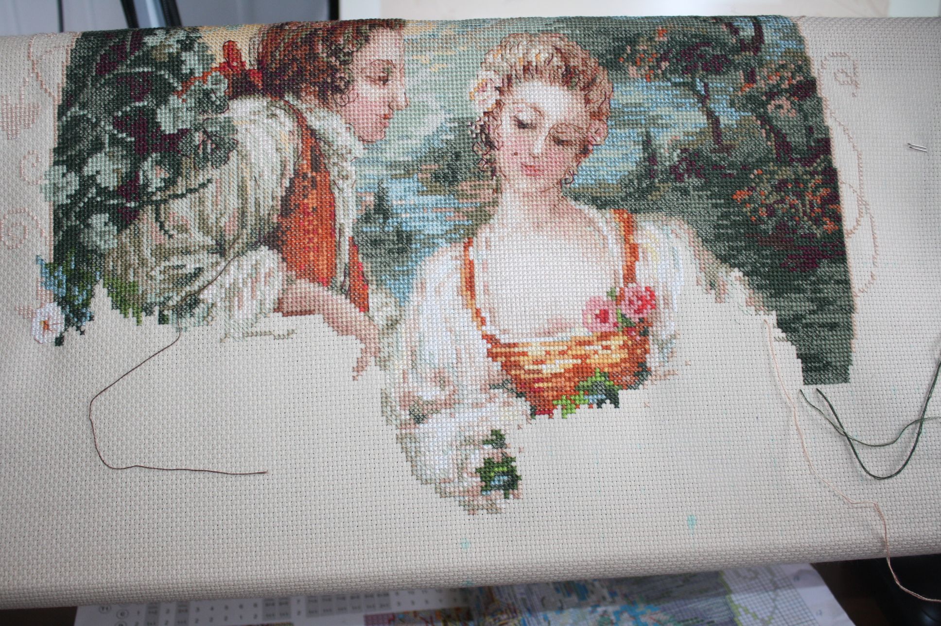 3 июня 2018 Процесс, который провисел на раме больше 2-х лет закончен! Начала 11.02.2016г. , закончила 02.06.2018г. По общему времени много, но когда посчитала дни, то получилось 42, ну на вскидку прибавлю еще неделю, получилось, что максимум на этот процесс ушло 49-50 дней, не больше. Очень удивилась сама. Процесс дался нелегко. Когда дошила одежду, то думала, что самое сложное позади, потом пошли цветы, там тоже было для меня сложновато. Еще небо в одну ниточку тяжело далось, но это только потому, что не люблю шить в одну нитку. Бэк разноцветный, его немало, но он легко прошел, делала его по мере отшива. Сейчас смотрю на готовую работу и думаю:" И чего тут было шить? Тут же шить всего ничего!"... Всех комплектующих хватило, только одного цвета, № 11 (один из оттенков красного) осталось пару ниточек. Остальных ниток осталось с хорошим запасом. Кисуля, татьяна0674, Пушистая и 13 других сказали спасибо Поделиться сообщением Ссылка на сообщение