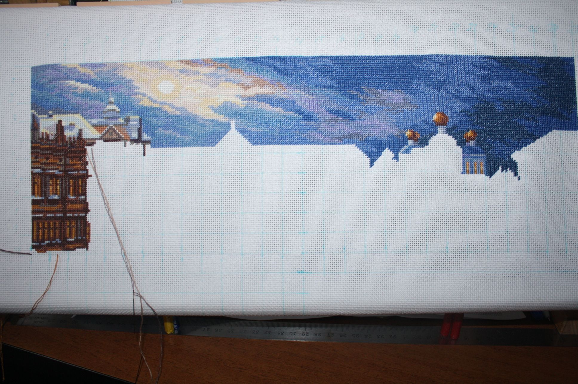 16 сентября 2018 Традиционно начинаю опять шить два процесса одновременно, Первый: Панна ГМ-1515, Новогодние гуляния. Шила понемногу и вот что есть на сегодня. Сразу вышила всё небо. 18 каунт, всё такое меленькое. Шила-шила и обнаружила, что оказывается уже вышила женщину и мужичка с лошадью, т.е это становится видно, когда вышивку отдаляшь от себя. Никаких проблем ни со схемой, ни с комплектующими, было бы время... Надеюсь вышить к Новому году. Кисуля, S4astlivaja, Ветер и 3 других сказали спасибо Поделиться сообщением Ссылка на сообщение