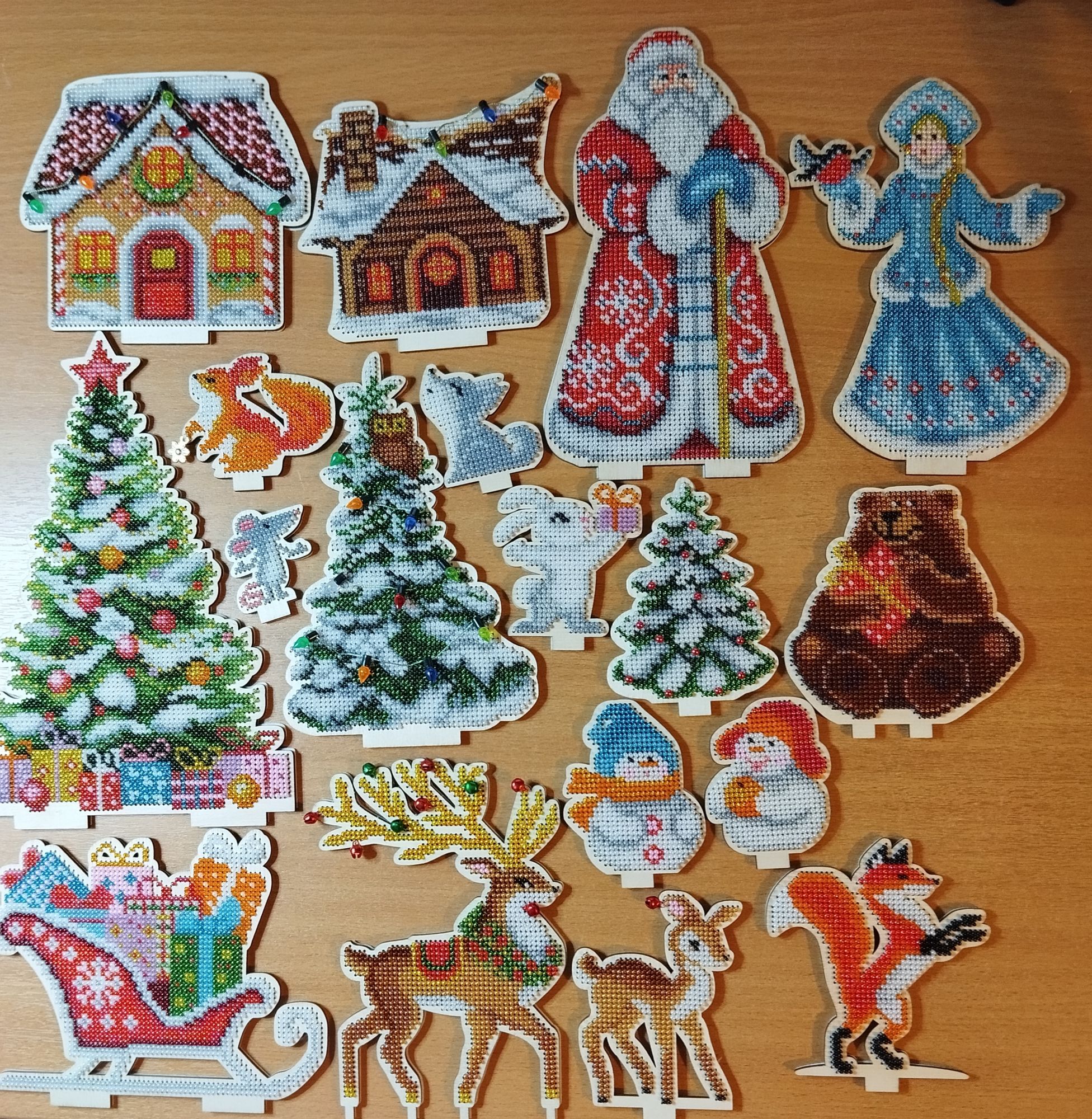 12 сентября Продолжаю шить пейзаж и инсталляцию. Больше ни на что пока не отвлекаюсь. 1. В пейзаже осталось вышить меньше 10.000 ххх. 2. Вышились еще несколько фигурок из инсталляции. Дед Мороз огромный , но по бисеринкам всё равно не переплюнул большую елку. В маленьких фигурках до 500 бисерин, поэтому не стала сильно много фото делать. Везде где могу пришиваю бубенцы и шармы, но стараюсь не усердствовать с украшательствами. Везде сразу приклеиваю задник. Уже использовался целый тюбик клея Момент. BONA-чка, relax_cross_stitch, Хозяйка смешных зверей и 5 других сказали спасибо Поделиться сообщением Ссылка на сообщение