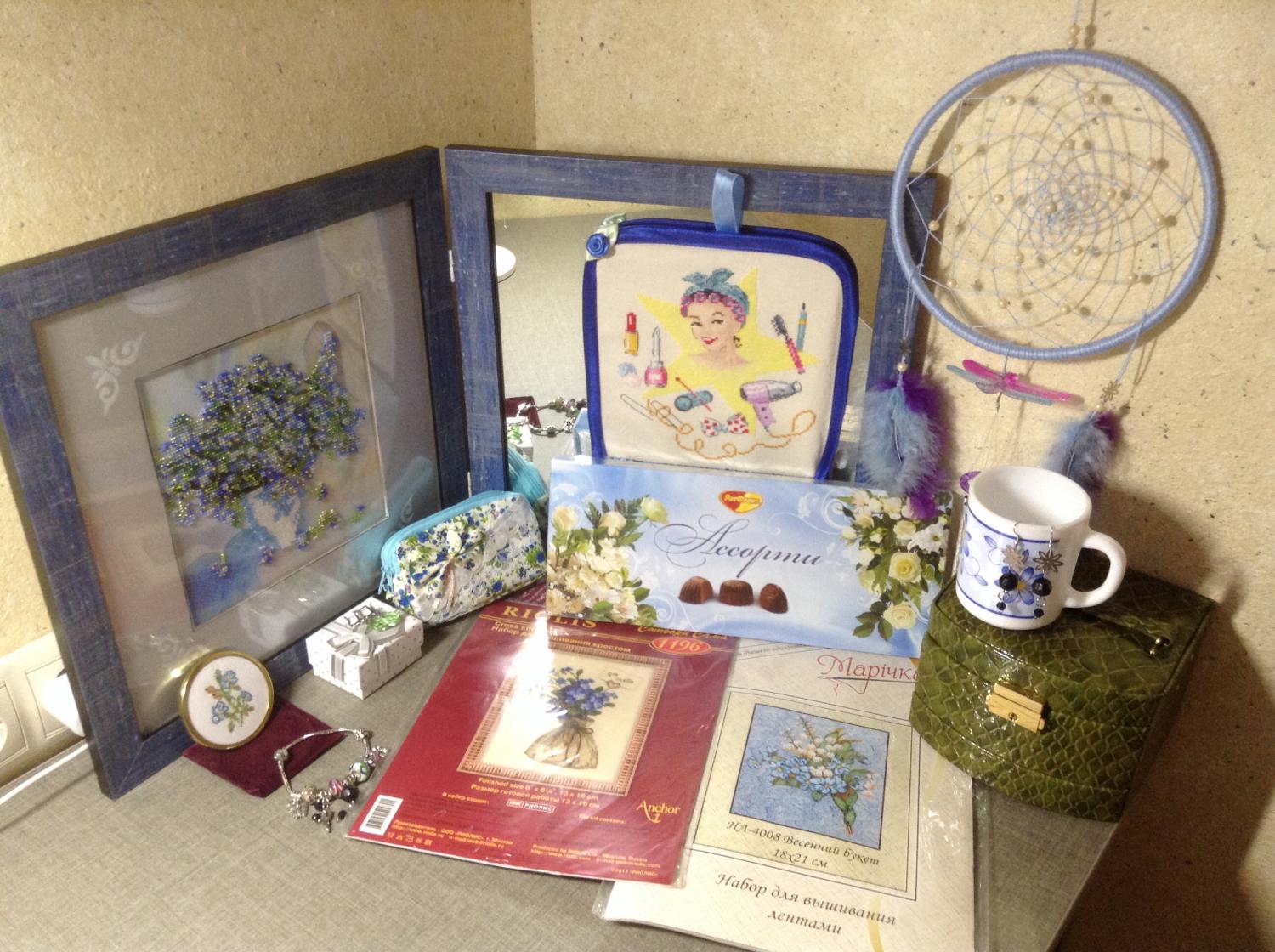 25 мая 2015 Всем привет! А я вам принесла историю создания своего сюрприза, ну, и маленько фоток. Для начала хочу сказать спасибо Женечке Чичковой за предложенную тему. Тема очень интересная и многогранная, она мне помогла раскрыться с разных ракурсов. Женечка, спасибо тебе, дорогая! Как только "Женские штучки" победили в голосовании, в моей голове появилась идея. Изначально я задумала 2 зеркала, одно большое настольное (или настенное), другое маленькое для сумочки. Почему зеркала? Потому что это самая-самая женская штучка! Скажем так, я редко пользуюсь косметикой, почти не ношу чулки/подвязки, про маникюр вообще вспоминаю раз в году... Но без зеркала однозначно не проживу! Начался этап поиска подходящей вышивки. Я рассматривала и крестик, и бисер на принте, но в конечном итоге остановилась на холсте от Абрис-Арт. Выглядит очень благородно! Вы уж простите, фото процесса нет. Я опять творила, аки алкаш в запое, забывая фоткать этапы творчества. Вот готовое зеркало. . Вышивка 19 на 19 см, серебряно-зеркальный слип, серебристое паспарту с дорисовкой в уголках и пластиковый багет. Зеркало тоже с дорисовкой. Можно протирать влажной тряпочкой без химии, рисунок не смоется. Обе рамы скреплены петлями, как книга. Конструкция может стоять на туалетном столике или висеть на стене, сзади кольца. . Размер каждой рамы примерно 38 на 38 см. Это зеркальце приехало с Севы, у нас таких нигде не нашла. В наборе были красные нитки, но у меня была задумка с голубыми цветами. Заменила. Судите сами. Не помню название канвы в наборе, но она мне не понравилась. Шить надо в одну нить через нитку основы. Так вот, мулине все время куда-то проваливалось, приходилось придерживать нить. Когда оба зеркала были готовы, я поняла, что время еще есть и отпустила свою фантазию в полет. Что нужно женщине, сидящей перед зеркалом? Правильно, нужна какая-нибудь фиговина, куда сложить расчески/губнушки/бигудюшки. Так родилась вот эта штука (как же ее назвать?!) . Схема взята из книги Вероник Ажинер (помните, я показывала ее?). Ткань для пэчворка тоже с голубыми цветами, внутри тверденькая прокладка, чтоб "оно" держало форму. В верх кармашка вставлена резинка. Края застрочены косой бейкой (как я с ней мучилась! Всё равно не нравится, как получилось.) Ну, и еще добавила голубую розочку из ткани в уголке. Просто так, чтоб было. После создания этой штуковины меня понесло окончательно, я принялась за бижутерию. Ничего сверхъестественного не сотворила, но вроде бы получилось миленько. Не зная, кому достанется сюрприз, сложно угадать понравится/не понравится. Поэтому я выбрала самый моднявый по словам продавцов браслет-"Пандору". Накупила бусинок, шармиков всяких... Вот, что получилось. Перегружать висюльками не стала (опять же потому, что не знаешь вкусов того, кому достанется). Серьги самые простецкие: камушки, бусины, колечки, швензы... Одни сережки с английским замочком, эту приблуду я раздобыла с огромным трудом. Камушек взяла зеленый, мне показалось, что голубого уже достаточно. Ну, и по традиции, дополнила сюр всякими приятностями. Конфетки в голубой коробочке, чайная кружка с голубыми цветочками, косметичка с ними же, шкатулочка и пара наборчиков для вышивки (один с равномеркой, другой для вышивки лентами). . Совсем забыла, там же еще был Ловец снов. Ну, это уже вроде подписи. Очень рада, что все приехало в целос