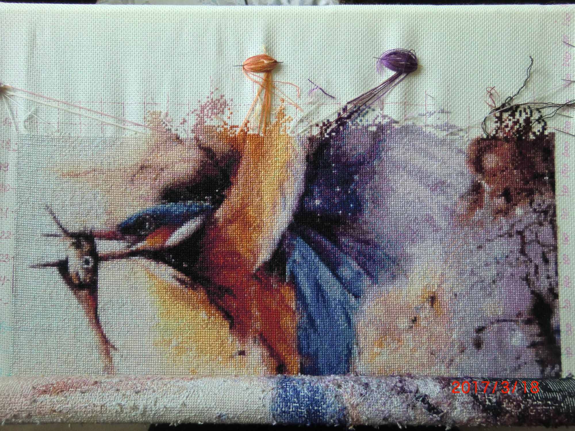 10 апреля 2017 Ну вот и я возвращаюсь не с пустыми руками. Закончила свою птицу-синицу. Пожалела, что не заменила ткань на равномерку, бэк в дизайне ну очень головоломательный, особенно на аиде. Но в целом заменой ткани довольна (напомню, родную ткань из набора заменила на витажную аиду с чуть заметными разводами). Вышивать контуры было непросто, но увлекательно - там такие интересные переходы на перьях от бэка в две нити к бэку в одну нить: Не планировала делать подпись-иероглиф, но на автомате все же начала и спарывать было жаль. Спасибо всем за теплую компанию и слова поддержки! Catopuma, Надежда Ста, Vakuli-olga и 13 других сказали спасибо Поделиться сообщением Ссылка на сообщение