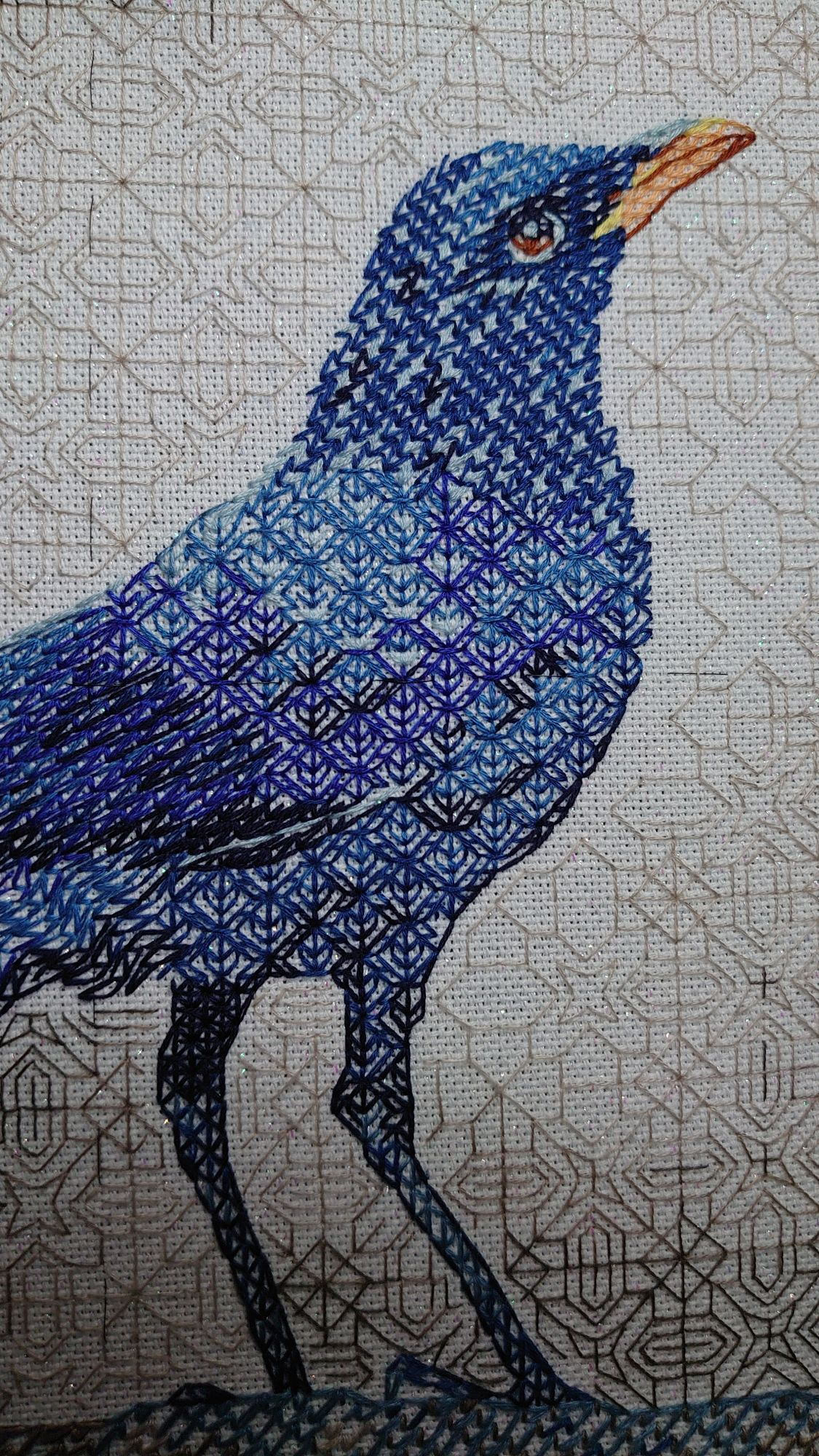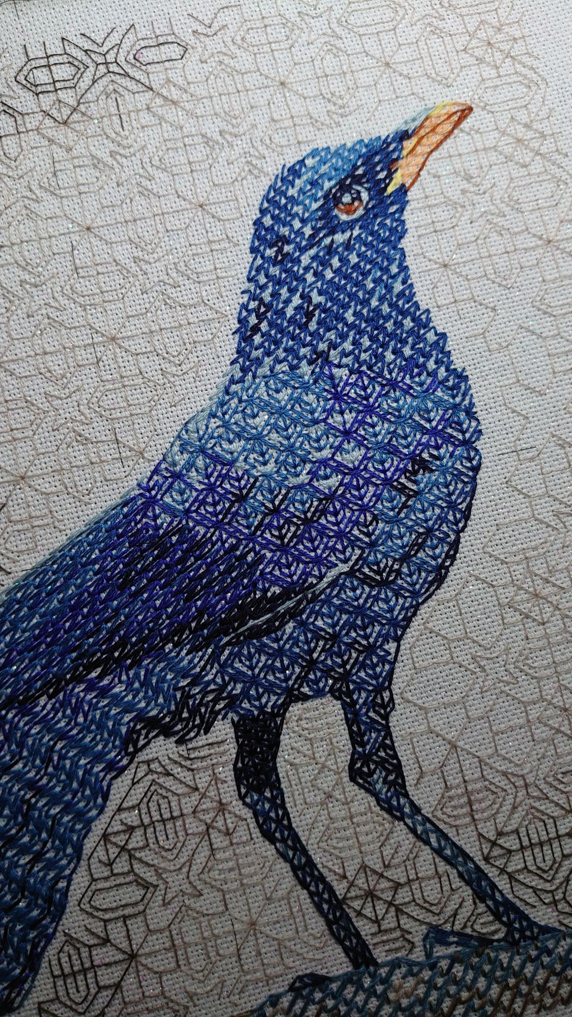 6 ноября 2022 Как давно меня тут не было) Всё что-то руки не доходили, вся с головой ушла в процессы )) Так как собралась слетать в отпуск, а большой процесс с собой не хотела брать, то остановилась на вот такой синей пташке. Ооооочень мне она понравилась, тем более давно хотела попробовать себя в этой технике. "Синяя птица" автор схемы Елена Шевченко (Иванова) размер 110х110кр. ткань Lugana 3835/11, 25 каунт (размер получился 22,5х22,5см) 11 цветов ДМС техника блэкворк И немного о процессе: Так как каунт брала крупный, то решила попробовать создать 3D-эффект. Фон вышила в одну нить, птичку в 2. А камень, на котором она стоит в 3 нити, так как он по картине "ближе к зрителю". Пока вышивала, решила, что мне песочный цвет фона не нравиться (на первых фото как раз именно он). Фон мне показался бледноватым и слабовыраженным, а мне уж больно хотелось контраста, чтобы была видна красота орнамента. Поэтому было решено поменять все цвета фона и добавить ещё один цвет для плавного перехода. Вот что в итоге получилось masha27, Сибирская Кошка, Людмила Мизина и 24 других сказали спасибо Поделиться сообщением Ссылка на сообщение