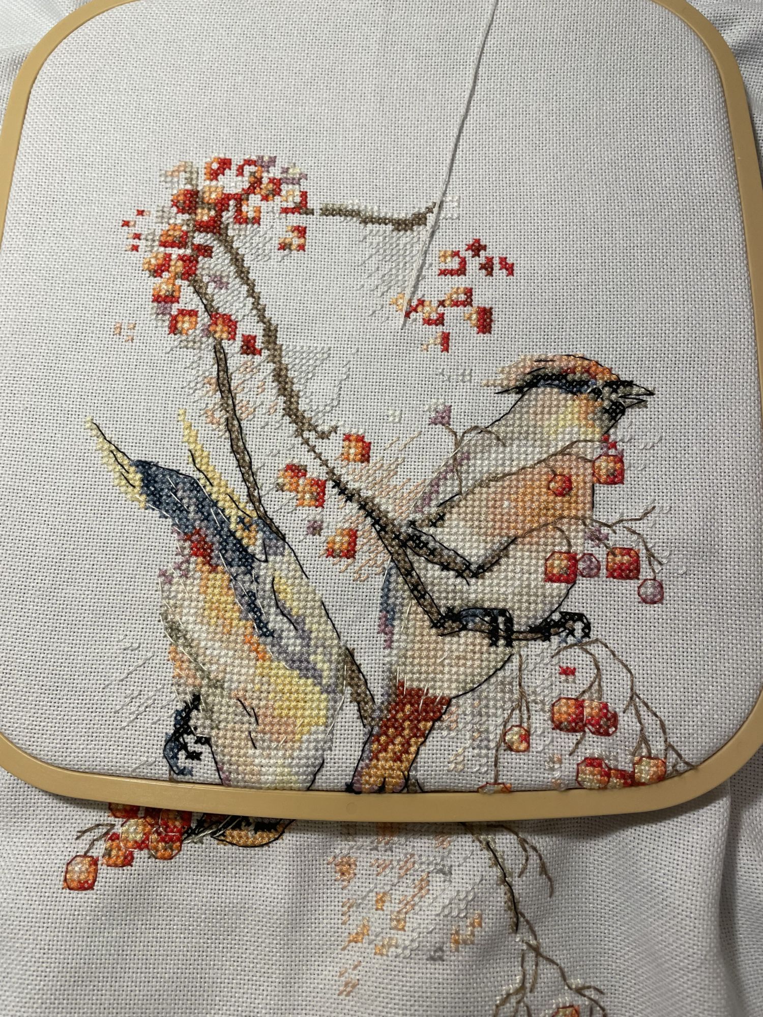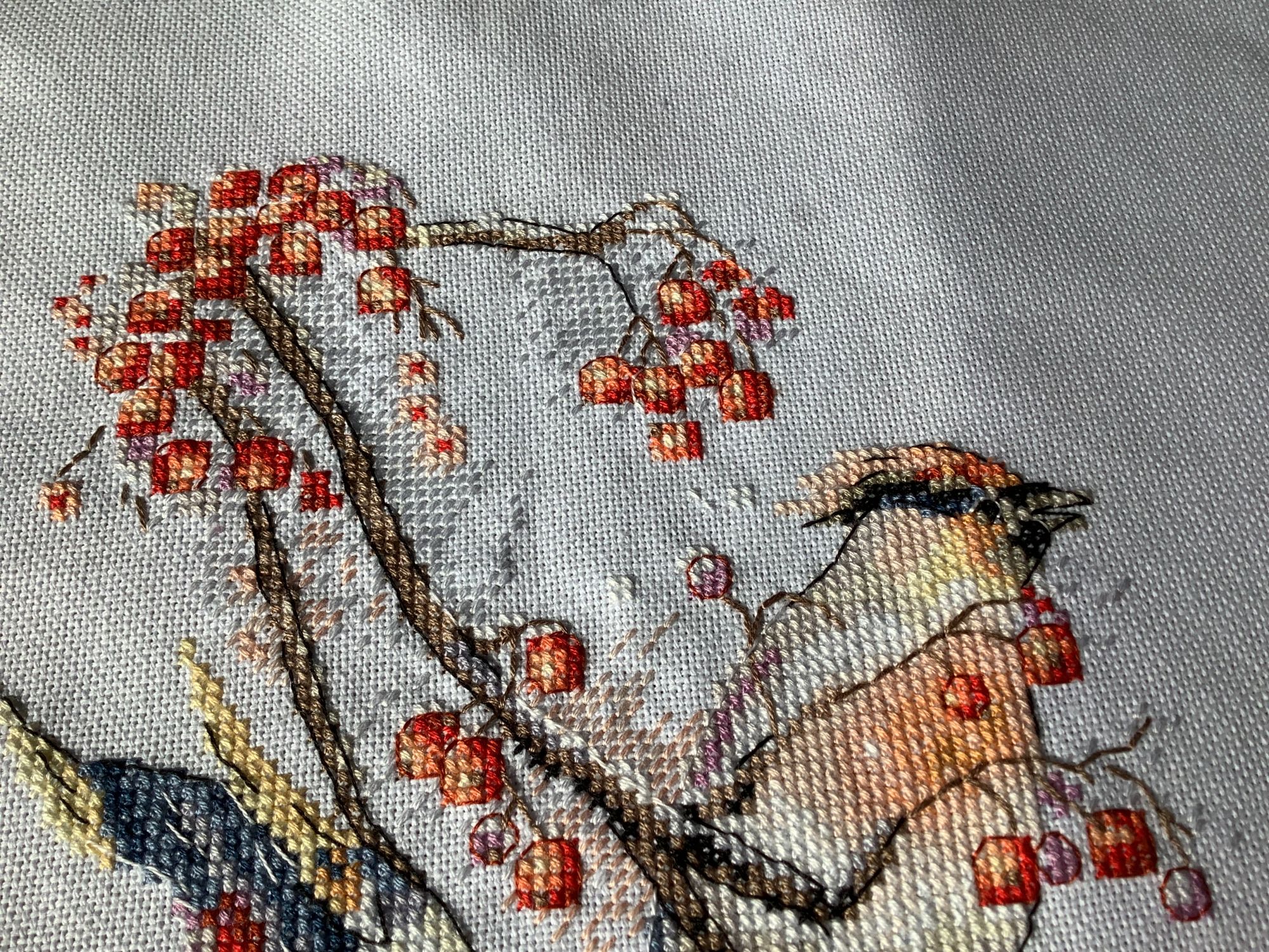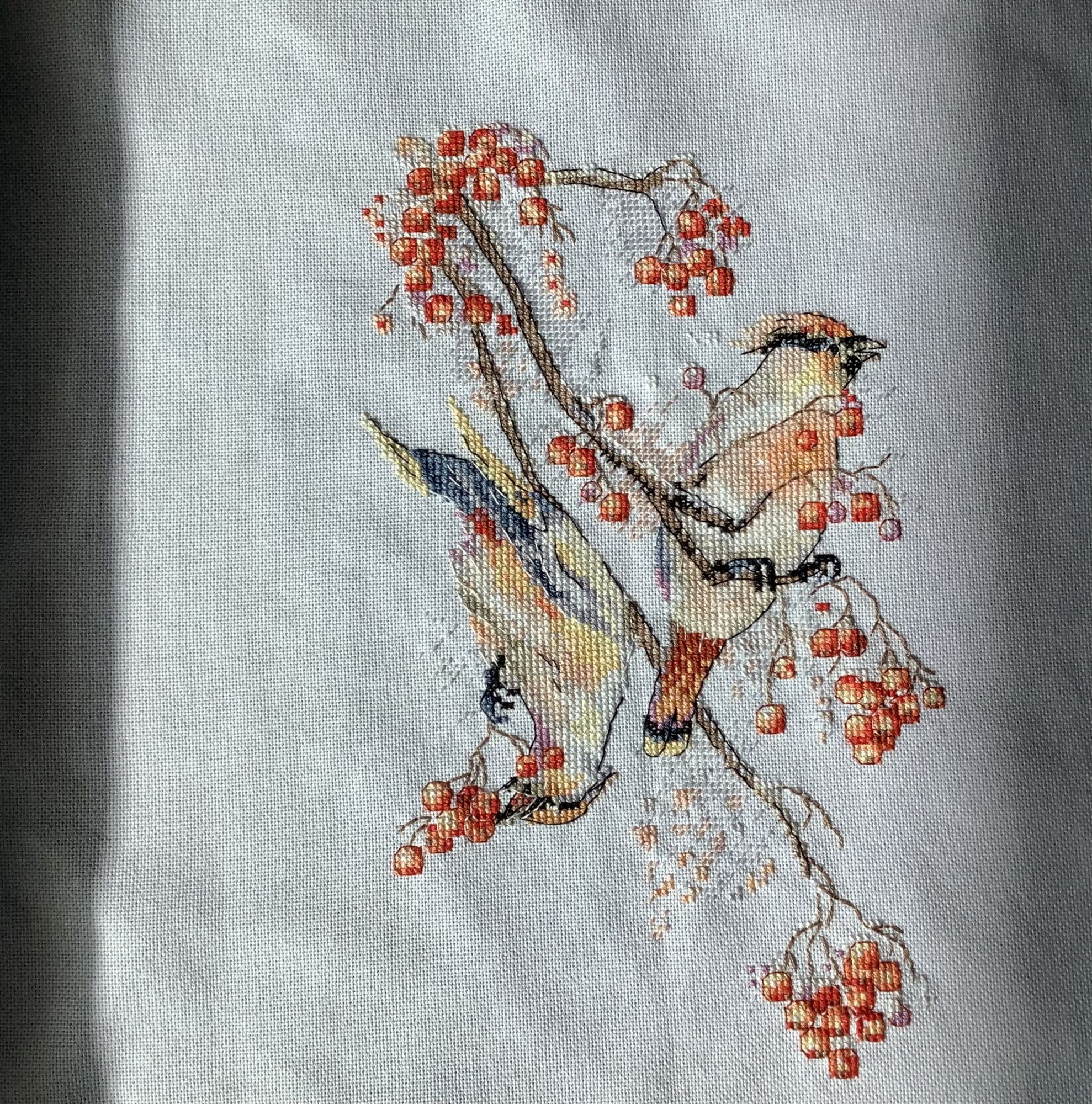 10 ноября 2024 Любимое лакомство процесс закончен А я добила процесс с птицами, в буквальном смысле этого слова. А потом попыталась его сфотографировать, но свет от лампы не передавал всей игры красок этой работы. И здесь выглянуло солнышко и мне удалось его поймать и сделать фоточки, хотя они все-таки далеки от совершенства. Яркие и сочные ягодки - чудо как хороши, но они настоящие ягоды кровопийцы, вышивать их крайне сложно, всего несколько крестиков одного цвета. Птички свиристели тоже удались, таких в моей коллекции еще нет, интересно как она расположены. Вообщем рада, что я добралась до этой работы и еще больше рада тому, что ее закончила! Тави, нельга, Танагра и 14 других сказали спасибо Поделиться сообщением Ссылка на сообщение