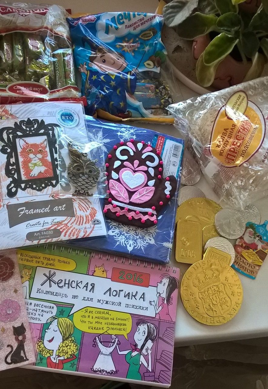 7 января 2016 Вторая часть моего рассказа будет подарочно-прогулочная. Что-то в этот раз новогоднее настроение как-то долго обходило меня далекой дорогой. И только благодаря моим дорогим друзьям, удавалось встряхнуться и почувствовать приближение волшебного праздника. Следующими моими Снегурочками вслед за Наташей (Nat717) и Ташиком стали Светланка (Krelina) и Асик: Как мне сказала Светланка, сова должна помочь передать мудрость старшего поколения моей семьи - младшему. Что ж... Я буду надеяться! А уж какую радость доставили мне смешные птички и очень-очень хочушечный котенок! Наборчикам фетра я обещаю найти применение уже в этом году. И, конечно, уже ставшие любимыми сладости, включая обожаемую Каурку! Еще одна моя любимая Снегурочка - Наташик (niksi), которая прислала мне подарки не только от себя, но и от всей "питерской честной компании", включающей Анютку Монстрочку, Оленьку (pelllbell), Анютку (Maury) (думается мне, что и там Ташик руку приложила ): С Балтийского тортика началось общение нашей компании, переросшее впоследствии в такую душевную дружбу И, конечно, два очень желанных набора. Веселый новогодний сюжет обещаю вышить к наступающему 2017 году - мне он тааак нравится! Я была абсолютно уверена, что на этом мои подарки уже закончились, но как оказалось у меня и на Алтае есть Снегурочка! Я получила очень неожиданный, но оттого еще более приятный подарочек от Зиночки (Пикусенок): Интересный наборчик с рамочкой от РТО, конечно, с котом! Красивейшая фетровая варежка-магнит (подхожу к холодильнику и, залюбовавшись, забываю зачем пришла ). Вкуснейшая Барнаульская халва (это волшебно-воздушное, тающее во рту, восхитительное лакомство!) и конфетки. А еще необыкновенно веселый календарь. Хихикали вместе с мужем! Спасибо вам огромное, мои дорогие Снегурочки! Без вас моя жизнь была бы намного преснее, скучнее и однообразнее! Благодаря вам я надолго продляю свое ощущение праздника, когда пью чай с вашими сладостями, любуюсь на сувениры и игрушки, а затем, когда вышиваю подаренные вами наборы. Это такие волшебные чувства! niksi, emeraldrose, Wian и 18 других сказали спасибо Поделиться сообщением Ссылка на сообщение