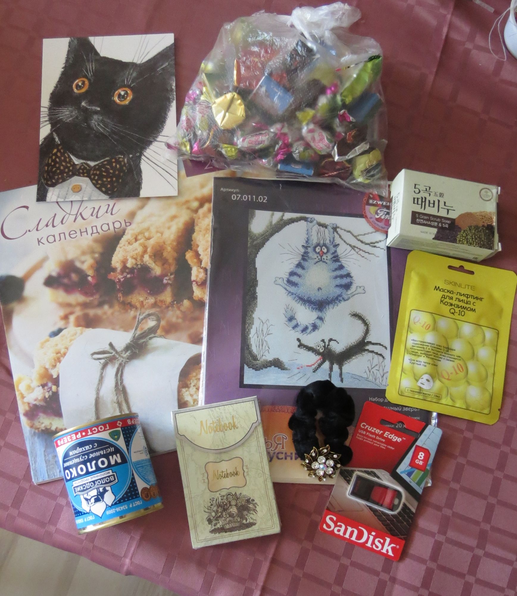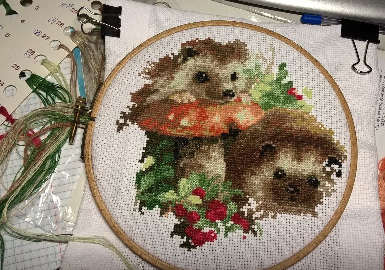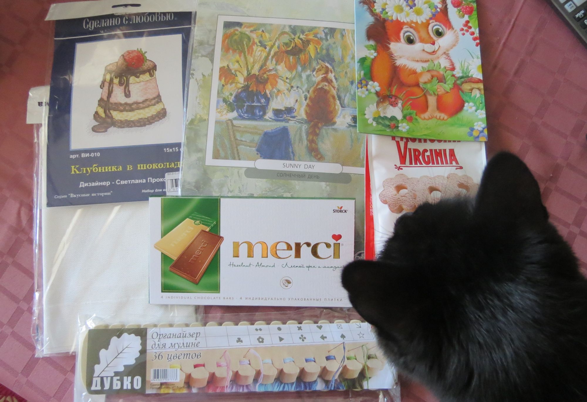 2 февраля 2016 Я пришла с обещанным отчетом. Предполагаю, что он будет длинным и наполненным не только вышивками (старыми и новыми), но и душевными приятностями и подарками. Так что усаживаемся поудобнее, запасаемся чайком и конфеткой и приступаем. Как я и обещала, сначала был завершен совершенно сумасшедший пол у Планетариуса. Вот, что было вышито за прошедшую неделю (вообще-то две, но из-за праздников одна неделя выпала из вышивальной жизни): И вот, что мы имеем на сегодняшний день. Пока Планетариус отдохнет в корзинке. Но в планах, при увеличении светового дня, посвящать ему не менее недели в каждом месяце. Может к концу года я его и побежу ... победю... одолею! Место на станке Планетариус освободил для давно обещанной Покровки от Алисы. Комплектацию набора все желающие уже увидели у Женечки- Лапушка, так что я сразу перехожу к организации рабочего места и началу процесса. С первого же взгляда на схему стало понятно, что попытка шить мостовую по цветам провалится у меня с первых же ниток. Так что пришлось рисовать сетку и шить парковкой. И вот, что вышилось за то недолгое время, которое удалось выхватить между праздниками и работой: На этом небольшом кусочке мне уже повстречались и "чудесатые" крестики, и полукрест в три нити, и крестики в одну и две нити. Интересненько! На работе продолжают вышиваться Ежики. Ничего нового, все так же приятно и довольно быстро (с учетом того, что приходится еще и работать ) Пока не было возможности громоздить на стол станок, начала вышивать своё отражение. "Кот в холодильнике" по схеме Дарьи Ушаковой. Если кто не угадал, на последнем фото - неотбэканая Мыша. Долго и довольно тоскливо вышивался холодильник, начавшемуся желтому банану - обрадовалась как родному! Очередной раз убедилась, что надо слушаться пытных людей. Дизайнер рекомендовала шить на равномерке 27 или 28 ct, мне же захотелось чуть уменьшить картинку, и я цапнула канву 16 ct. Только дойдя до Мыши, поняла свою бестолковость - вот тут-то мне и попались петиты и дробный бэк Ну, ничего, не впервой, бисерная иголочка мне в помошь! На этом вышивальную часть моего отчета заканчивается и я с огромным удовольствием перехожу к приятностям и подаркам. Неделя выдалась весьма насыщенная на душевнейшие подарочки от моих дорогих друзей. Каждый подарок был большим сюрпризом, приятнейшей неожиданностью! Подарочек от Асеньки (Каори) и Светланки (Krelina), увы, не сфотографировала в полном объеме, потому что успела на почту прямо перед приходом друзей и родственников. В суете, он был разобран и спрятан, чтобы дикие дети не покушались на мои сладкие сокровища. В посылочке был вот этот давно желанный набор от Лука-С и две (!) пачки вкуснейшей и любимейшей Каурки. Мне кажется, что в суете подготовки и приема гостей я не смогла передать того счастья и восторга, который испытала при получении подарка. Спасибо, мои дорогие, за доставленную радость! А Каурку я прячу, когда ухожу из дома , потому что мой ребенок способен слопать всю упаковку в один присест. Зато вечером мы всей семьей пьем чай и лакомимся. Следующая радость пришла ко мне от Леночки (Rezavy) из Вологды. Чего там только не было Леночкины посылки - всегда Клондайк, это клад, полный всевозможных сокровищ: Даже портрет моего любимого чудовища! И именные конфетки! Леночка, я всегда испытываю невероятную радость и удовольствие от твоего 