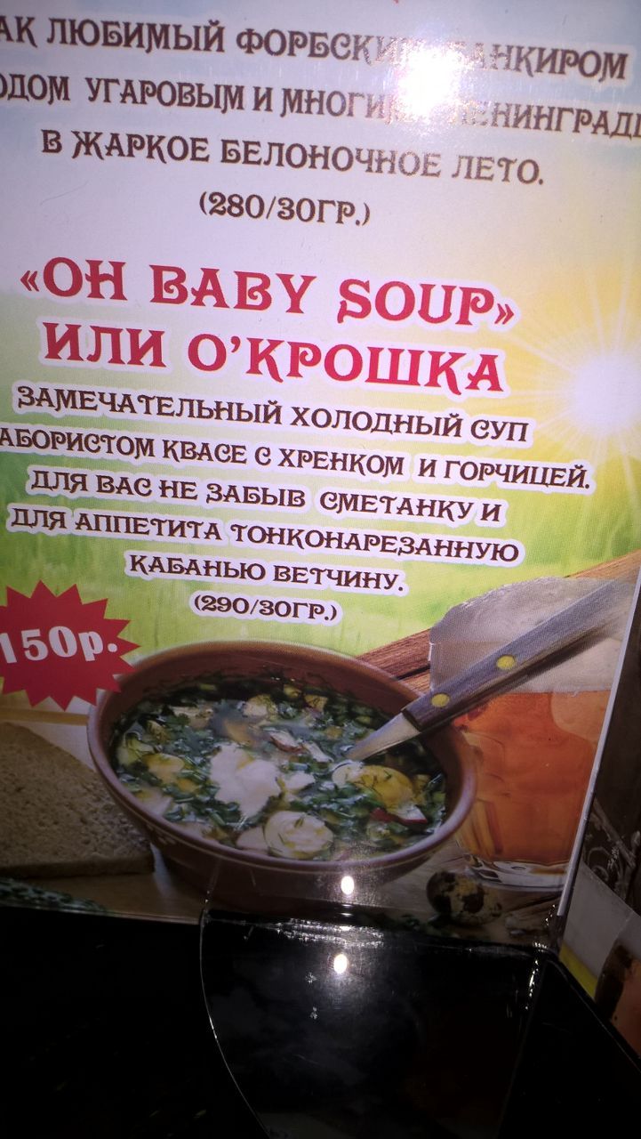 17 июня 2016 На этом поездочно-впечатлительную часть моего повествования позвольте закончить. Завтра еще постараюсь найти время и показать то немногое, что вышилось в полете Хабаровск-Москва-Хабаровск и переездах из Москвы в Петербург и обратно. А напоследок я скажу... то есть покажу, какое забавное блюдо нам предлагали в одном из питерских кафе: bukina88, OlkaY, Selinta и 19 других сказали спасибо Поделиться сообщением Ссылка на сообщение