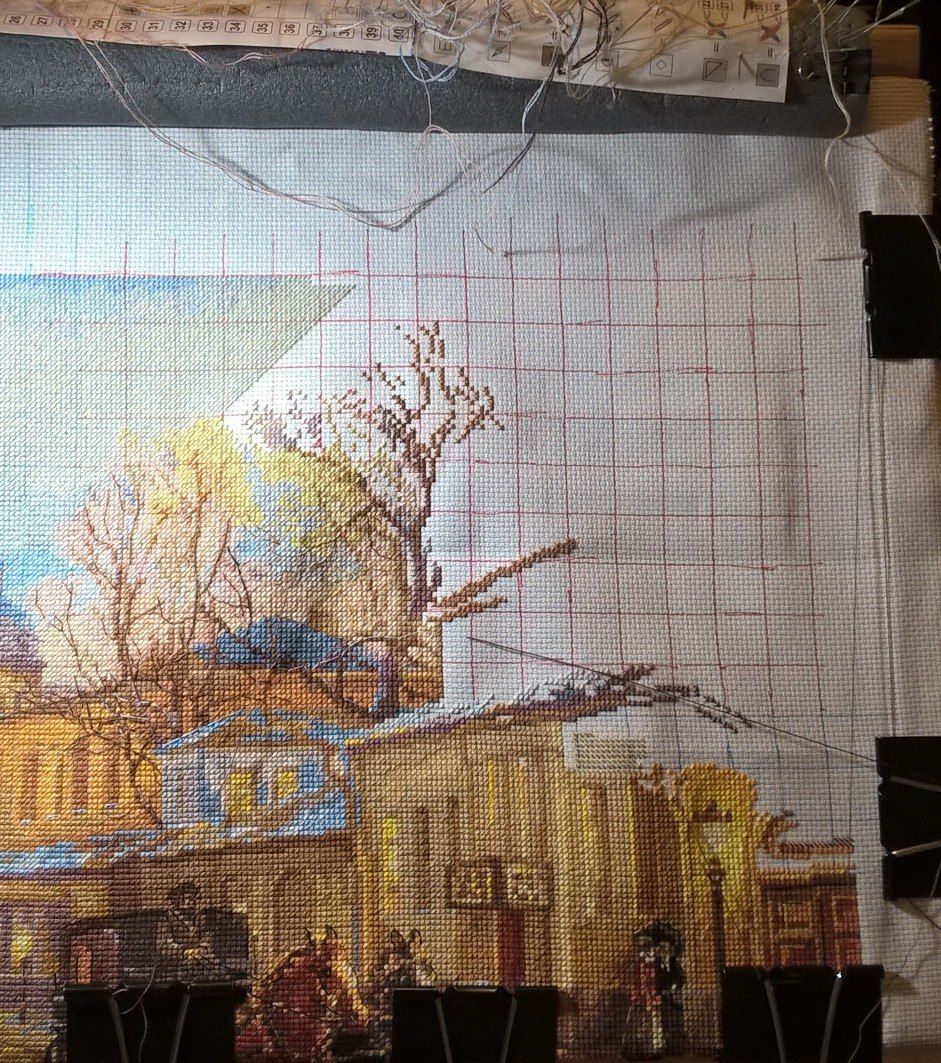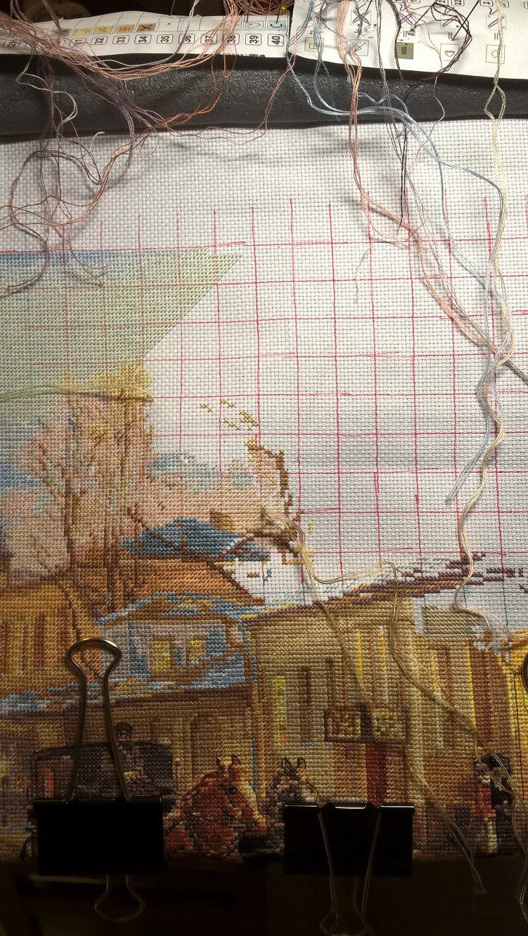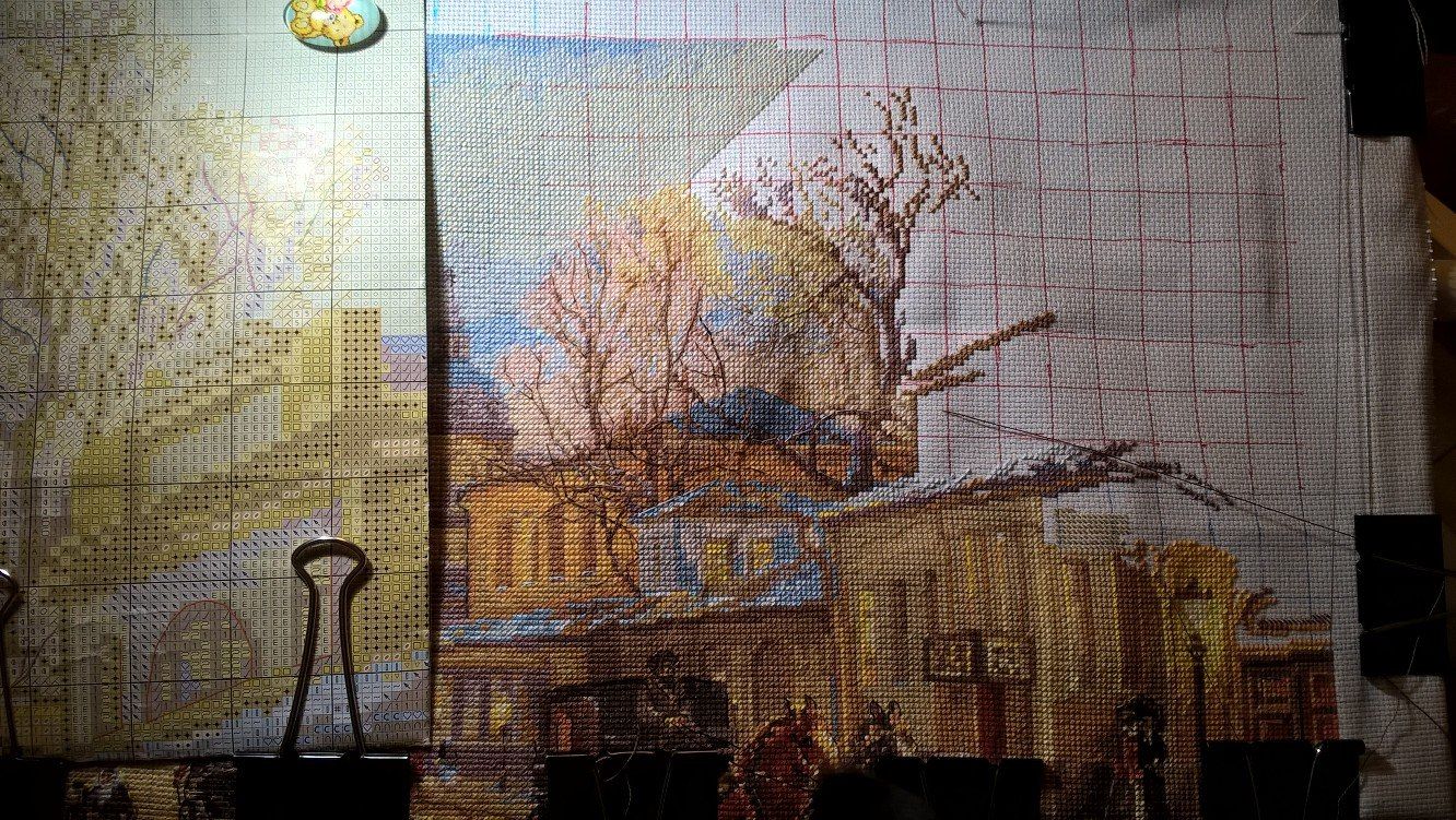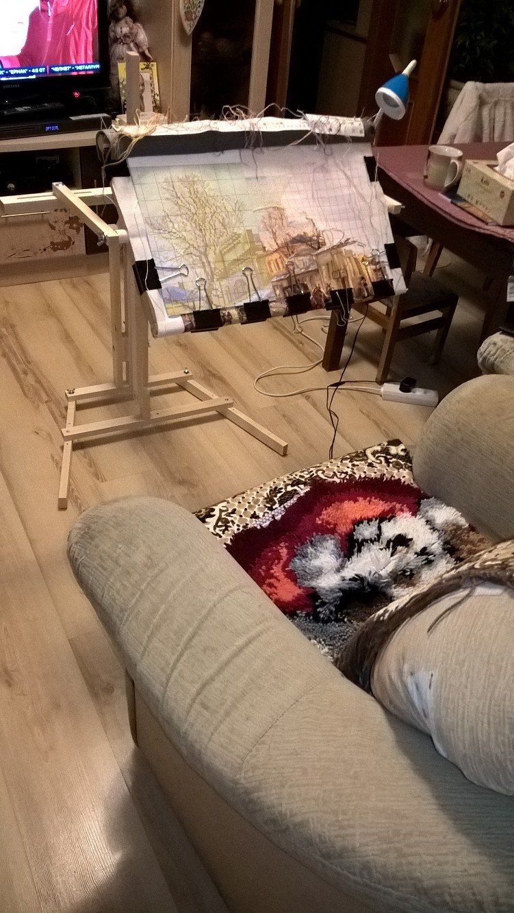 19 февраля 2018 Не прошли и две недели, как я принесла отчет. В этот раз довольно насыщенный фотографиями и событиями, даже немножко деньрожденный и новогодний Как я уже призналась, ягодки в бокале благополучно дошиты и уехали в багетку на оформление (вторая попытка оказалась вполне удачной ). Промежуточное фото дозавершающей перестановки рамки: И заключительное: Процесс доставил массу удовольствия. Поскольку я заменила родную канву на изящный и тонкий Belfast, то первое время крестики казались гуляющими и пляшущими вприсядку. Затем, по совету Цыпуши, уже прошедшей этот путь, я перестала обращать внимание на кажущееся несовершенство и просто шила, получая удовольствие. Ниточки серьезных хлопот не доставили, немного мохнатились, но вполне терпимо, а яркость и насыщенность оттенков легко компенсировали некоторые неудобства. Схема очень читаемая, великовата, конечно, но зато не нужно приглядываться и напрягаться - все символы как на ладони. В общем, первое знакомство с Овеном прошло на ура! После завершения ягодок, я взяла на себя обязательства по дошиванию Покровки. Ну, в конце-то концов, два года это уже достаточный срок, даже для такой непростой и масштабной работы. Даже Планетариус, со всеми его заморочками, был побежден всего-то за год На настоящий момент я продираюсь через самое большое дерево, успокаивая себя, что после него вышивка полетит как по накатанной, тем более, что большую часть "бессмысленного и беспощадного" бэка я уже победила На работе неплохо подрос Старый город: Я убедилась, что стенка, действительно, просто не попала мне в настроение, ибо совершенно заморочное дерево я вышила довольно легко и с удовольствием. А уж окошки появились буквально в одночасье. Под лапки котейке (кстати, у него приросла вторая лапка) я постелила коврик, и даже добралась до второго нижнего угла! А теперь перехожу к чудесам! На прошлой неделе у меня случился внезапный день рождения. Не надо бояться, я не заблудилась в календаре, и крыша моя продолжает стоять на месте Просто до нас добрался подарок, заказанный для меня ЕвгенСанычем. Он уже неоднократно интересовался, что из вышивальных принадлежностей может меня порадовать и активно намекал, что самодельный настольный станок далеко не предел мечтаний многостаночной вышивальщицы. В канун дня рождения я сдалась и с оказией выбрала сразу два приспособления от Сереги-мастера. Итак, представлю вам моих новых помощников: напольный станок "Официант-2 (Усиленный) и настольный держатель для пялец. В сборке все принимали посильное участие: И вот они - мои новые любимцы: А так теперь выглядит мое обновленное вышивальное место: Родная рама заметно больше по размеру, но станок устроен так, что на него легко "села" самодельная рама от моего старого станочка, так что даже не пришлось перетягивать Покровку, и я уже очень оценила удобство нового приспособления. Даже выдвинутое на середину комнаты кресло никого не раздражает, ибо моя радость от обладания такими сокровищами вызывает в дарителе непомерную гордость и чувство глубокого удовлетворения. И завершу я свой пространный отчет на новогодней ноте. Буквально сегодня утром, просматривая новостную ленту, я увидела вот это ЧУДО Разумеется, я не смогла пройти мимо и уже стала обладателем схемы, так что (не в ущерб Покровке!), ручонки буквально чешутся, и в любом п