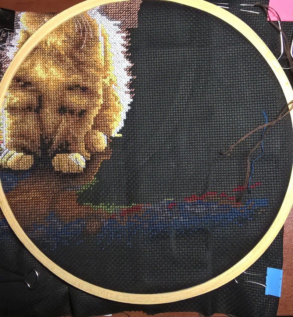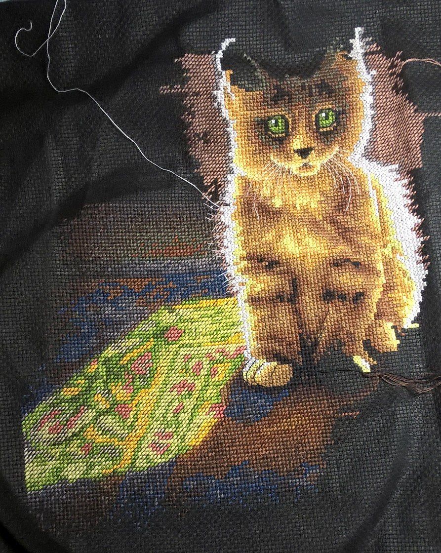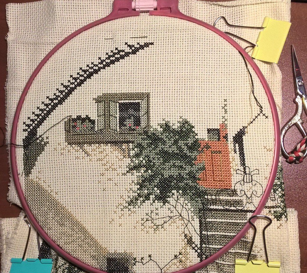 19 февраля 2018 Не прошли и две недели, как я принесла отчет. В этот раз довольно насыщенный фотографиями и событиями, даже немножко деньрожденный и новогодний Как я уже призналась, ягодки в бокале благополучно дошиты и уехали в багетку на оформление (вторая попытка оказалась вполне удачной ). Промежуточное фото дозавершающей перестановки рамки: И заключительное: Процесс доставил массу удовольствия. Поскольку я заменила родную канву на изящный и тонкий Belfast, то первое время крестики казались гуляющими и пляшущими вприсядку. Затем, по совету Цыпуши, уже прошедшей этот путь, я перестала обращать внимание на кажущееся несовершенство и просто шила, получая удовольствие. Ниточки серьезных хлопот не доставили, немного мохнатились, но вполне терпимо, а яркость и насыщенность оттенков легко компенсировали некоторые неудобства. Схема очень читаемая, великовата, конечно, но зато не нужно приглядываться и напрягаться - все символы как на ладони. В общем, первое знакомство с Овеном прошло на ура! После завершения ягодок, я взяла на себя обязательства по дошиванию Покровки. Ну, в конце-то концов, два года это уже достаточный срок, даже для такой непростой и масштабной работы. Даже Планетариус, со всеми его заморочками, был побежден всего-то за год На настоящий момент я продираюсь через самое большое дерево, успокаивая себя, что после него вышивка полетит как по накатанной, тем более, что большую часть "бессмысленного и беспощадного" бэка я уже победила На работе неплохо подрос Старый город: Я убедилась, что стенка, действительно, просто не попала мне в настроение, ибо совершенно заморочное дерево я вышила довольно легко и с удовольствием. А уж окошки появились буквально в одночасье. Под лапки котейке (кстати, у него приросла вторая лапка) я постелила коврик, и даже добралась до второго нижнего угла! А теперь перехожу к чудесам! На прошлой неделе у меня случился внезапный день рождения. Не надо бояться, я не заблудилась в календаре, и крыша моя продолжает стоять на месте Просто до нас добрался подарок, заказанный для меня ЕвгенСанычем. Он уже неоднократно интересовался, что из вышивальных принадлежностей может меня порадовать и активно намекал, что самодельный настольный станок далеко не предел мечтаний многостаночной вышивальщицы. В канун дня рождения я сдалась и с оказией выбрала сразу два приспособления от Сереги-мастера. Итак, представлю вам моих новых помощников: напольный станок "Официант-2 (Усиленный) и настольный держатель для пялец. В сборке все принимали посильное участие: И вот они - мои новые любимцы: А так теперь выглядит мое обновленное вышивальное место: Родная рама заметно больше по размеру, но станок устроен так, что на него легко "села" самодельная рама от моего старого станочка, так что даже не пришлось перетягивать Покровку, и я уже очень оценила удобство нового приспособления. Даже выдвинутое на середину комнаты кресло никого не раздражает, ибо моя радость от обладания такими сокровищами вызывает в дарителе непомерную гордость и чувство глубокого удовлетворения. И завершу я свой пространный отчет на новогодней ноте. Буквально сегодня утром, просматривая новостную ленту, я увидела вот это ЧУДО Разумеется, я не смогла пройти мимо и уже стала обладателем схемы, так что (не в ущерб Покровке!), ручонки буквально чешутся, и в любом п