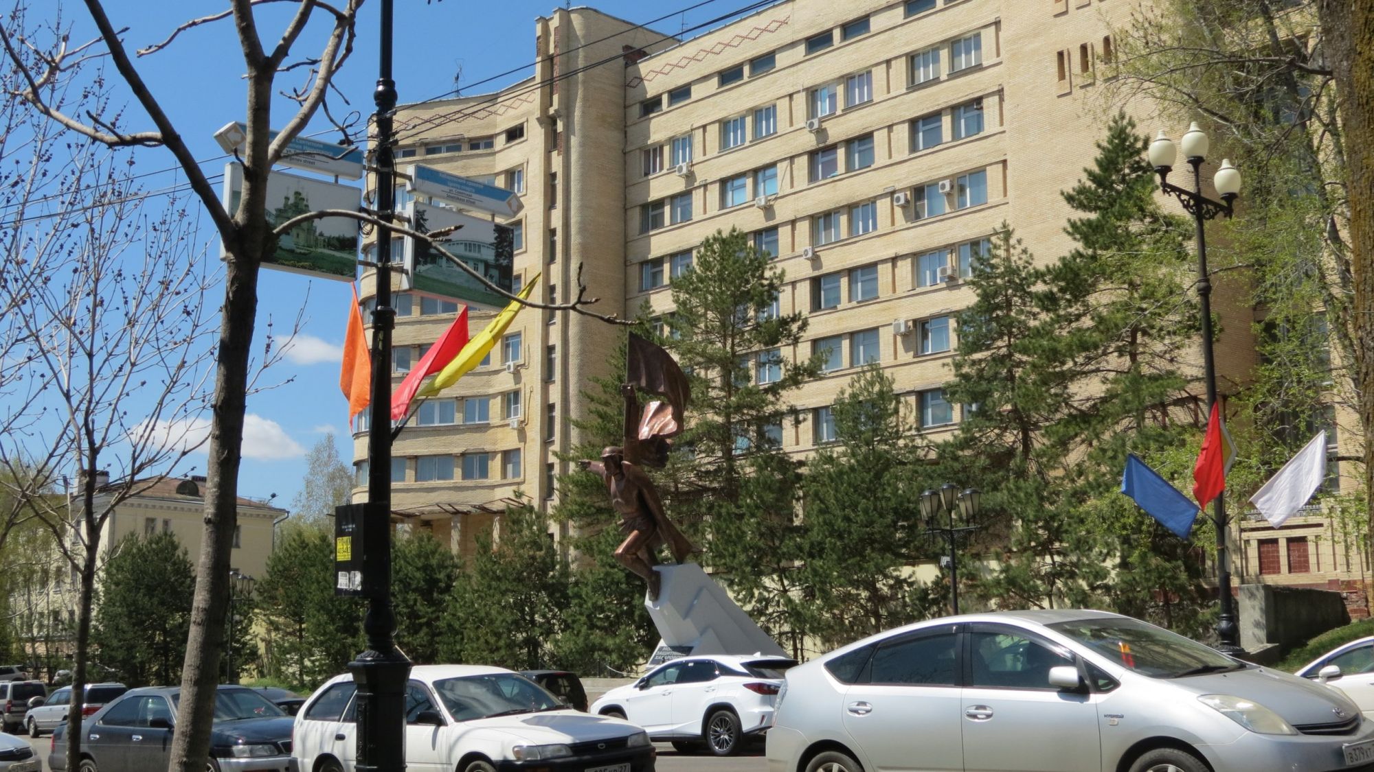13 мая 2018 Я, как водится, имела неосторожность пообещать Асе (Каори) прогулку по Хабаровску. Обещание непременно должно быть выполнено, а значит - все идут гулять! Вот уже неделю держится прекрасная погода (тьфу-тьфу-тьфу, чтоб не сглазить) , а значит самое время пройтись по Амурскому бульвару, превратившемуся в цветущий сад. Сакура в полной боевой готовности к бурному цветению. Лиственница обновила иголочки, а береза украсилась роскошными сережками. Манчжурский орех долго собирается выпустить листья, зато украсился скромными цветами-висюльками. Только аллея старых вязов никак не верит в окончательную победу весны, поэтому стоит едва тронутая зеленой дымкой. До вокзала я не дошла, поскольку всякие дела вывели меня на улицу Серышева. И подумалось мне, что я прежде не знакомила вас с этой весьма интересной улицей. Улица Серышева - одна из центральных улиц Хабаровска, идущая параллельно главной улице им. Муравьева-Амурского, от Амура до поворота на жд вокзал. Я прошла в обратном направлении от площади Серышева (примерно середина улицы) до спуска к Амуру. Сначала небольшая историческая справка (прячу, чтобы не загромождать сообщение, если не интересно, то запросто можно не читать ) Скрытый текст Хабаровск изначально строился на трех сопках, которые были названы соответственно, Военная гора, Средняя гора и Артиллеристская гора. Между сопками протекали две небольшие речки: Плюснинка и Чардымовка, которые в 50-е годы 20 века были спрятаны в трубы и стали бульварами: Плюснинка - Уссурийский бульвар, Чардымовка - Амурский бульвар. В ходе истории названия улиц, разумеется, менялись: - Военная гора - Амурская - Тихменевская - Троцкого - Серышева; - Средняя гора - Уссурийская - Большая - Н. Муравьева-Амурского - Карла Маркса - Н. Муравьева-Амурского; - Артиллерийская гора - Хабаровская - Барановская - Ленина. Итак, начну прогулку от площади Серышева. Удалось застать утренний туалет бюста Степана Михайловича: Эта часть улицы, как видно из исторического названия, принадлежит военным. Большую часть правой стороны занимают здания штаба Восточного военного округа, построенные в различное время. Главное здание штаба находится в здании бывшего Кадетского корпуса, построенного в 1901-1903 гг. Улицу, честно говоря, переходить не хотелось, благо "шпионская фототехника" позволила даже мемориальные доски увидеть: У левого крыла притаился маленький танк Т-18 (МС-1), поставленный на постамент в качестве памятника Героям Дальневосточникам, воевавшим в конфликте на КВЖД, у озера Хасан, на реке Халхин-Гол и во Второй мировой войне. На противоположной стороне улицы расположились дома для офицеров штаба, опять же различных лет постройки, от самых старых начала 20-го века домов для преподавателей и наставников Кадетского корпуса до офицерских домов сотрудников штаба от 30-х до 80-х годов прошлого века (о ужас, я даже помню как некторые из них строились ). Ой, это же просто прелесть! Улица Серышева удивительна и примечательна еще и своими удивительными двориками. Вот я буквально сделала несколько шагов с шумной, заполненной автомобилями улицы, свернув в арку, и оказалась не в 2018 году, а, например, в.... 1950-м с его удивительной тишиной и умиротворением, чудными домиками, огородиками и очаровательными обитателями: Чем ближе к Амуру, тем монументальнее строения. Известный "генеральский дом