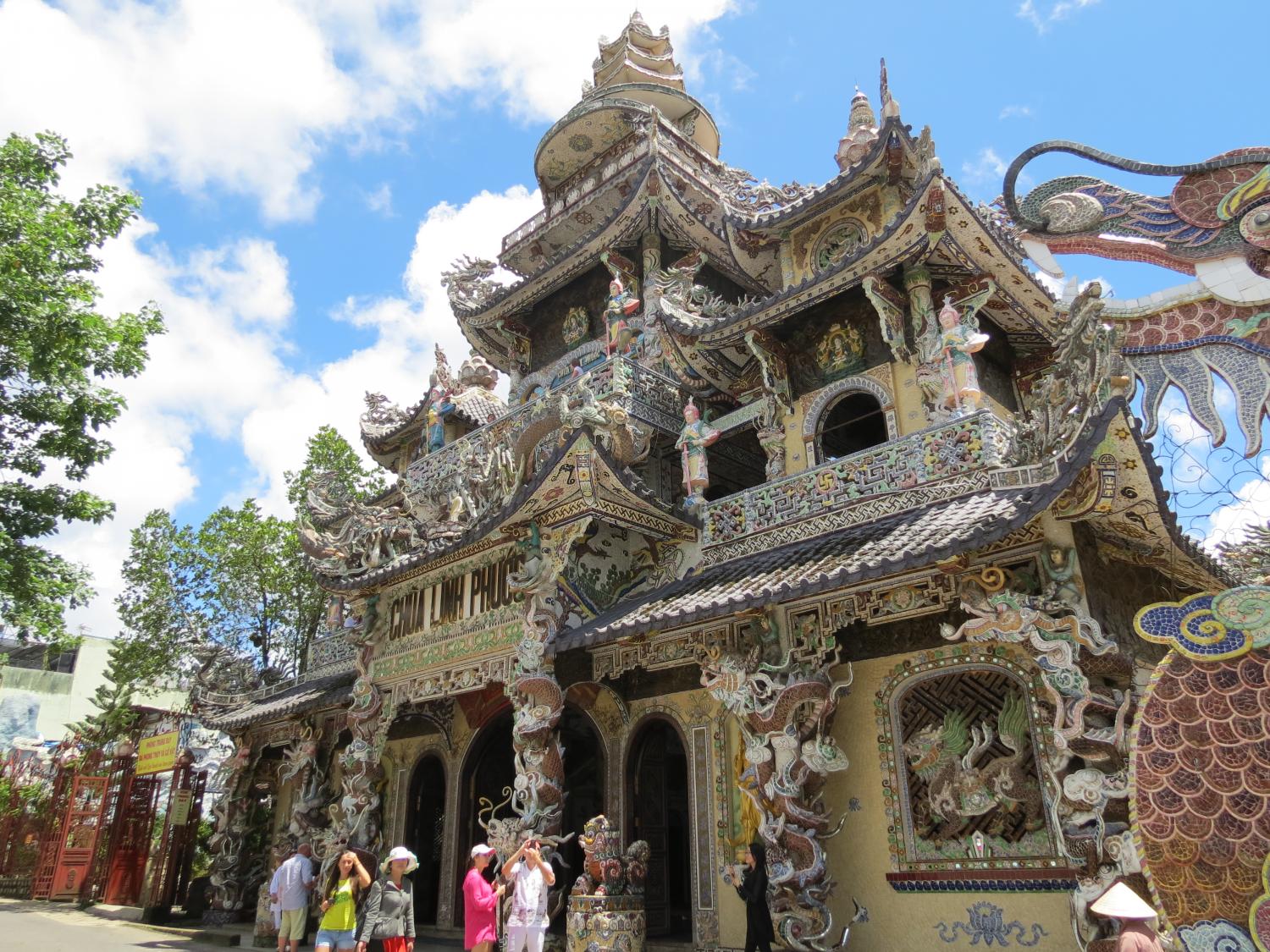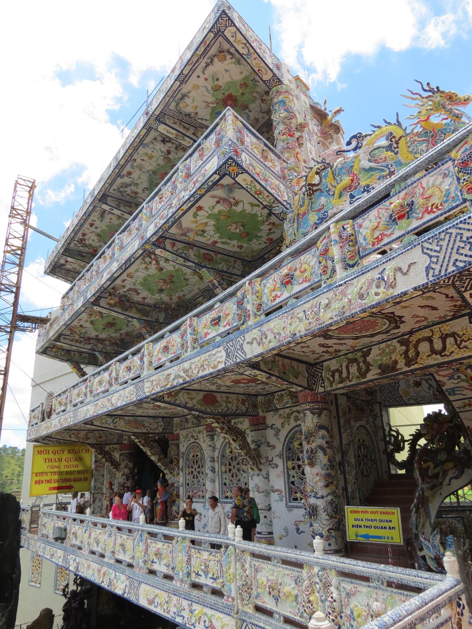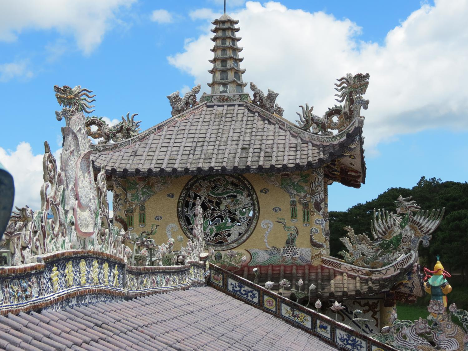 5 октября 2014 В 8-ми км от города нас привозят в очень интересную пагоду Линь Фуок. Пагода не старая, строительство начато в 1949 году и ведется поныне. Пагода особенно интересна тем, что она полностью облицована осколками стекла и фарфора. На территории пагоды в огромной нише установлена статуя какого-то божества (никак не могу вспомнить, какого именно ), высотой 12 метров, полностью покрытая цветками бессмертника. Разумеется мы с Женей полезли на самый верх самой верхней башни. И вот какой вид нам открылся. Лена1973, mrn1970, ГАЛИНА_С и 10 других сказали спасибо Поделиться сообщением Ссылка на сообщение