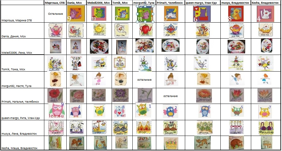 4 июня 2014 Девчонки, на днях составлю табличку для наших картиночек. Заранее хотелось бы уточнить, где чего сейчас находится и на каком этапе. 1) Маргоша, Марина, СПб - отшиваю лифчики Лены, на очереди котейки Маши 2) Dania, Дания, Москва - почти отшила котеек (ждем фото) 3) meledi2006, Лена, Москва - ? 4) Tomik, Тома, Москва - отшила снеговичков Лены (фото есть), отшивает чайники Дании 5) morgun92, Анастасия, Тула - ждет снеговичков Лены, ? 6) PrimaN, Наталья, Челябинск - ? 7) queen-margo, Рита, г. Улан-Удэ, р. Бурятия - отшила цветочки (ждем фото) Наташи 8) musya, Лена, Владивосток - отшивает совушек Риты 9) Kesha, Маша, Владивосток - ? Девчонки, отпишитесь, я совсем потерялась) Марина, я совушку отшила наполовину и затормозилась - завал на работе и усиленно помогаю Маше готовиться ко второму экзамену - у нее русский в пятницу. Соответственно Маша пока ничего не шьет. Но, надеюсь, после сдачи экзамена, мы все расслабимся и за выходные вышьем обеих совушек, и в понедельник, я их планирую отправить тебе. Поделиться сообщением Ссылка на сообщение
