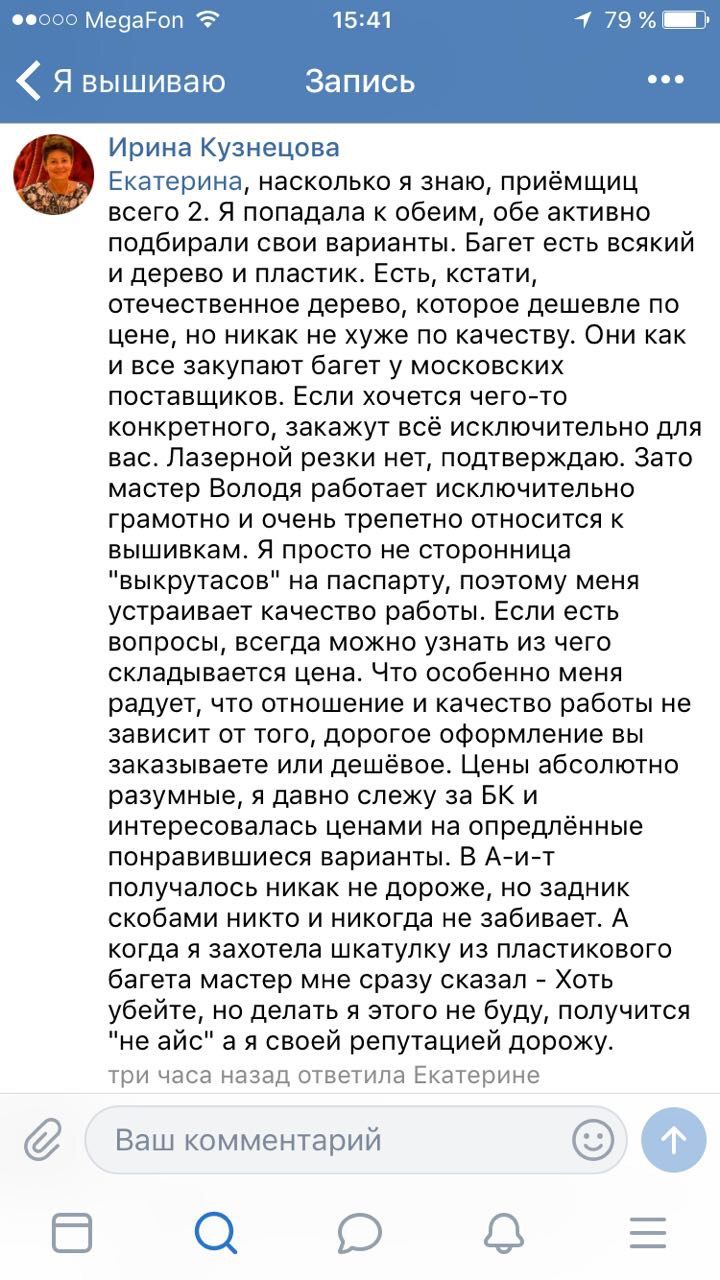 12 января 2018 16 минут назад, Иришек сказал: Я давно пользовалась багетной мастерской Арт и точка. В вашу обратилась после посещения Формулы рукоделия, получив как и все остальные скидку 50%. Если вы заметили, то Арт и точка и Золотой лев расположены на расстоянии 500 метров друг от друга, они обе удобны мне просто территориально. Качество работы в Арт и точке меня всегда устраивало, но я вообще люблю эксперименты, иначе невозможно найти "свою" мастерскую. Впечатление от вашей мастерской испорчено навсегда. и если бы я видела в нужное время правдивые отзывы о вашей работе, я бы сохранила свои нервы, время и деньги. Поэтому я не хочу, чтобы кто-то ещё прошёл по моему пути. Вы лично могли вмешаться в эту историю давным давно и исправить всё. Но не сделали этого. Вместо этого я вновь столкнулась с молодым человеком, который (после звонка Айвора, как я понимаю) вновь объяснил мне, что никакой проблемы в оформлении он не видит, пятно на вышивке поставила я сама, я сама выбрала багет с мелкой четвертью, который не подходит к оформлению вышивки, я сама виновата в том, что не знала, что этот багет имеет разную фактуру по длине, а приёмщица вообще не обязана смотреть на то, что я сдаю, и предупреждать об особенностях багета тоже не должна. Ей всё равно! Она мне вообще ничем не обязана! Необходимость герметизировать стыки - это моя придумка. Сделать тросик аккуратным замотав его хотя бы скотчем, чтобы торчащая во все стороны проволока не обдирала руки - это вообще никто не делает и т.д. и т.п. А когда работу вскрыли - она была расчерчена ПРОСТЫМ карандашом!!!! О каком следовании правилам и соблюдении норм вы говорите? И это всё ещё в манере общения "эффективного менеджера", с напором, с постоянным повторением, что мне никто ничего не должен. И даже то, что мне русским языком пообещали всё-таки сделать в течении 5 дней, мне так и не сделали, сейчас уже и не помню. кажется где-то за месяц.... Если бы я одна осталась недовольна - это один вариант, а нас таких полно. И это только те, кто активны в инете, а сколько ещё вообще никому неизвестно. Единственное, что я слышала - виновата что, не знала, виновата, что не спросила, виновата, что не потребовала. виновата, виновата, виновата... А достаточно просто было взять и переделать. И тогда я бы много месяцев назад написала - Хоть мне и не понравился первоначальный результат, но мастерская всё исправила. И ВСЁ, больше никакой дискуссии. Но этого не случилось. Арт и точка вам не конкуренты. Они тихо и спокойно выполняют свою работу. Делают это качественно, в срок, приятны в общении, трепетно относятся к вышивке, отвечают за свои обещания. девушки приёмщицы вкладывают душу в подбор оформления, звонят. если возникают вопросы по ходу работы. Я там не чувствую себя виноватой в чём-то, я знаю, что отдала свой труд в руки профессионалов, я спокойна. И это самое главное. каждый клиент, который ушёл от вас, нашёл ДРУГУЮ багетку и оформляется там. Сообщество вышивальщиц очень тесное, первое впечатление бывает один раз и репутация решает всё. Пообщаться лично вы могли много месяцев назад, но не захотели, а теперь я лично смысла не вижу. Удачи Вам в «нелегком деле». Поделиться сообщением Ссылка на сообщение