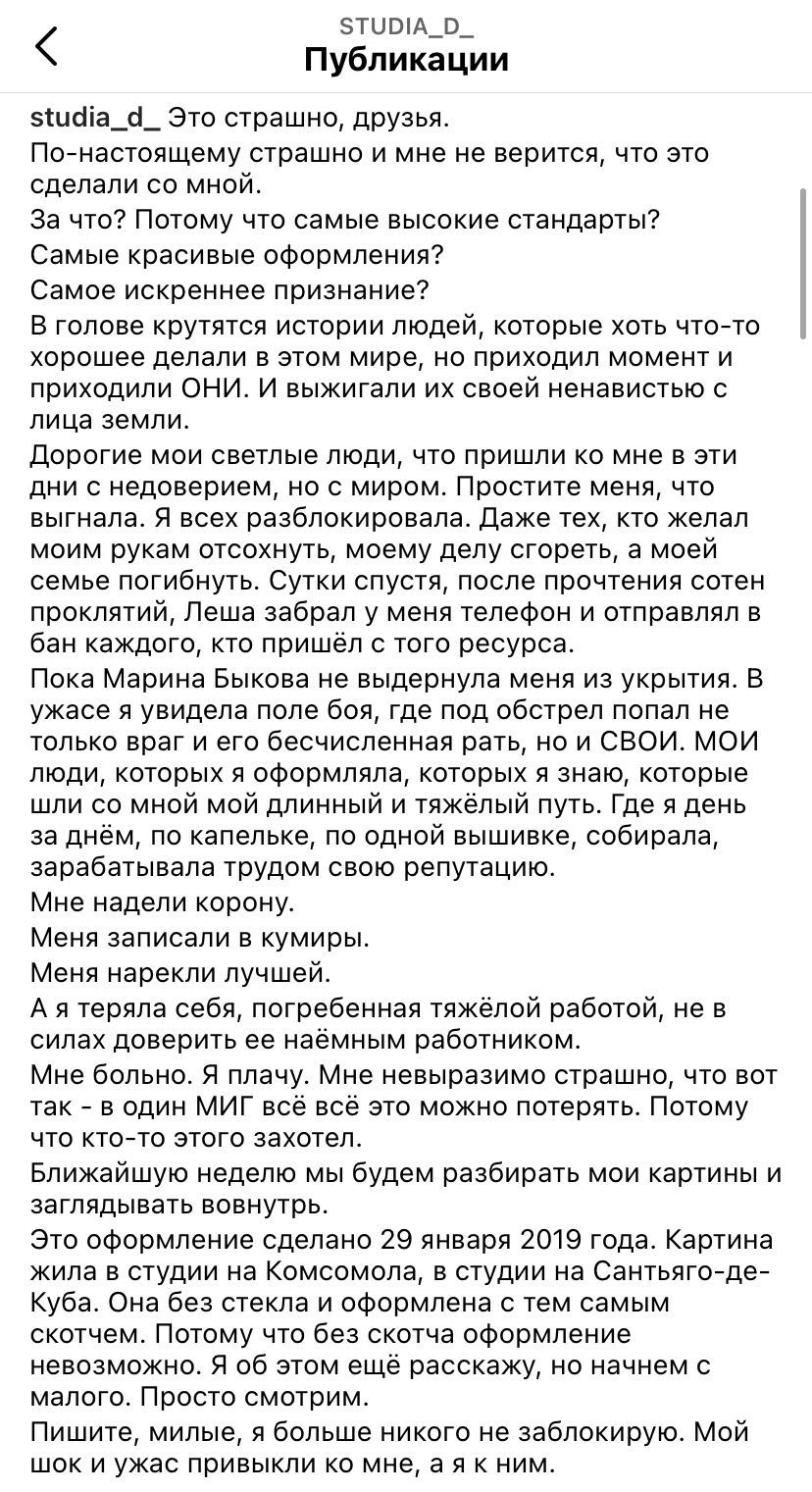16 марта 2021 3 минуты назад, Natik_V сказал(а): Я не говорю, что Настя права в том, что использовала скотч и не предупредила, но оформлена работа была практически идеально, все чистенько, аккуратненько и ровненько, то, что цвета немного не совпадали с фото - это издержки дистанционки и Галя, наверное, догадывалась, что абсолютной цветопередачи не бывает, вышивка не испорчена, ничего непоправимого не произошло, а человека реально затравили, причем в большинстве своем люди, которые никогда ничего у нее не оформляли. Извините, но я вижу травлю заказчика, начиная от отправки её в бан, заканчивая демонстрационным видео сегодня. Человек, которого словили на вранье, вместо того чтобы признать свою вину, извиниться и погасить скандал, пытается сделать хейтером и неадекватом пострадавшую сторону. Это очень глупо и непорядочно. ss_kosareva, legostaeva, Irysia и 18 других сказали спасибо Поделиться сообщением Ссылка на сообщение