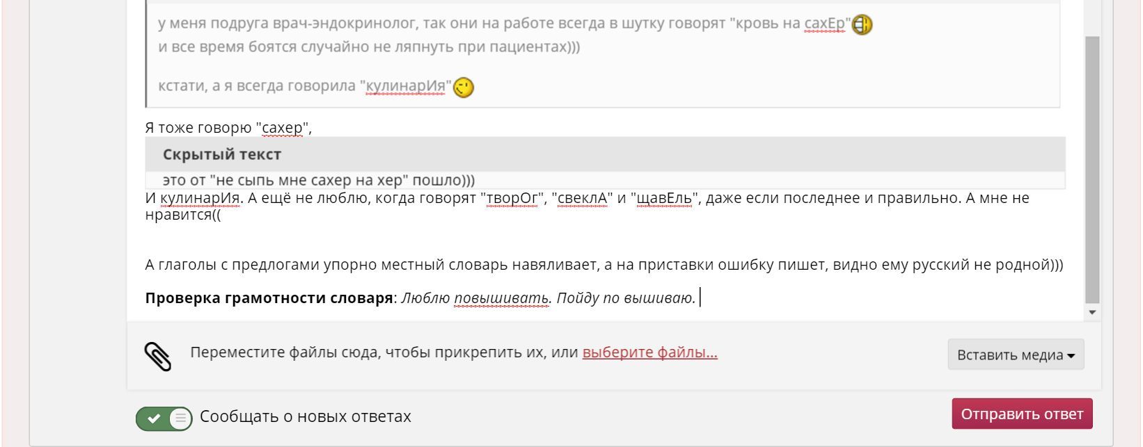 16 декабря 2015 6 часов назад, niksi сказал: ну я уж не помню где, но мне резануло - там вышивку хотели "освЕтить" Хорошее решение, я щщитаю! Люблю, когда вышивка хорошо освещена! 6 часов назад, niksi сказал: у меня подруга врач-эндокринолог, так они на работе всегда в шутку говорят "кровь на сахЕр" и все время боятся случайно не ляпнуть при пациентах))) кстати, а я всегда говорила "кулинарИя" Я тоже говорю "сахер", Скрытый текст это от "не сыпь мне сахер на хер" пошло))) И кулинарИя. А ещё не люблю, когда говорят "творОг", "свеклА" и "щавЕль", даже если последнее и правильно. А мне не нравится(( А глаголы с предлогами упорно местный словарь навяливает, а на приставки ошибку пишет, видно ему русский не родной))) Проверка грамотности словаря: Люблю повышивать. Пойду по вышиваю. Людмила Мизина, Krelina, niksi и 1 другой сказали спасибо Поделиться сообщением Ссылка на сообщение