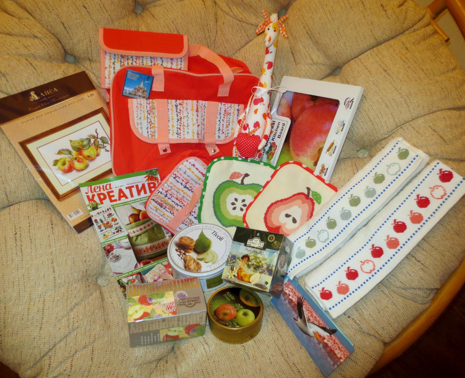 11 сентября 2014 Это не сюрприз а настоящий сюрпризище!!! Так все подобрать в одной тематике!!! Великолепно!!! Если Жене пришли морковки, Тане вишенки, мне же достался яблочно-грушевый микс, такой урожайный и осенний! Даже не поверилось ,что все пришедшее уместилось в одной коробке. Внутри лежали вкуснючие чаи грушевый и яблочный (такой из груши уже пила, он очень вкусный). Из сладенького яблочная карамель и печеньки с грушей! Стоило мне только отвернутся, к другим сокровищам, как муж тут же утащил леденцы и печенюшки и спрятал в карманах толстовки. Отдавать обратно не собирается. А я уже придумала применение жестяным коробочкам в рукодельном хранении. Лариса, спасибо за чудесные пожелания на открытках, так приятно (на каждой открытке свое пожелание, связанное с изображенным животным)!!! А еще в сюрпризе целый дорожный комплект: сумка, большая косметичка и маленькая. Яблочная доска и магнитик с Ижевском Опять же яблочный набор для вышивание и журнал с целой кучей идей на тему урожая! И самое интересное - рукодельная часть. Полотенчики чудесные! Они обязательно поселятся на кухне, но пользоваться ими буду в исключительных случаях. Вышитые прихватки, с грушей и яблоком Очень яркие и позитивные, и обратная часть с веселым горохом! Жалко такой красотой будет пользоваться, будут кухню украшать! А этот малыш просто покорил моё сердце. Такие игрушки очень нравятся, но сама их делать не умею. И самое главное он весь в яблоках! И общий вид сюрприза Лариса, спасибо, спасибо и еще раз огромное спасибо!!! За такие подарки , за прекрасное настроение и чудесные пожелания!!! Присоединяюсь к поздравлениям! Замечательные подарки и так всё продумано!!! elis и Чивава сказали спасибо Поделиться сообщением Ссылка на сообщение
