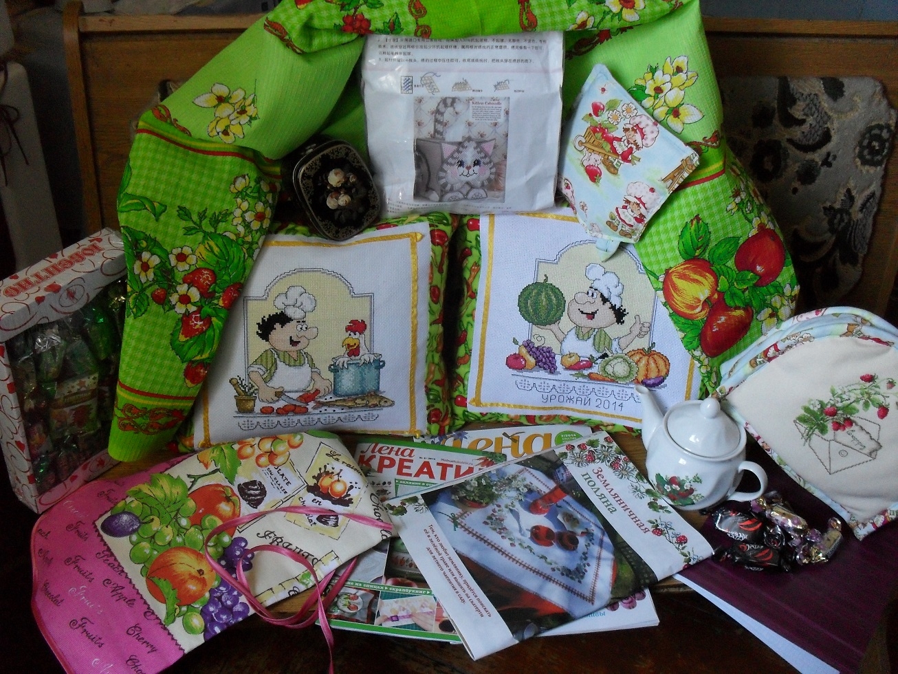 19 сентября 2014 Ура! Получила и я свой кусочек счастья! Мне пришел сюрприз от Леночки (suhorab). А "кусочек" - это потому, что все мое счастье не вошло в одну коробку (Лена писала об этом) и пришлось отправлять "в двух частях". Почта раскидала две части моих подарков и мне пока пришла только небольшая их часть. Но, в связи с моим отъездом, наша добрейшая Татуся показала мне, что же меня ждет и разрешила отчитаться досрочно. Вот сколько у меня чудес, сделанных Леночкиными руками Чудесные подушечки Я очень люблю этих веселых поварят! Все не доходили руки их вышить, и вот они у меня Совершенно потрясающая для меня вещица - грелка на заварник! И в ней чайничек (а в чайничке - конфетки ). А еще из такой же ткани, как грелка - прихватка с милейшей девочкой-огородницей (это, наверное, я, в мечтах о дачке ). А еще огромное количество всяких приятнейших вещей: вафельная ткань с рисунками яблочек и ягодок, набор для вышивания коробочки-котика, две полезнейшие книжки по цветоводству, красивейший фартук (ох, чувствую, Дарья его у меня утащит на уроки домоводства), журналы по рукоделию, чай в жестяной коробочке, сантиметр-рулетка в форме сердечка. Ох! Даже перечислять устала. Лена, большущее-большущее тебе спасибо. Сюрприз доставил мне огромную радость, удивление, восхищение, восторг и остальные эмоции в превосходной степени! Какие великолепные ДАРЫ ОСЕНИ! Лена и Марина, поздравляю обеих! Маняша и suhorab сказали спасибо Поделиться сообщением Ссылка на сообщение