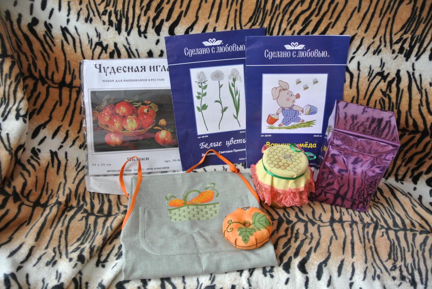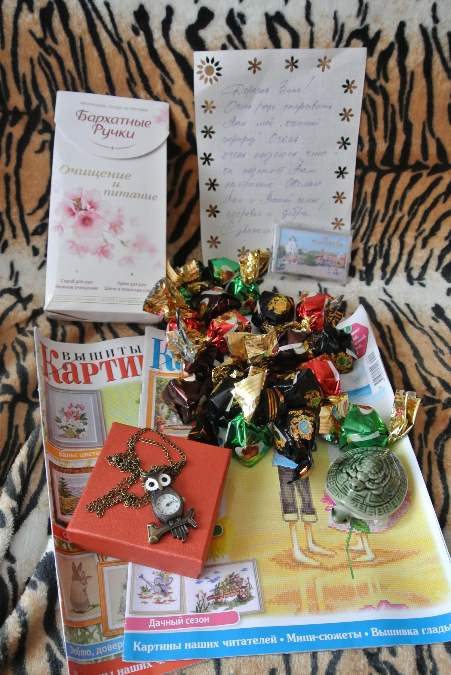 23 сентября 2014 Забрала я посылочку с почты, 1,5 кг счастья И почувствовала себя немного сумасшедшей, когда распаковывала и рассматривала подарочки, то сидела с широченной улыбкой на лице, которая не хотела исчезать. Наташа - FEDOR63 огромное тебе спасибо за такое количество шикарных подарочков!!!!!! Начну по порядку и так вышивальная часть: фартучек с корзинкой с морковкой Все крестики супер-аккуратны, не представляю как ты это чудо вышивала уже примерила фартук (фотографировал сынок, так что что имею ) подушечка тыковка и баночка с медком с вышивальной крышечкой на эту тыковку я уже давно засматривалась и иметь у себя дома баночку с медом моя давняя мечта и все вместе еще Наташа мне прислала 2 схемки от Сделано с любовью, чудный набор с яблочками от Чудесной иглы (мне очень понравился еще и тем , что яблочки на черной канве, давно хотела попробовать ее на зуб) и 2 журнала Вышитые картины Из не вышивальной части то же все обалденно: конфетки, магнитик, кремики для моих ручек. Супер черепашка, у которой шевелятся головка и ножки и которая катает х своих деток. И супер совушку-кулочкик-часы а вот в какие коробочки все было уложено и весь сюрприз вместе Зина, как я переживала! Хорошо, что сюрприз у тебя и даже мёд доехал! Спасибо за фотоотчёт! Ух, надо в себя ещё прийти))) Юла, Сметанка и Пикусёнок сказали спасибо Поделиться сообщением Ссылка на сообщение