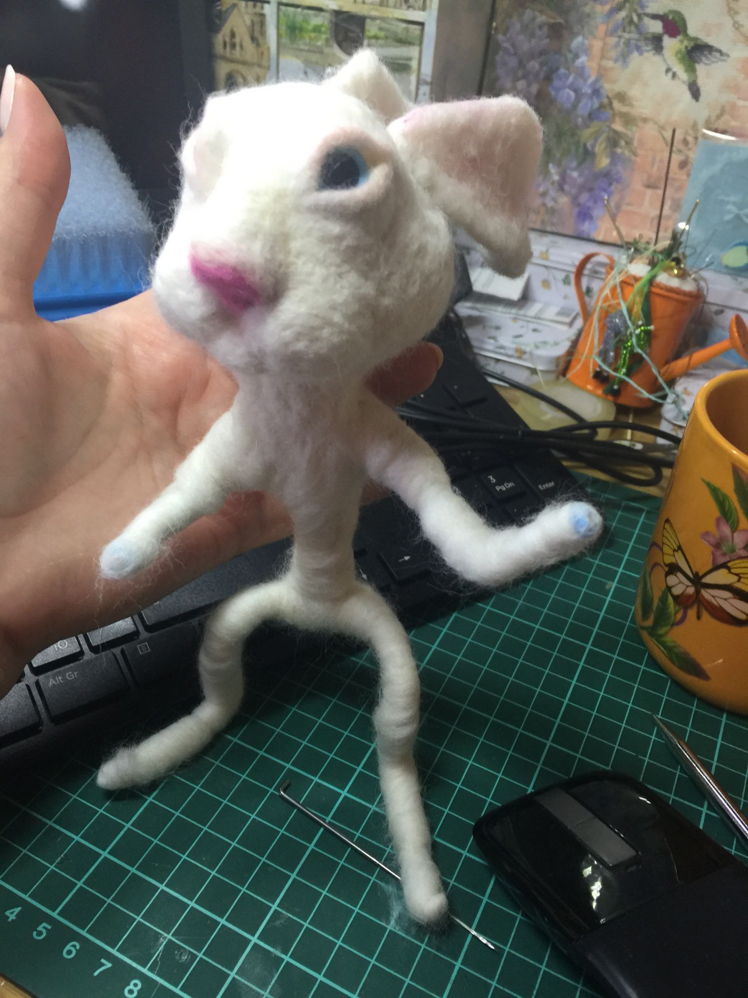 22 декабря 2016 Всем привет! Добрался мой сюрприз до адресата, чему я несказанно рада))) История о самом сюре рассказана ооот тут. Тема сюрприза была - Алиса в стране чудес) А я вам покажу процессы) Основной элемент была, конечно, вышивка) и выбран был сюжет от Катерины Бесперстовой. Отшивался с 3 ноября по 1 декабря в цейтноте)) т.к. оказалось, что вышивать то дофига Шила на Мурано, ниточками ДМС по ключу) Извиняюсь за много фото, но я все протоколировала)) В дополнение к главному элементу, попутно решила еще попробовать новый вид рукоприкладства - валяние) Опыта в этом деле у меня вообще никакого не было, но благо есть интернет и разные мастер-классы. Одним таким МК я и воспользовалась, но со своими небольшими изменениями. Небольшой процесс тоже успела сделать (для тех, кому интересно как это делается вообще): вначале был эскиз для ориентира по габаритам и прочее Далее делала голову отдельно Тельце на каркасе: Придумывали позу: и начинали уплотнять тушку: Соединили 2 части и далее уплотняем: Тельцо еще было уплотнено, но фото уже не делала. Далее шьем одежку, украшательства и вуа-ля: Небольшое видео по зайчику: 013.MOV ОльгаВл, Lakis, mamatata и 49 других сказали спасибо Поделиться сообщением Ссылка на сообщение