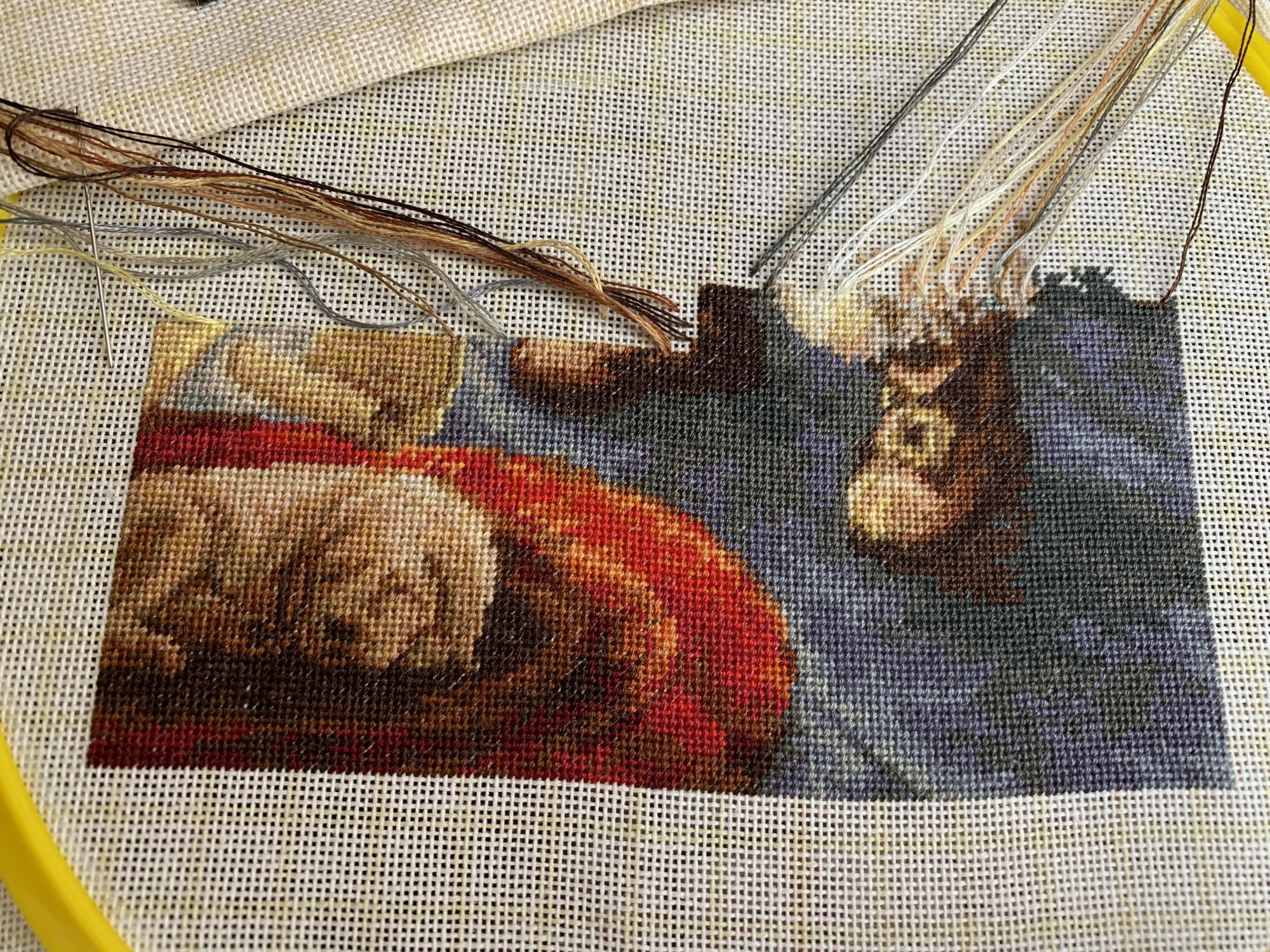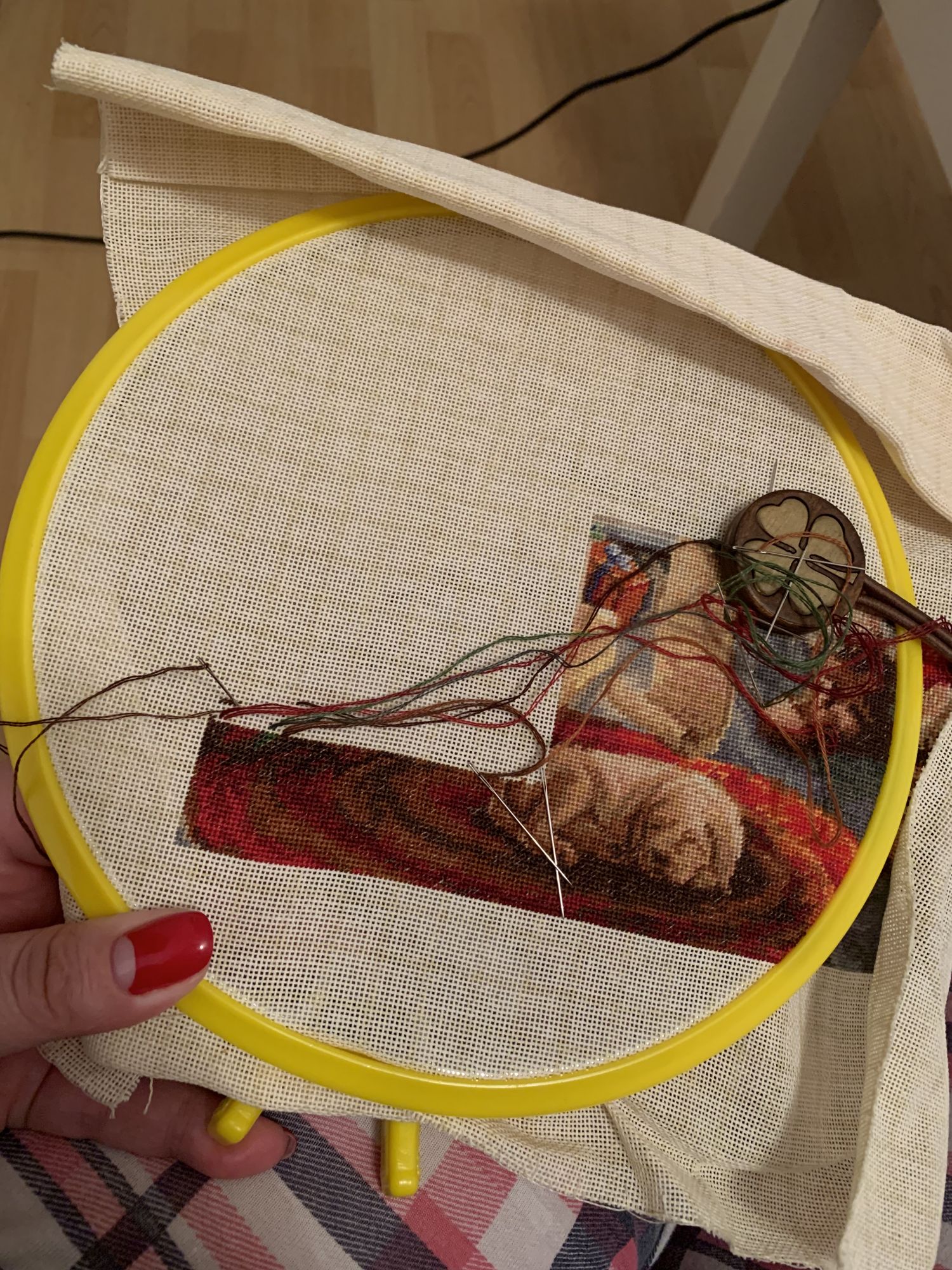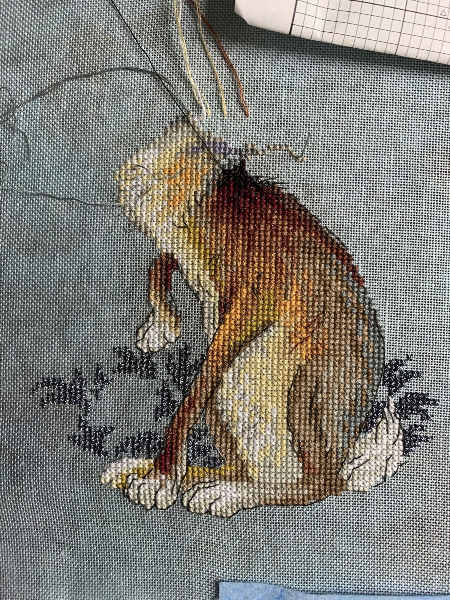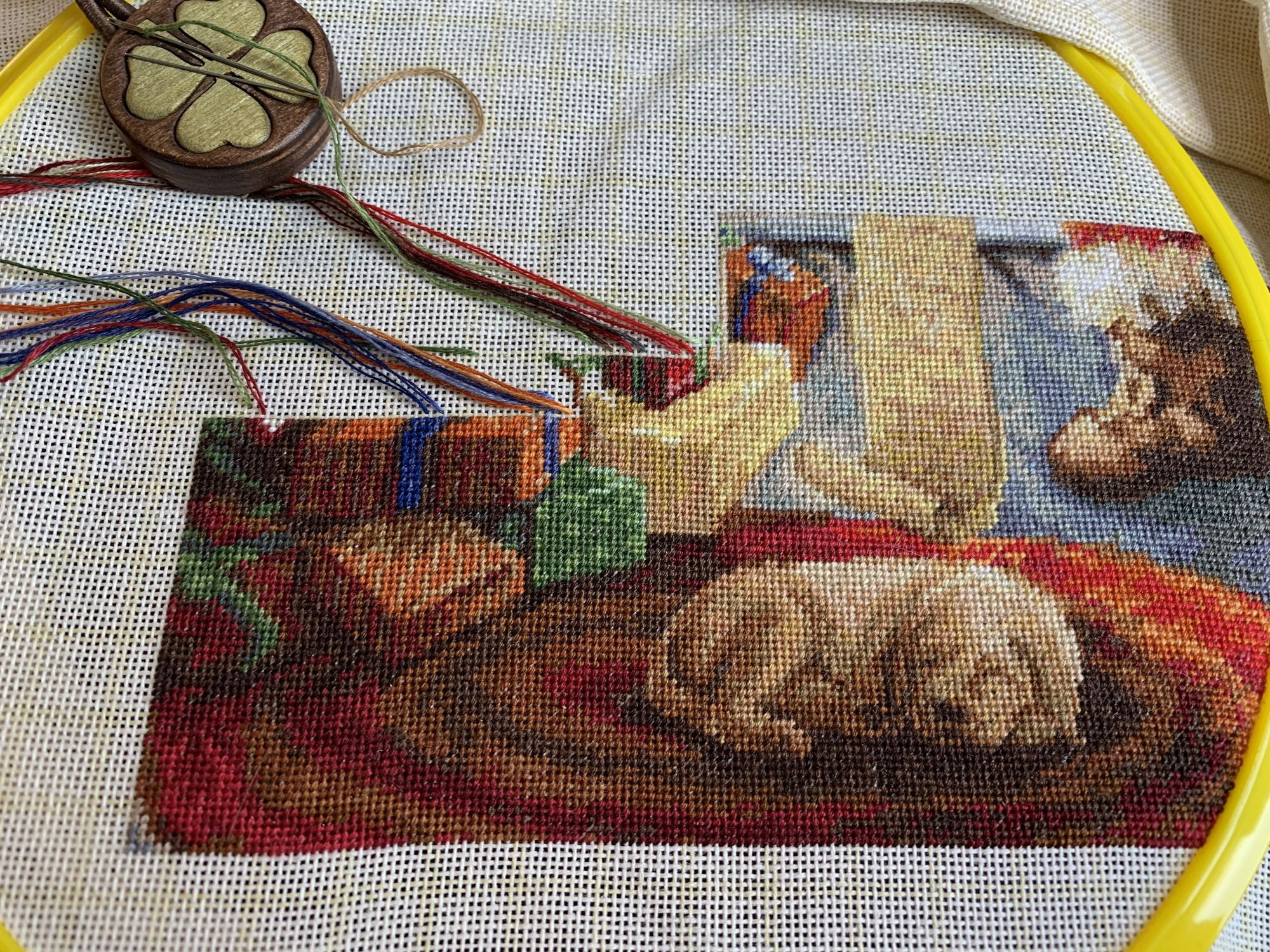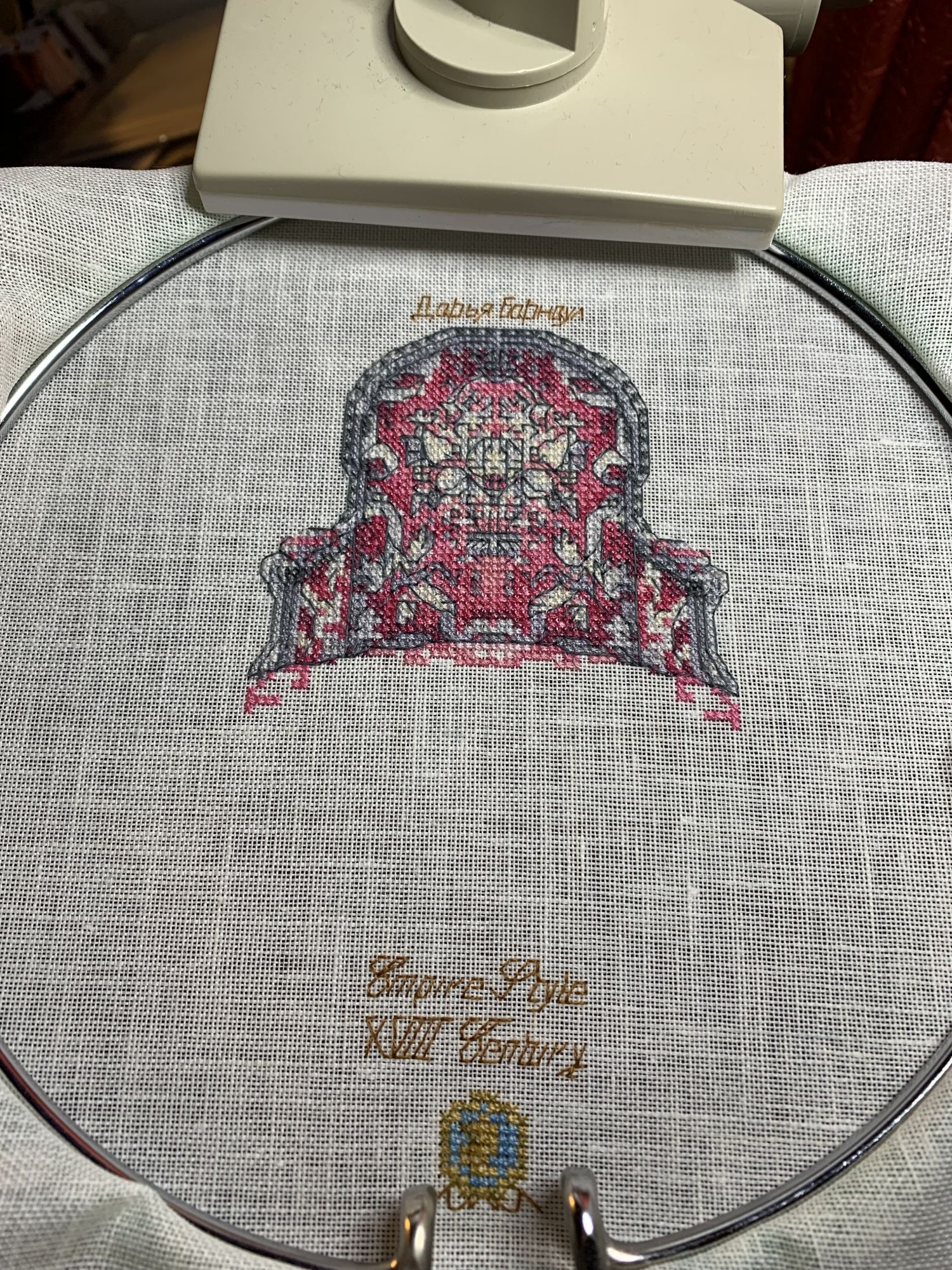 18 июня 2020 Продолжим тогда) 1. Закончилась моя столярная эпопея в Робине. Ох, даже номер уже не помню, но помню, что мне оставалось вышить 1,5 стула. Золотой стул полностью: а вот у этого половина нижняя: Тяжело шьются и схема неудобная немного - глаза в кучу всегда. Так "наигралась" с ними, что отложила в сторону, даже не постирав. Возможно, этому поспособствовало еще то, что пробные 3 рамки, что покупались под них (не знаю, как я так мерила все) - оказались малы....и с этим теперь надо что то делать) 2. На одном дыхании отшилась косметичка, что мне когда то давным-давно дарила наша Цыпуля) 3. "Дело было в январе" закончилось гораздо раньше, даже января не ждали)) забавный зритель, что мешался периодически и лез под руку. Морда недовольная, т.к. я ее настоятельно прошу покинуть мое поле зрение и дать маленько повышивать: Ну и финальная часть: 4. Этот набор от RTO купила на ФР осенней, как и отрез ткани, на которой решила его вышить. Процесс начала снизу: Почему то не нравился такой контрастный черный бэк, что решила его заменить на угольный черный и взяла для этих целей нить DMC 3799. На фото можно разницу посмотреть (если увидите))): сверху - черный, снизу - 3799. Мой внутренний перфекционист остался довольным и продолжил шить дальше: кофе-брейк из чашечки, что также на ФР осенней приобрела. Продолжаем: категорически не понравились те одуванчики, что были предложены, поэтому исправляла, как мне казалось органично что ль: а так предлагалось в дизайне: Использовала Whisper для основы одуванчика, немного крейника 32 и золотая нить от DMC. Правый верхний одуван не стала делать, как и зонтики от одуванчика. Итогом довольна. Мне кажется так как то гармоничней что ли. На основе осталось еще место, под которое я планировала вышить еще стрекозу - ту же новинку от РТО. irisheckin, ture, Кисуля и 23 других сказали спасибо Поделиться сообщением Ссылка на сообщение