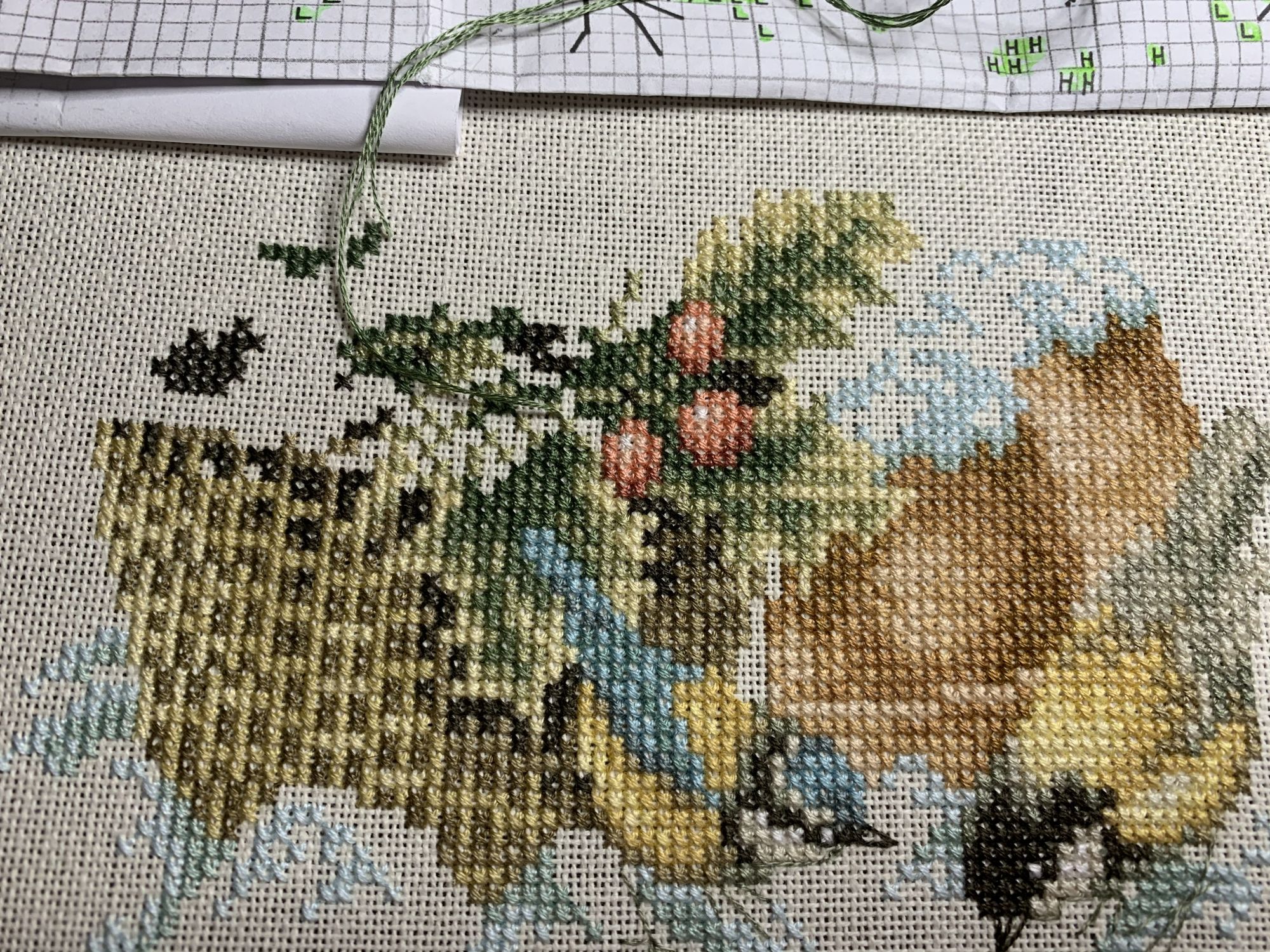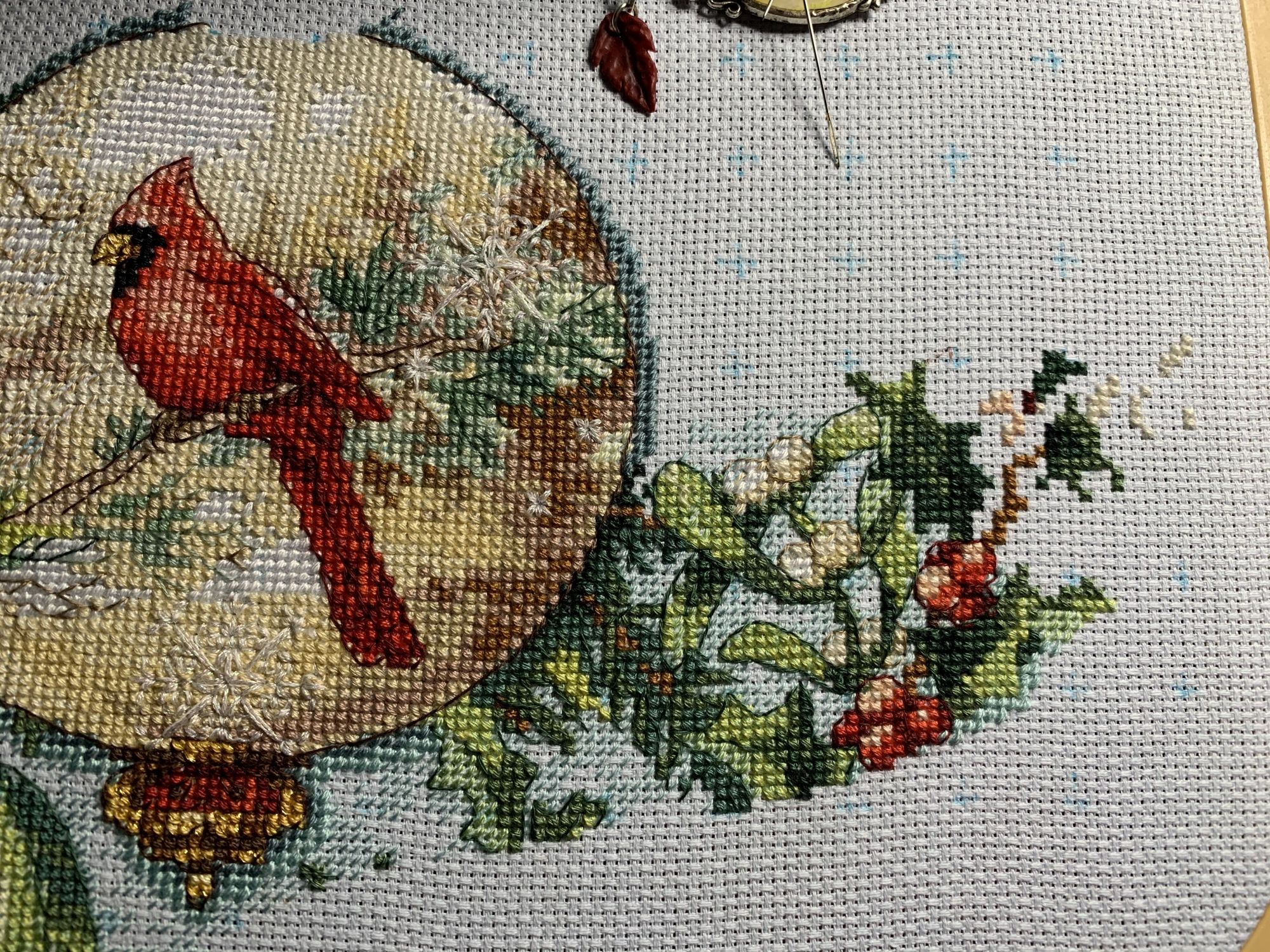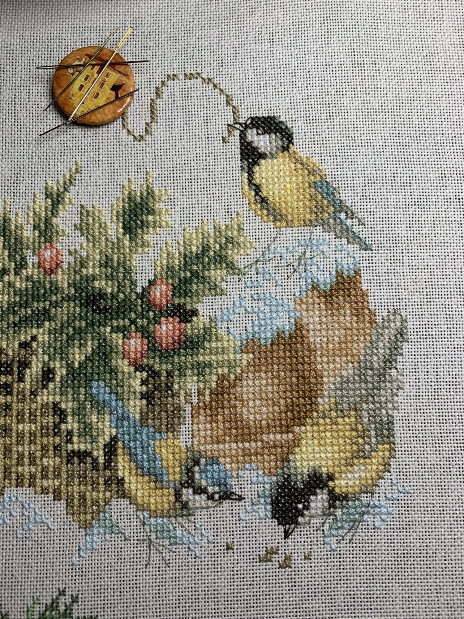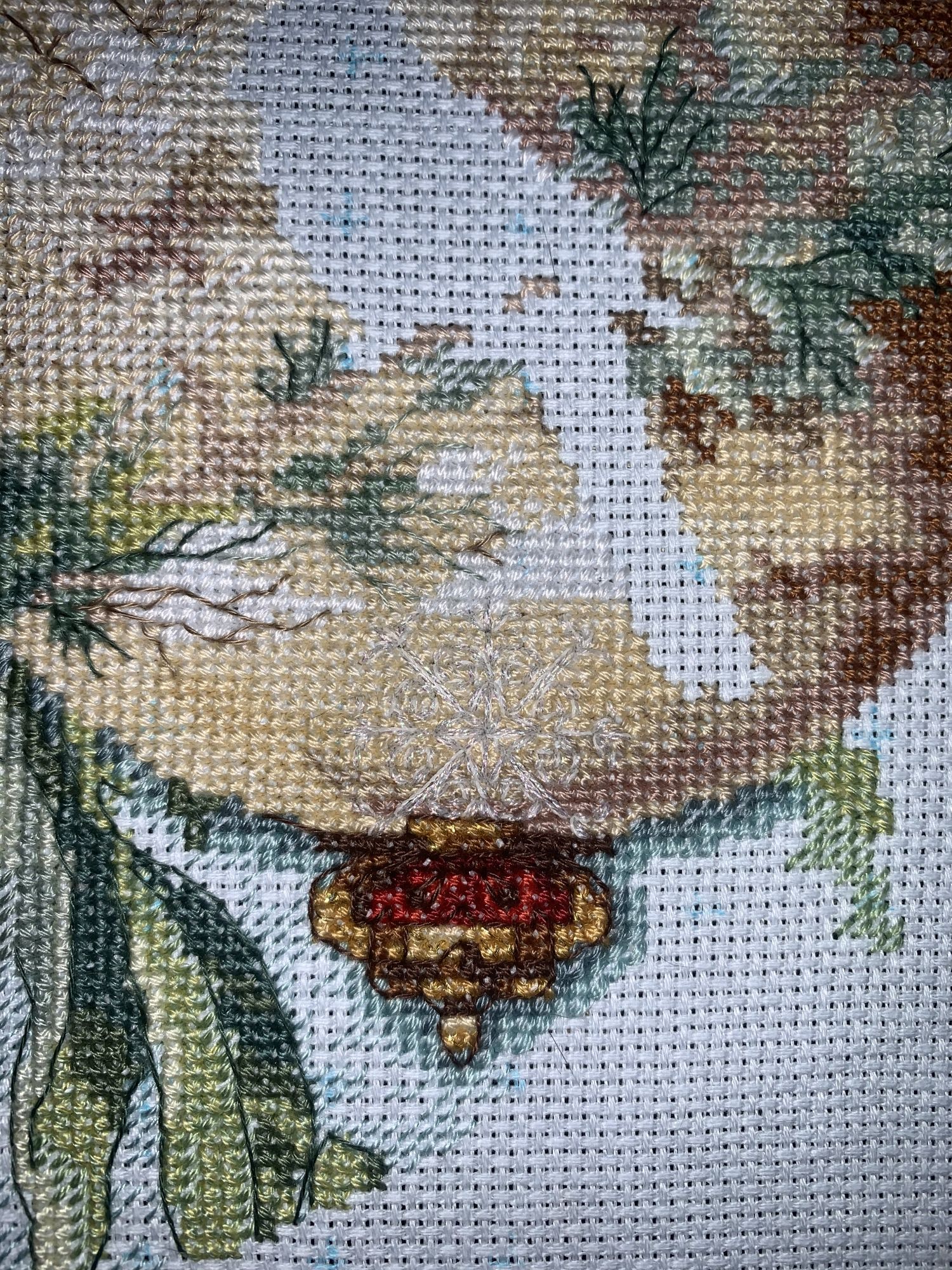 28 октября 2021 Привет! Что-то никак не получается себя дисциплинировать и начать систематически делиться своими продвижениями и финишами. Пойдем от обратного и покажем, что начала вышивать из последнего и продолжаю сейчас. - LetiStitch 8005 Jolly Saint Nick, 22х29, аида 16, счетный крест Поскольку сюжет с неполной зашивкой, то как-то рука сама дернулась поискать альтернативу какую-то равномерную. Выбор в этом цвете не богат, да и плюслм пошлО то, что не было еще опыта работы с Monika 28ct. В общем, сравнение основ: Сверху/слева -Моника, снизу/справа - родная: искусственное освещение - А-ля "естественное" - Далее пошло начало процесса: а тут снова эксперимент. Если посмотреть на картинку набора, то тень от венка предлагается шить полукрестом в темно-синим цвете. Вот попробовала кусочек(слева): . Но поскольку основа у меня светлее на тон-два, чем родная, то решила и в этом месте светлее вышить: смешала предлагаемый синий цвет с зеленым (из набора же). Результат мне больше нравится. Поскольку я ленивая, то шью бэк и пришиваю бисер сразу: Прикольный яркий дядька вырисовывается! А все самое вкусное - впереди оленек, татьяна0674, Nyurka-86 и 17 других сказали спасибо Поделиться сообщением Ссылка на сообщение