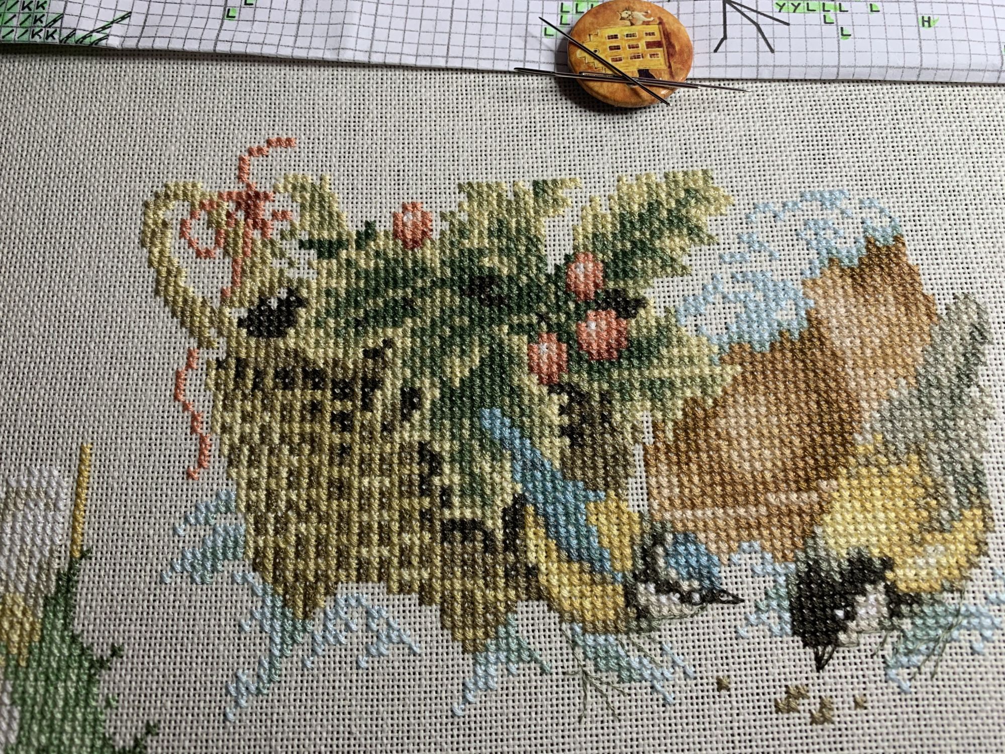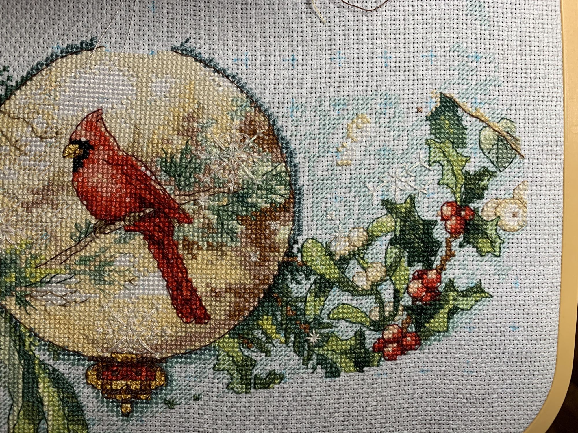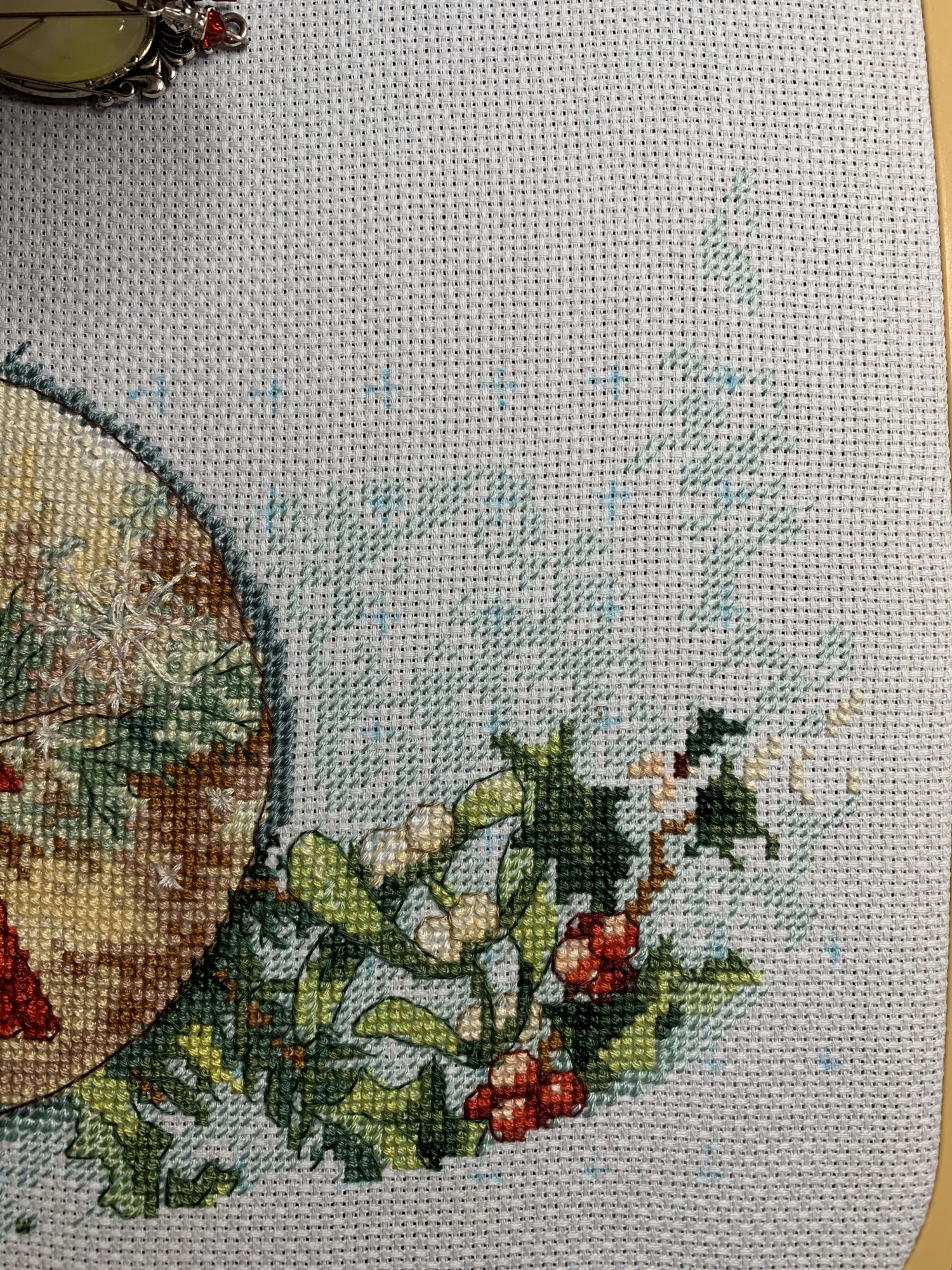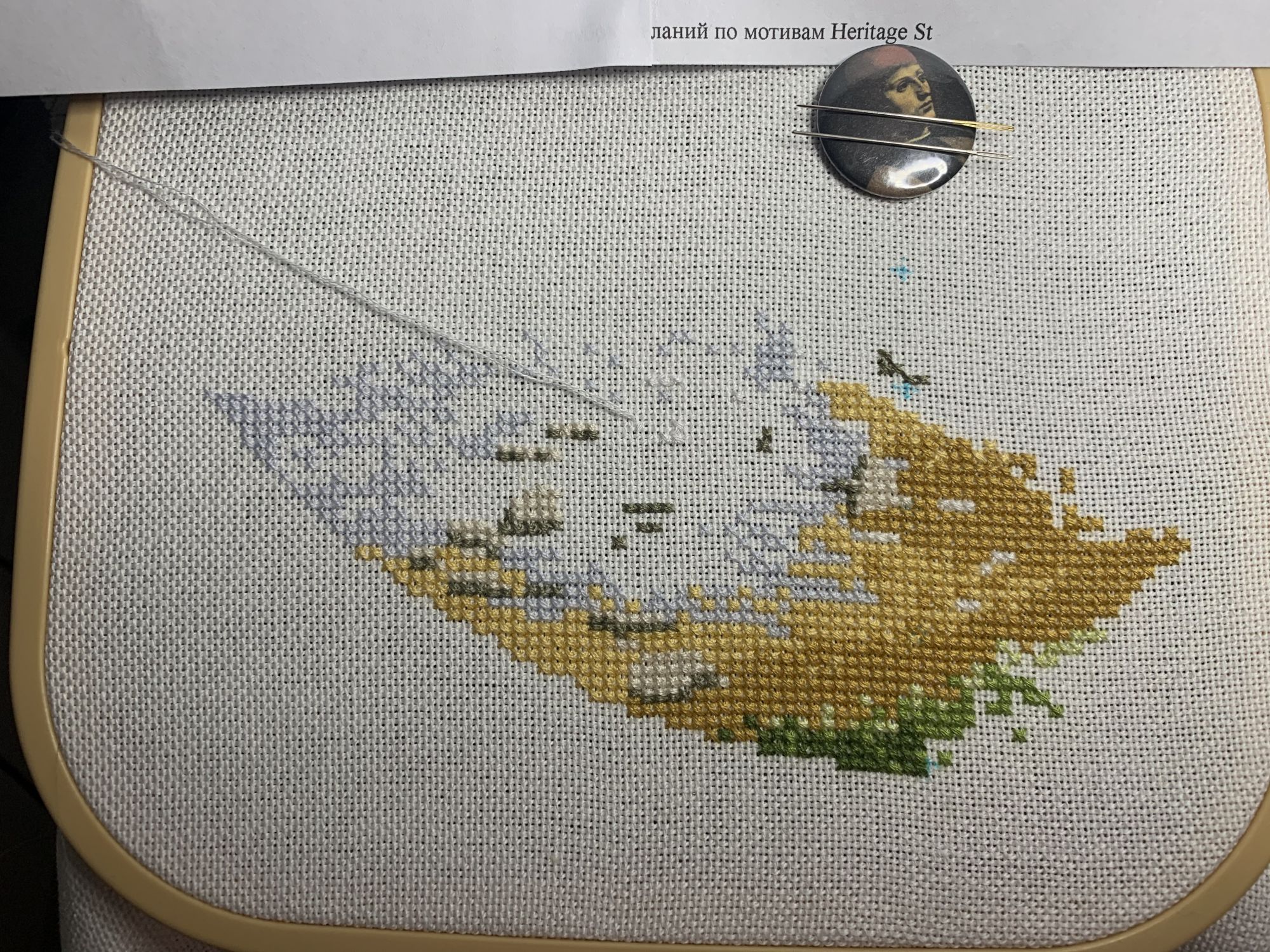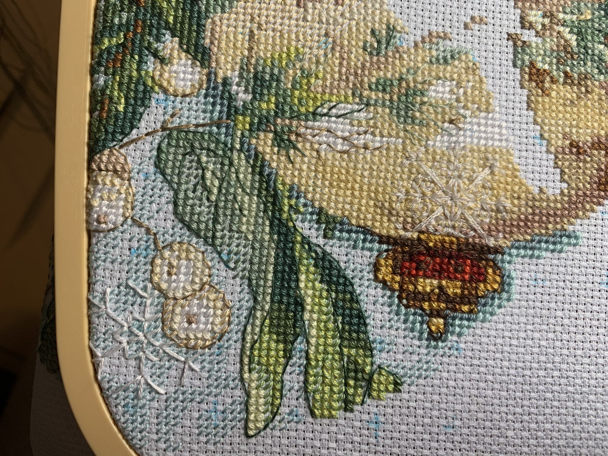 28 октября 2021 Привет! Что-то никак не получается себя дисциплинировать и начать систематически делиться своими продвижениями и финишами. Пойдем от обратного и покажем, что начала вышивать из последнего и продолжаю сейчас. - LetiStitch 8005 Jolly Saint Nick, 22х29, аида 16, счетный крест Поскольку сюжет с неполной зашивкой, то как-то рука сама дернулась поискать альтернативу какую-то равномерную. Выбор в этом цвете не богат, да и плюслм пошлО то, что не было еще опыта работы с Monika 28ct. В общем, сравнение основ: Сверху/слева -Моника, снизу/справа - родная: искусственное освещение - А-ля "естественное" - Далее пошло начало процесса: а тут снова эксперимент. Если посмотреть на картинку набора, то тень от венка предлагается шить полукрестом в темно-синим цвете. Вот попробовала кусочек(слева): . Но поскольку основа у меня светлее на тон-два, чем родная, то решила и в этом месте светлее вышить: смешала предлагаемый синий цвет с зеленым (из набора же). Результат мне больше нравится. Поскольку я ленивая, то шью бэк и пришиваю бисер сразу: Прикольный яркий дядька вырисовывается! А все самое вкусное - впереди оленек, татьяна0674, Nyurka-86 и 17 других сказали спасибо Поделиться сообщением Ссылка на сообщение