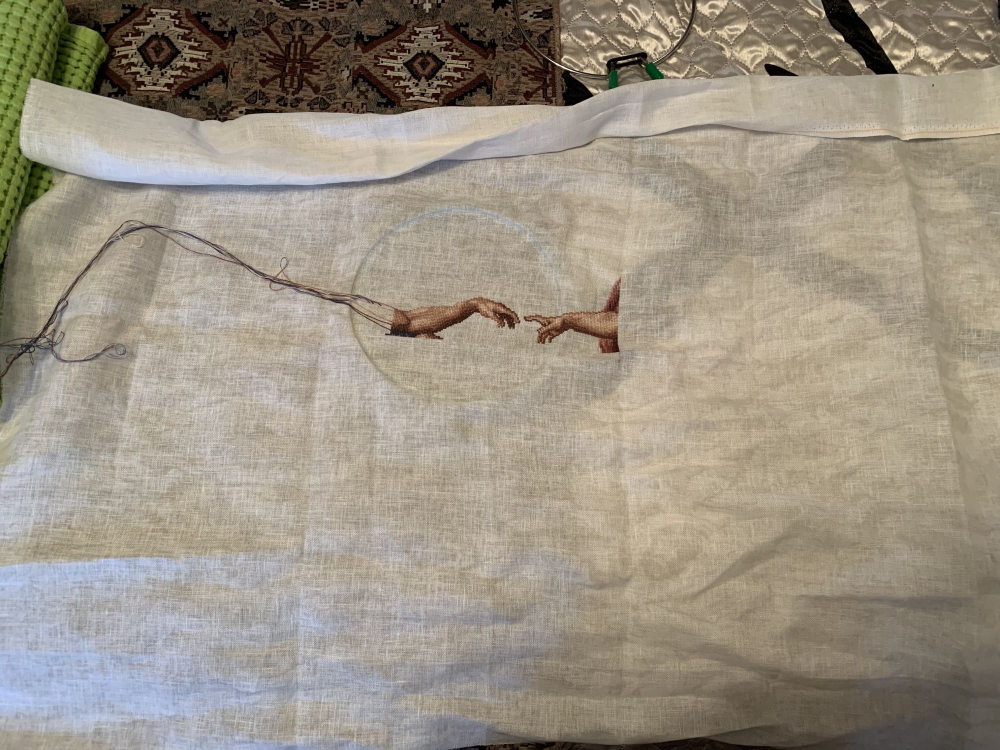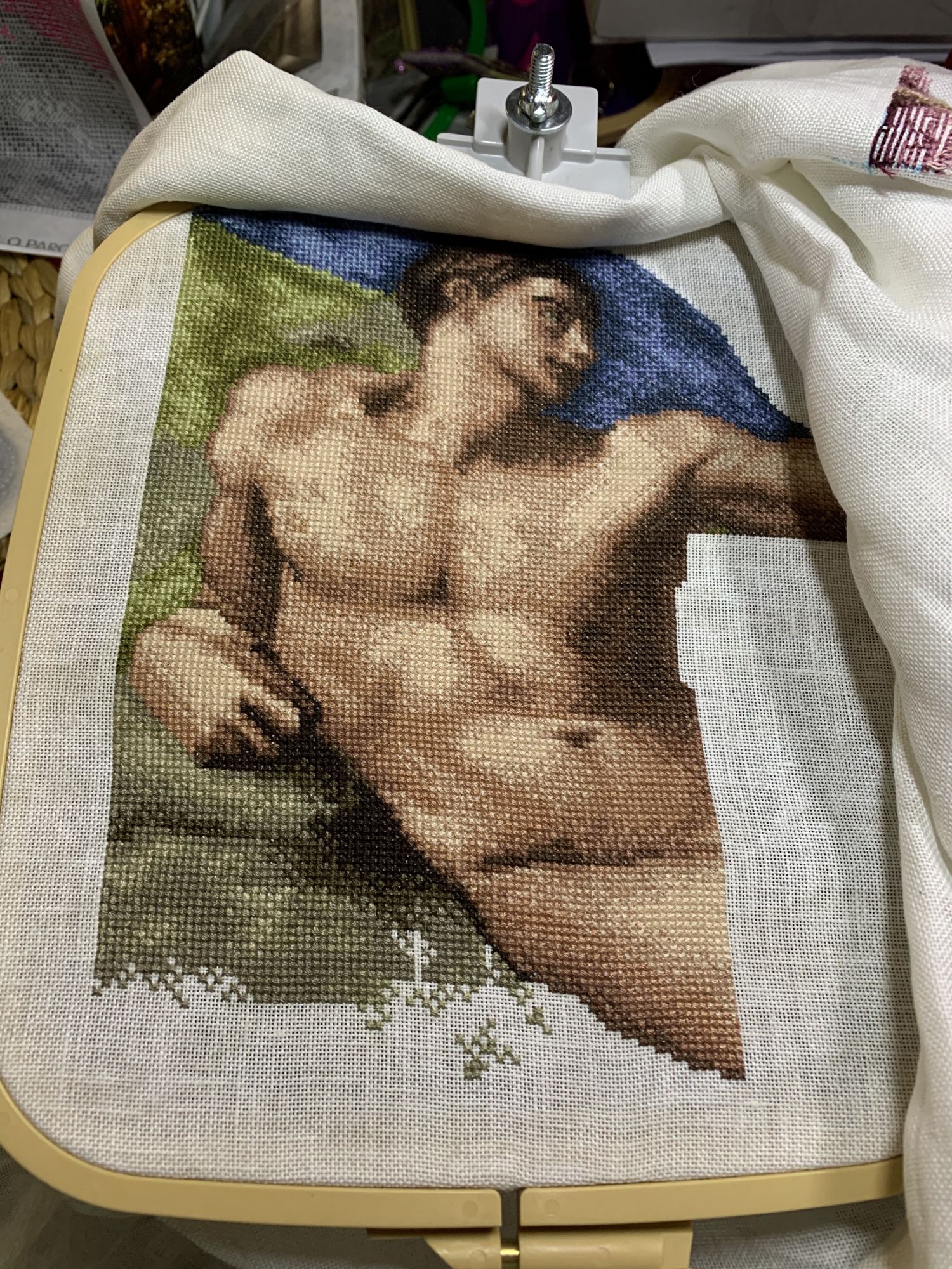 1 июня 2021 Всем привет! Смахнем немного пыли в этот прекрасные первый день лета) Вот и дожили мы до него, с чем я вас и поздравляю! Нашилось за период с марта сего года немного вроде, но есть и пара законченных работ и продолжение старых. Но сегодня принесу свой Мега проект (по моим меркам), который я начала в прошлом году и забыла принести сюда)) Некогда кружился возле меня один оригинальный набор, но цена была настолько кусучей, что жаба заткнула моего хомяка, дав ему только пару мелких наборов, без этого гиганта. Сверчок же, тем не менее, в голове засел и когда желание вышить этот сюжет окончательно пересилило и придушило жабу, набор уже ушел из продажи окончательно ... а сверчок купил себе новую скрипку и продолжил усиленно наигрывать на моих желаниях нервах, всенепременно найти и вышить сей сюжет. Все, что мне удалось найти - это жуткий скан схемы с ключом. И вот, куплен отрез Belfast 1079 Дюнный неоднородный (Vintage Dune) размера 80x120 см, распечатаны все листы схемы, собраны нитки и ... забросили всю эту кучу в угол и стартовали только через 2 месяца, так как был канун НГ и шилось всякое тематическое. Встречаем !!! Lanarte 33470 Сотворение Адама по картине Микеланджело (в полном варианте). В оригинале набор выглядел вот так: (историю про жабу помним ). Все мы знаем отрывок из этой картины, который Lanarte оставил в производстве - 34532. Изюминка оригинала была, конечно же, в тонированной основе... эх, жаба-жаба Шить планирую долго и упорно, по настроению и без обязательств. Так как поняла, что оно так спокойнее будет и с охоткой - и такой подход у меня теперь не только в этом процессе, но и во всех остальных))) Было 2 захода, в общем, к данной работе) сейчас будет много фото, возможно, и с небольшими продвижениями Итак, Фигура 1. Стартовая. Завизировали старт у главного арбитра: Поехали: Главный элемент картины готов и переходим к участникам сделки) Естественно, тянет к молодому, стройному мужчине Дети еще могут находится у экранов)) Если от рук немного была не в щенячьей радости (хотя издалека смотрится вроде норм), то от лица и игры теней на теле - не могла глаз оторвать, как оно все нравилось) На этом часть 1 закончилась и следующая началась только через год, в период с марта по апрель сего года) Фигура 2. Тонкой гранью. Продолжение банкета было также на молодом и горячем) Дойдя до 2го угла, решила закончить этот заход на этой логической ноте. В следующей части этого блокбастера (надеюсь, не через год) будет не менее интересное продолжение) За сим, откланиваюсь и надеюсь, что в ближайшее время найду еще время и желание рассказать и показать завершения и продолжения, что случились) OlkaY, Каори, maui и 22 других сказали спасибо Поделиться сообщением Ссылка на сообщение