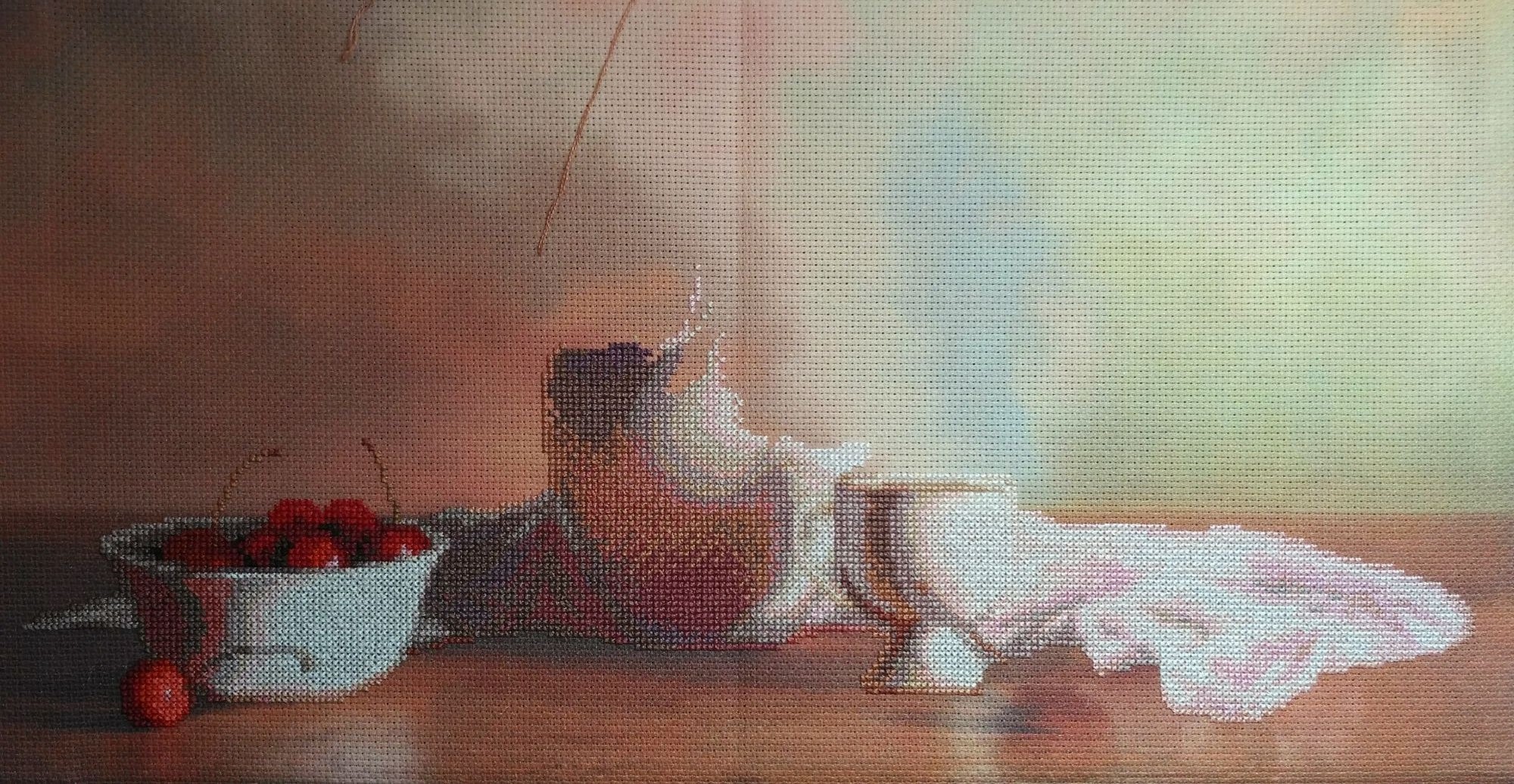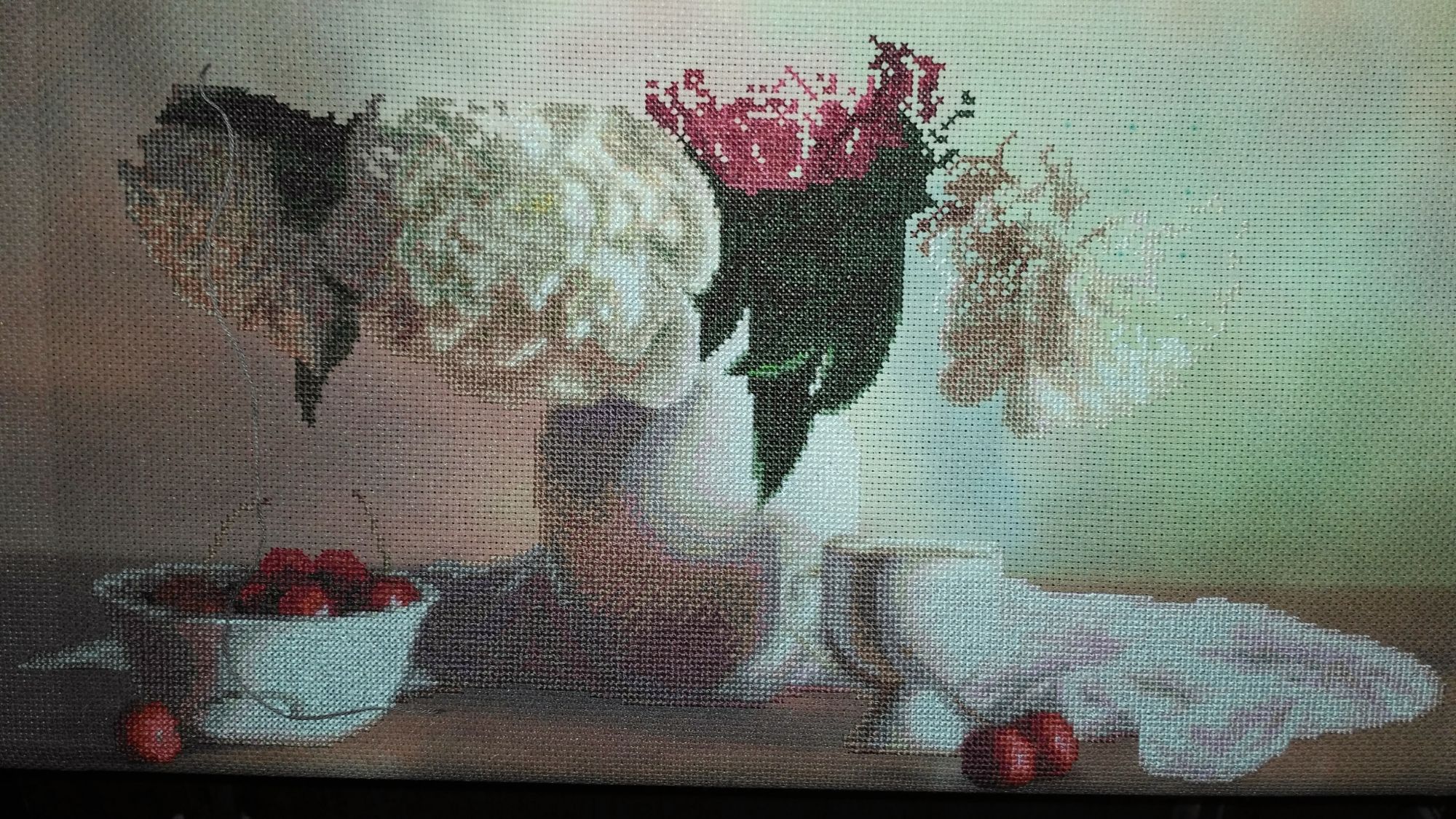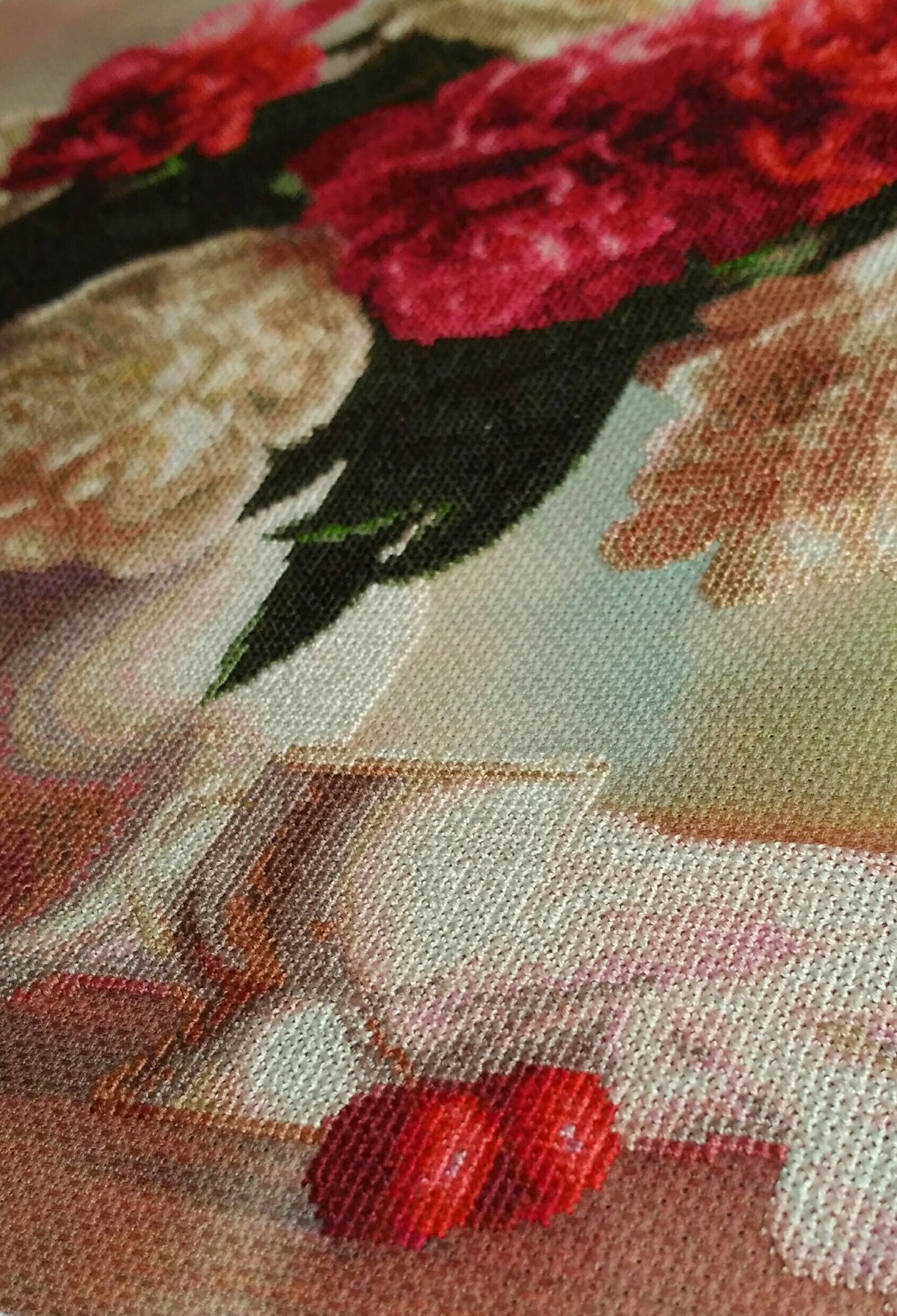 25 февраля 2017 На этой неделе начала свеженький процесс, Пионы и розы Юнона. Шикарный дизайн, мечтала о нем давно, купила в прошлом году, но руки дошли только сейчас. Первая моя работа на тонированное канве. Она необыкновенно красивого цвета. Ниточки тоже яркие блестящие, всего 66 цветов. Схема понятная на 6 листах А3.Сначала вышивать было непривычно, работа начинается от метки- кружочка внизу слева. Он находится в самом темном месте канвы, а я на такой никогда еще не вышивала. Пришлось привыкать, в дырочки не сразу попадала. Потом крестики получались какими-то не ровными, оказалось игла островата из набора, заменила и все пошло, как по маслу. Получается очень натурально! Вишенки такие выпуклые, глянцевые. А как продуманы отражения на тонированной канве от ягодки и чашки... Это ж чудо какое-то!!! Мой маленький результат за 5 дней. ЛАДОМИРА, Любушка1985, smarko75 и 3 других сказали спасибо Поделиться сообщением Ссылка на сообщение