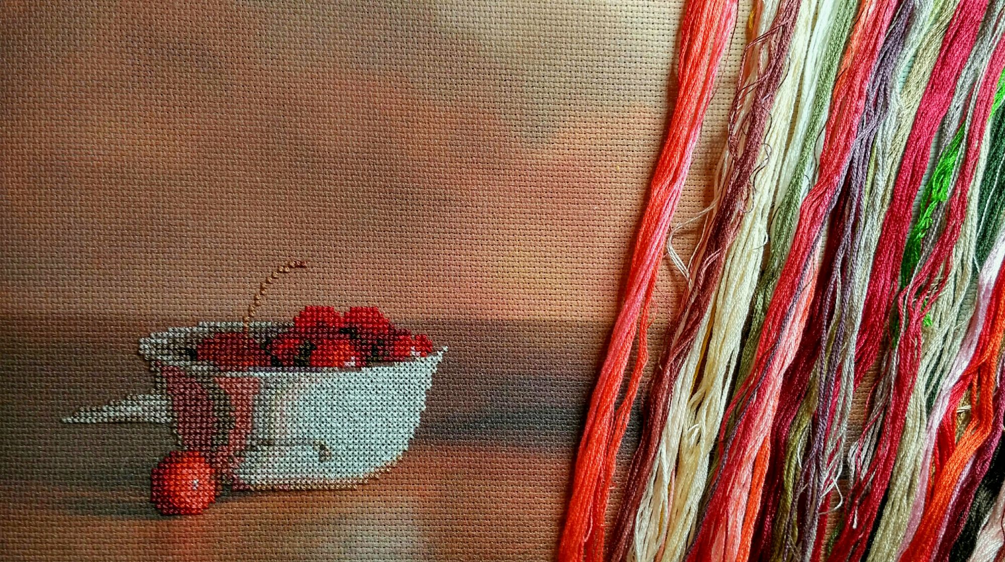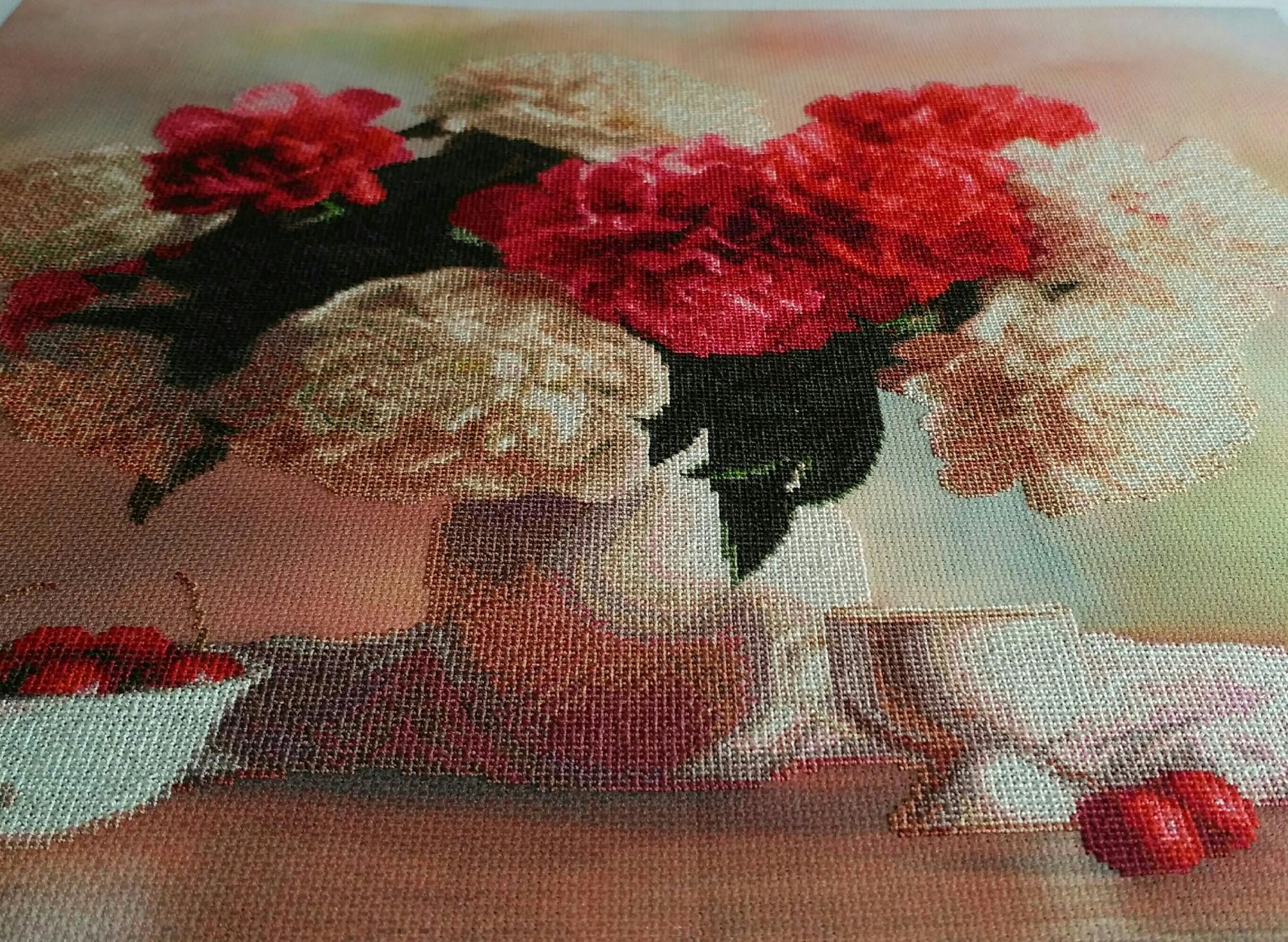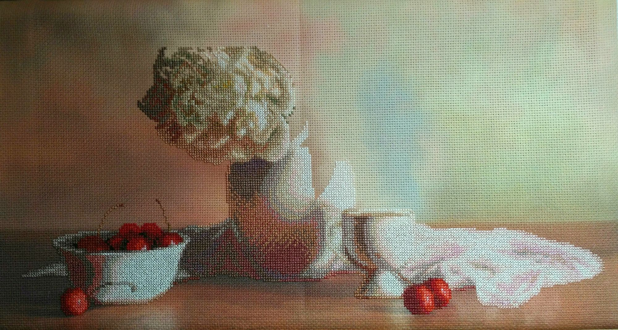 25 февраля 2017 На этой неделе начала свеженький процесс, Пионы и розы Юнона. Шикарный дизайн, мечтала о нем давно, купила в прошлом году, но руки дошли только сейчас. Первая моя работа на тонированное канве. Она необыкновенно красивого цвета. Ниточки тоже яркие блестящие, всего 66 цветов. Схема понятная на 6 листах А3.Сначала вышивать было непривычно, работа начинается от метки- кружочка внизу слева. Он находится в самом темном месте канвы, а я на такой никогда еще не вышивала. Пришлось привыкать, в дырочки не сразу попадала. Потом крестики получались какими-то не ровными, оказалось игла островата из набора, заменила и все пошло, как по маслу. Получается очень натурально! Вишенки такие выпуклые, глянцевые. А как продуманы отражения на тонированной канве от ягодки и чашки... Это ж чудо какое-то!!! Мой маленький результат за 5 дней. ЛАДОМИРА, Любушка1985, smarko75 и 3 других сказали спасибо Поделиться сообщением Ссылка на сообщение