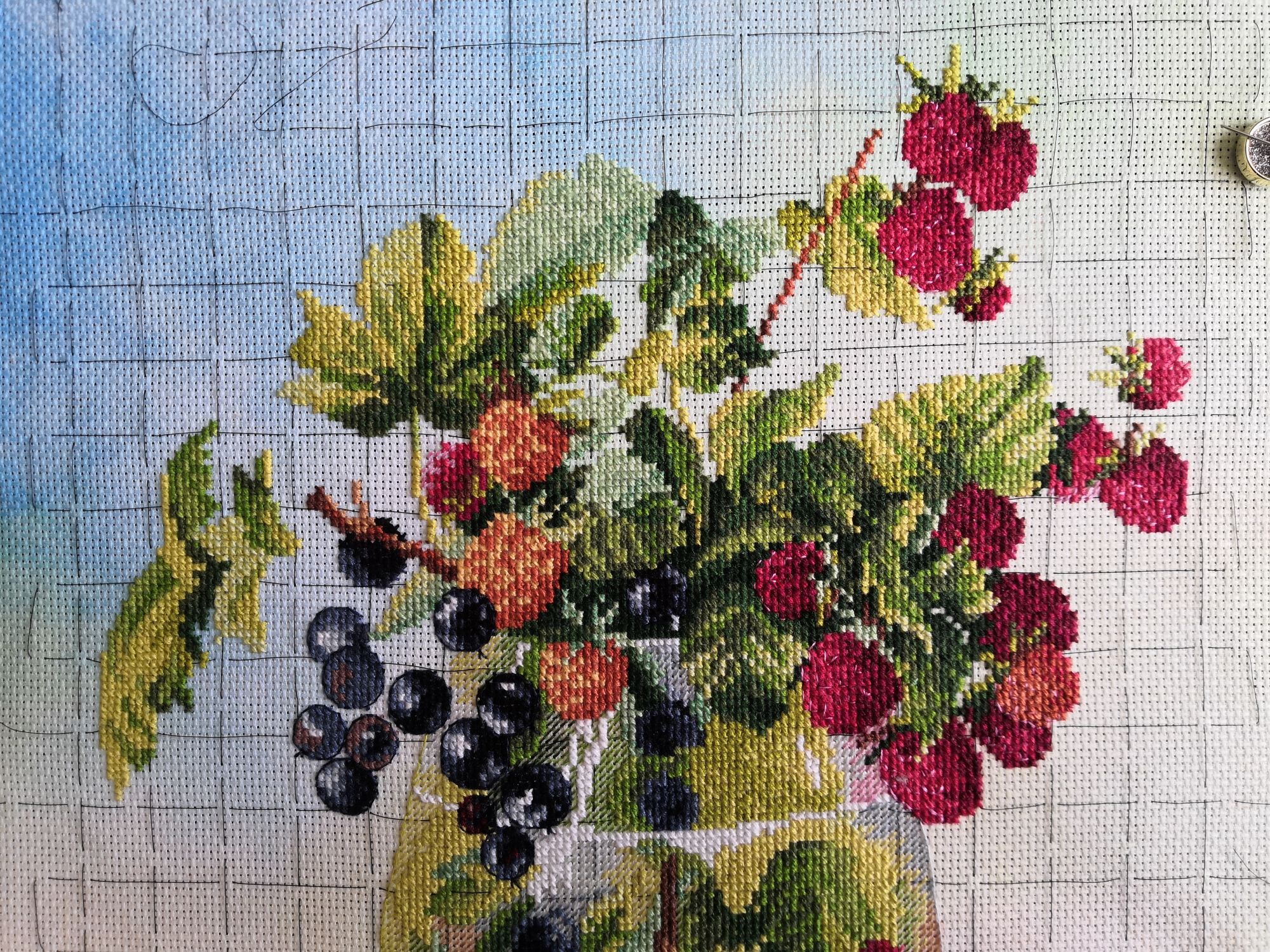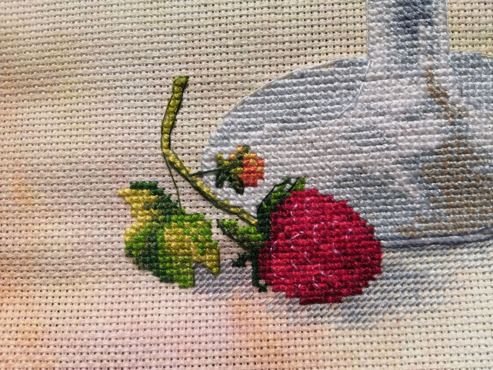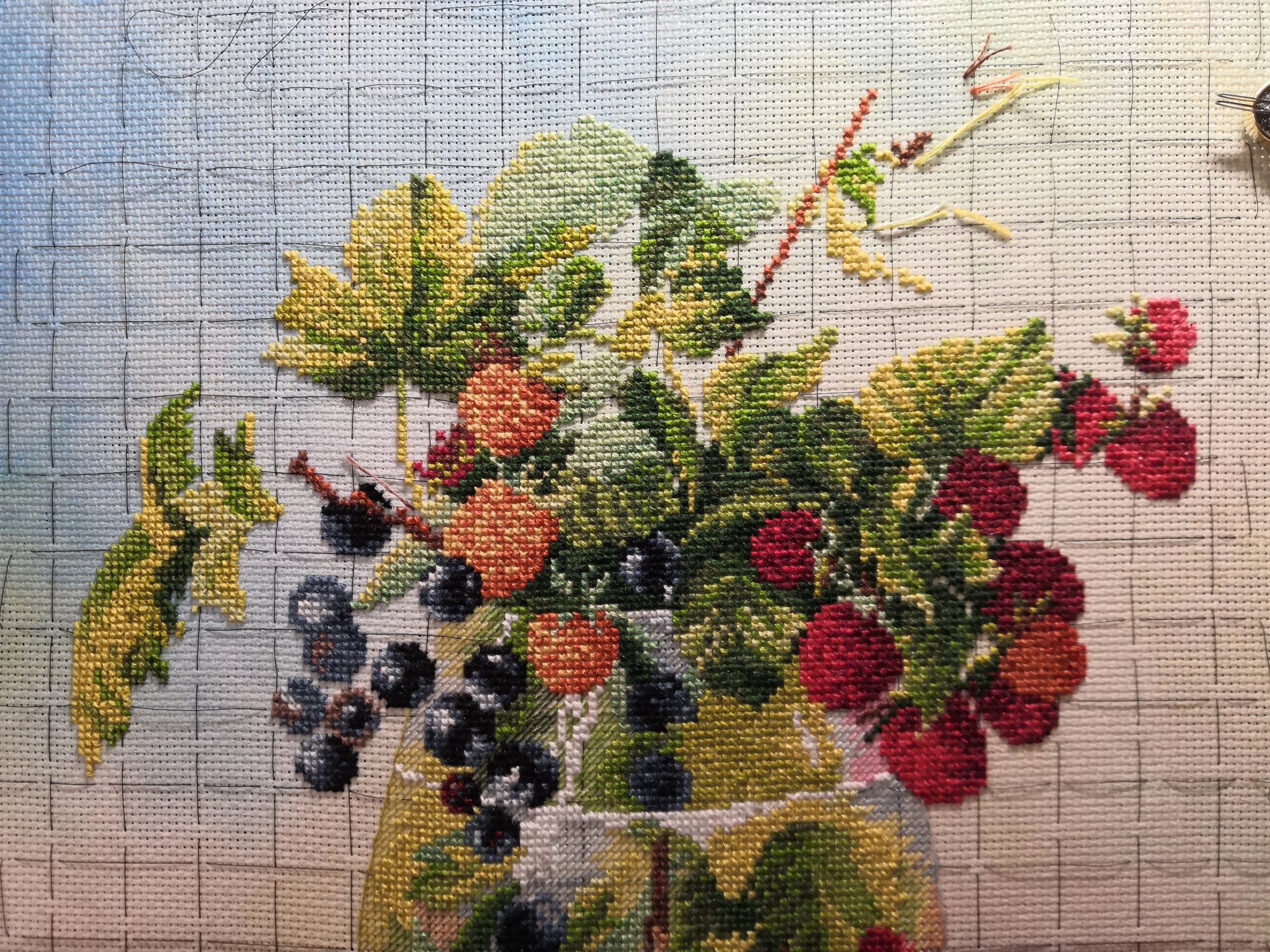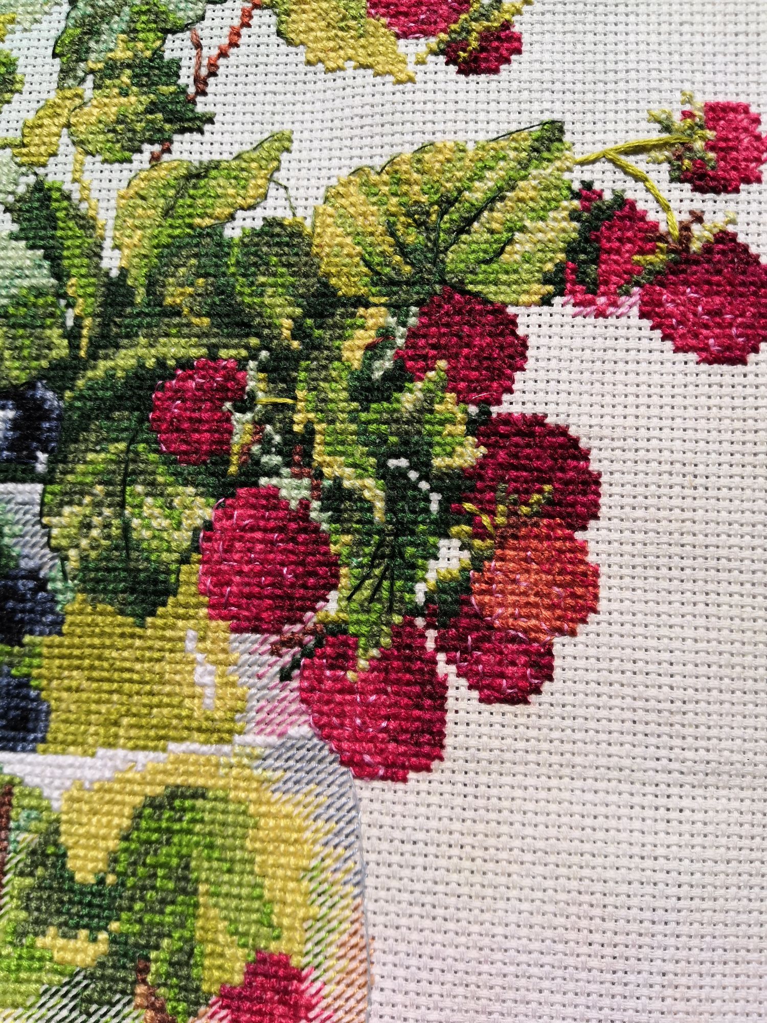 18 июля 2022 Всем привет! Мои небольшие продвижения. Эстэ вышито 25% Канва немного светится на темных участках, надеюсь на стирку, м.б. подсядет, не так будет заметно. Ловлю себя на мысли, что натюрмотр получается (или сейчас выглядит) каким-то бледноватым, не насыщенным по краскам. Ромашковый цвет пытаюсь продвинуть по максимуму. Выбираю цвета которые крестиком вышиваются. Надеюсь полукрест пойдет быстрее. Хозяйка смешных зверей, Ксен40, jenny064 и 1 другой сказали спасибо Поделиться сообщением Ссылка на сообщение