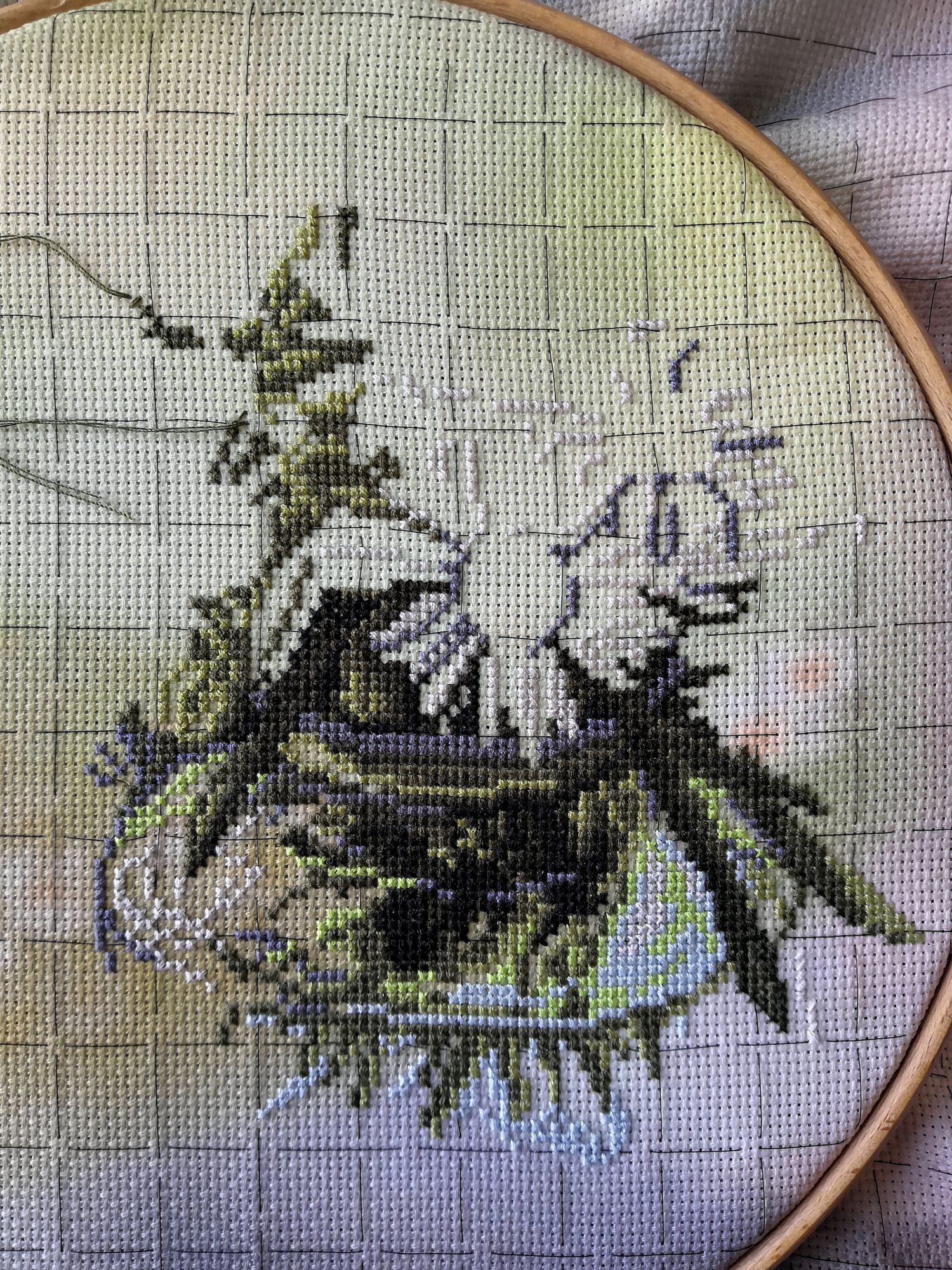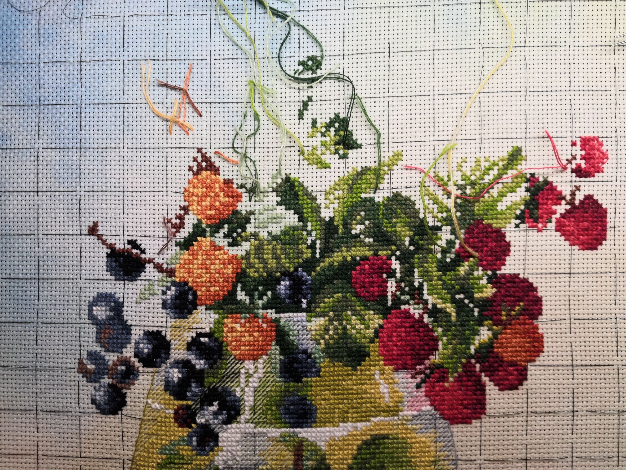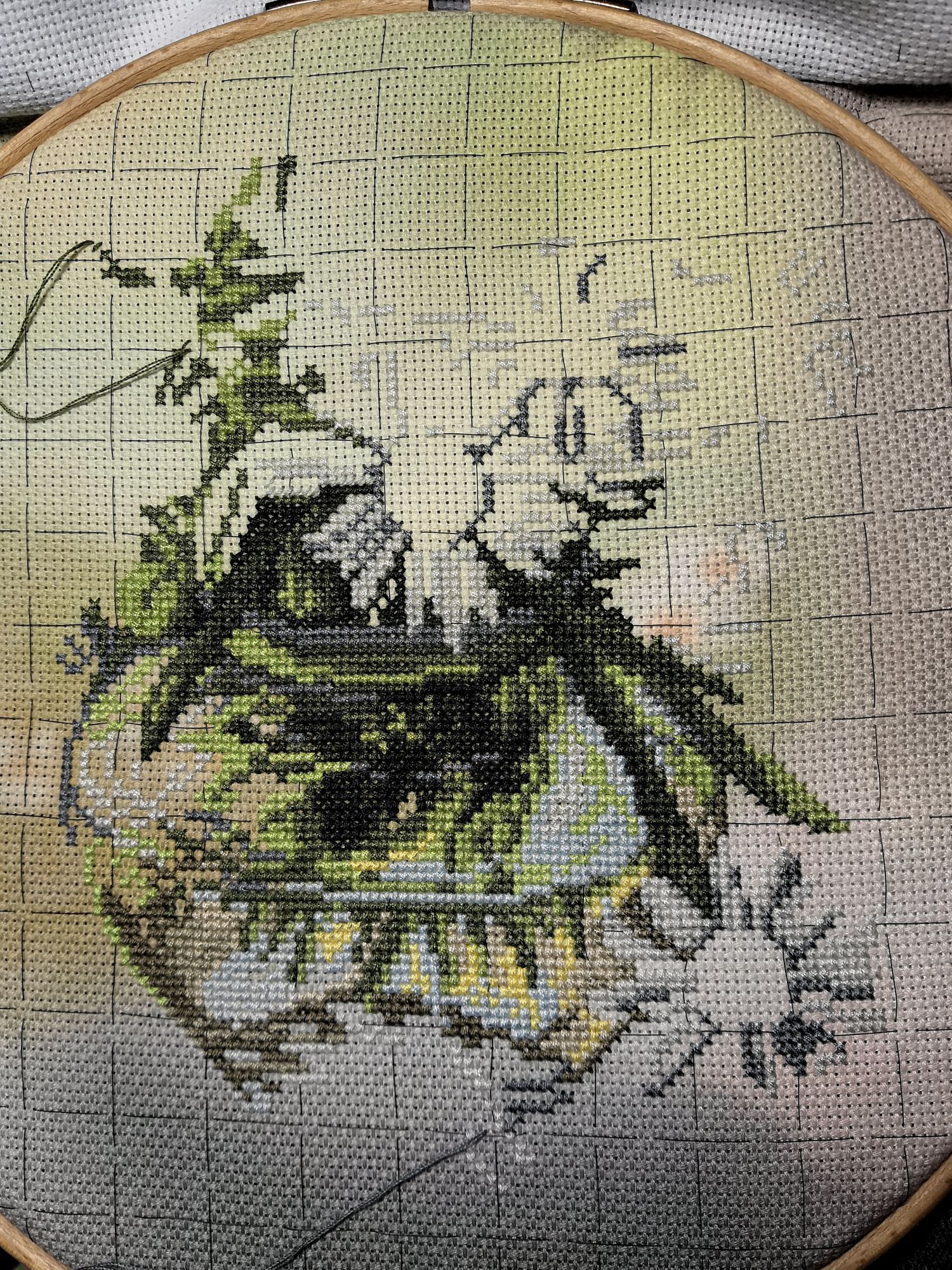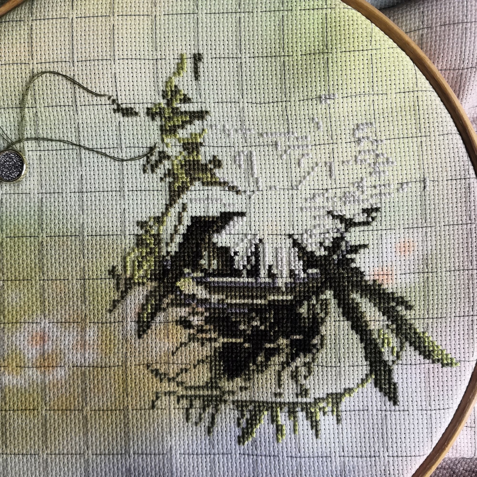 18 июля 2022 Всем привет! Мои небольшие продвижения. Эстэ вышито 25% Канва немного светится на темных участках, надеюсь на стирку, м.б. подсядет, не так будет заметно. Ловлю себя на мысли, что натюрмотр получается (или сейчас выглядит) каким-то бледноватым, не насыщенным по краскам. Ромашковый цвет пытаюсь продвинуть по максимуму. Выбираю цвета которые крестиком вышиваются. Надеюсь полукрест пойдет быстрее. Хозяйка смешных зверей, Ксен40, jenny064 и 1 другой сказали спасибо Поделиться сообщением Ссылка на сообщение