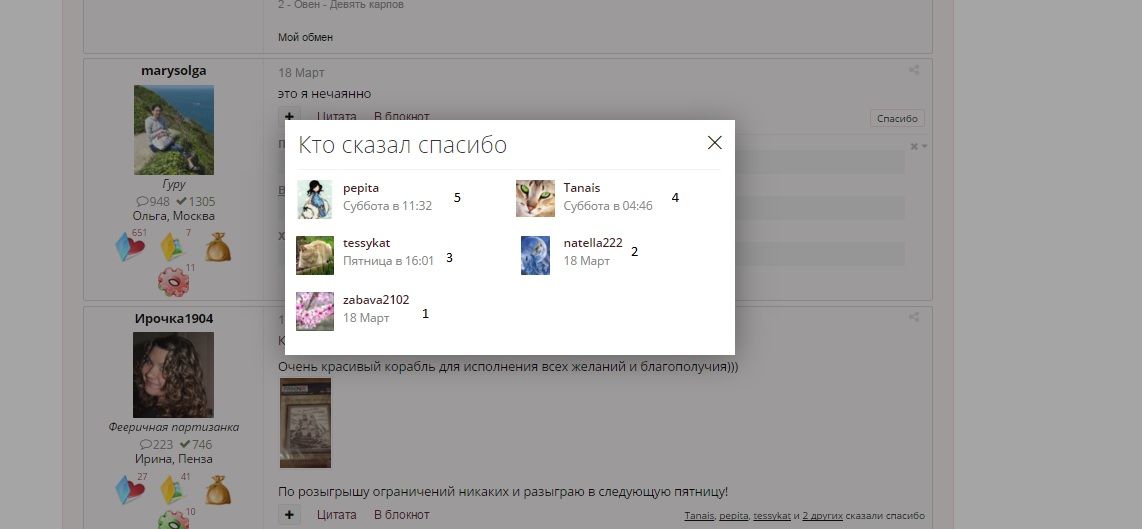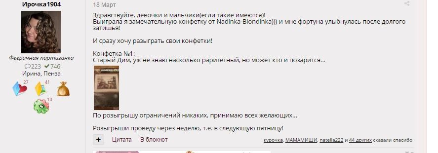 24 марта 2016 20 минуты назад, Shetka сказал: Привет, друзья) пришло время разыграть конфетки Ничего лучше коробки от печенек не нашли итааакк)) Желание изъявили 10 человек Победителем объявляется.... Rumba Инна, жду адресок в личку! Вот это мне повезло! Огромное спасибо!!! Как я рада Пойду думать, чем порадовать в ответ )) Камма80, belyasik, Molly21 и 7 других сказали спасибо Поделиться сообщением Ссылка на сообщение