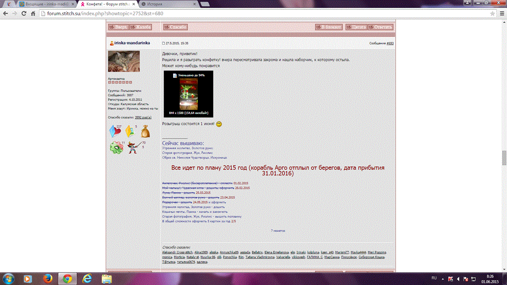 1 июня 2015 вторая конфета, вот такой наборчик в алмазной технике розыгрыш будет 9 июня Elena Emelianova, Маняша, Dominoluiza и 42 других сказали спасибо Поделиться сообщением Ссылка на сообщение