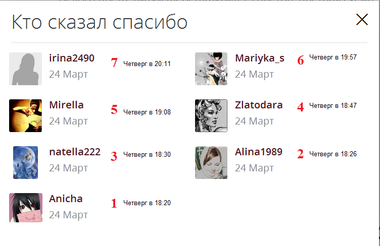 31 марта 2016 В 31.03.2016 at 20:39, Сэйко сказал: Позволь человеку поправить собстнную карму Оля, только про свою карму подумала, что пора поправить, ты тут пишешь))) Shetka, Сэйко и marysolga сказали спасибо Поделиться сообщением Ссылка на сообщение