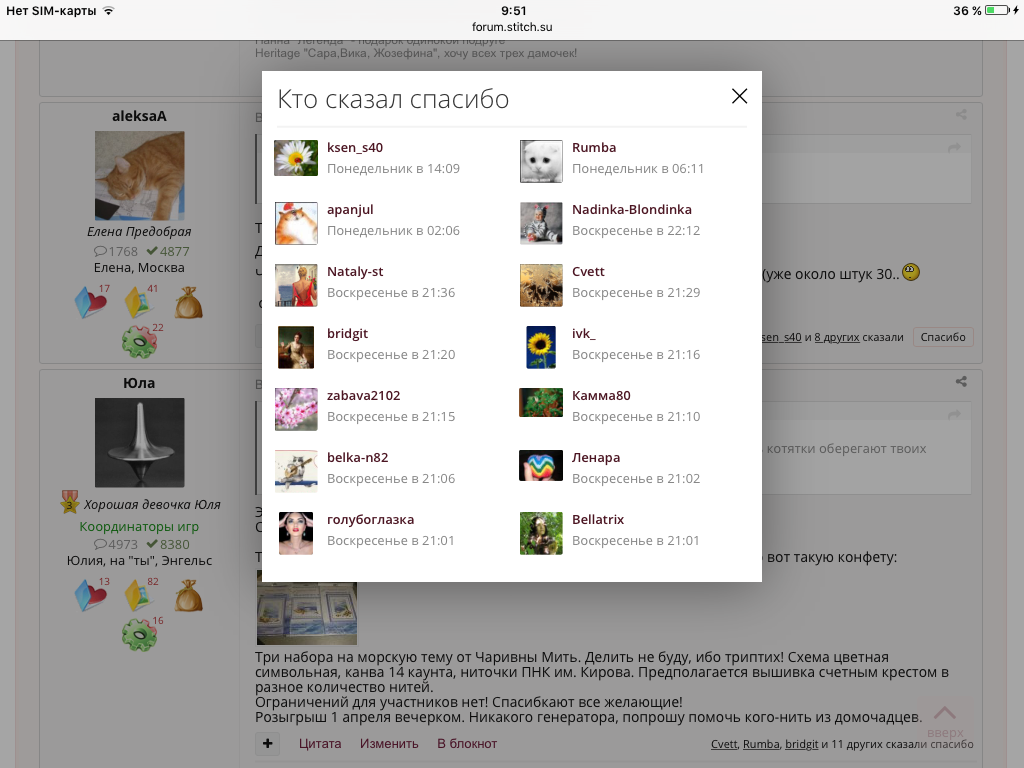 1 апреля 2016 О!!!! Юля, спасибо большое!!!!! Очень люблю морские сюжеты!!!!! И на эти давно смотрела, но у нас с вышивкой крестиком от ЧМ вообще в городе глухо!!!!!!!! Даже хотела их обменять, но предложить не нашла что.... Вторая конфетка за этот год!!!! Видимо, хоть в чем то он у меня удачный, а то я на обезьяну уже грешить и ворчать начала. Уже сделала инспекцию и отобрала наборы, которые разыграю. Пока тут и так ажиотаж, поэтому ответную конфетку выставалю на следующей неделе!! ЛАДОМИРА, Molly21, ssavvina и 9 других сказали спасибо Поделиться сообщением Ссылка на сообщение