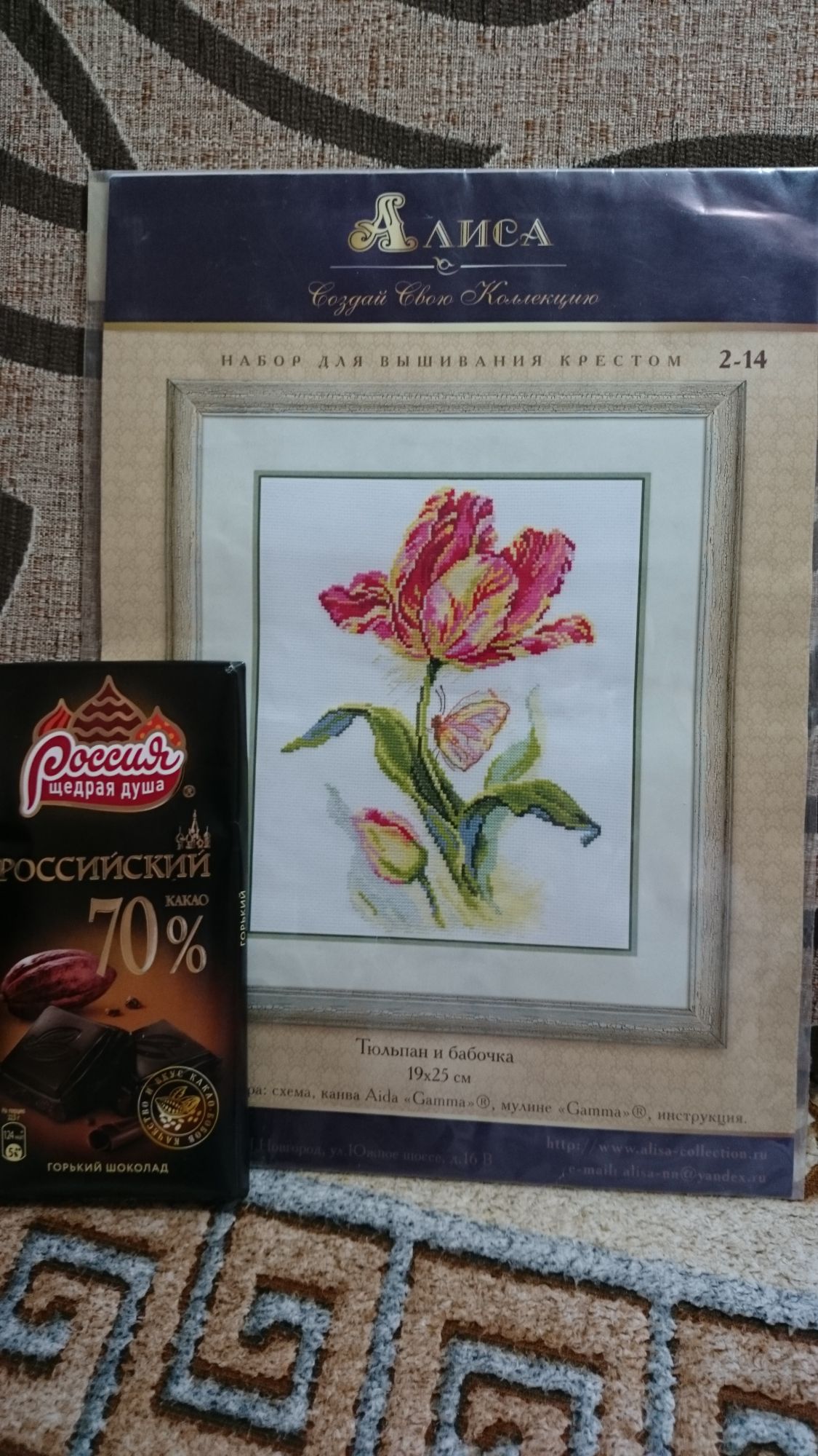 15 апреля 2016 Решила не откладывать в долгий ящик ответную конфетку. Это авторская схема Евгении Колесниковой (http://vk.com/kolesnikova041930 ) "Тюльпаны"( Размер 140х189 крестиков Палитра DMC 41 цвет (17 блендов) Полный крест, полукрест, бэкстич, фр.узелок) Ограничений нет. Схему автор вышлет победителю сам. VitaVivien, elena_kostar, Taisiya и 14 других сказали спасибо Поделиться сообщением Ссылка на сообщение