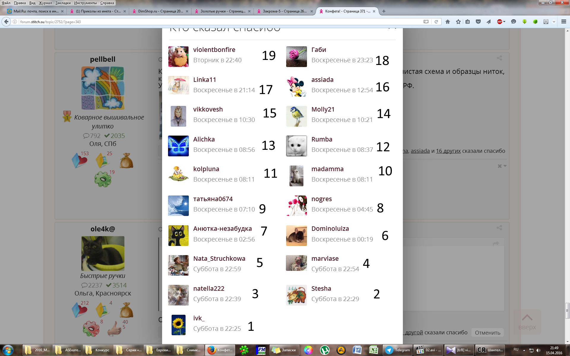 15 апреля 2016 Пришло время разыграть свои конфетки Во всех трех случаях пронумеровала участников по времени спасибо и попросила трех друзей назвать по одному числу в заданном диапазоне. 1. Набор от Новой Слободы "Луна на смычке" №3 Dominoluiza 2. Остатки от набора A dictionary of tea №7 masha-vyshivasha 3. Остатки от набора Dimensions №17 Linka11 От всей души поздравляю и жду адреса в личку!!! ЛюдмилаЕр, Ксен40, Linka11 и 57 других сказали спасибо Поделиться сообщением Ссылка на сообщение